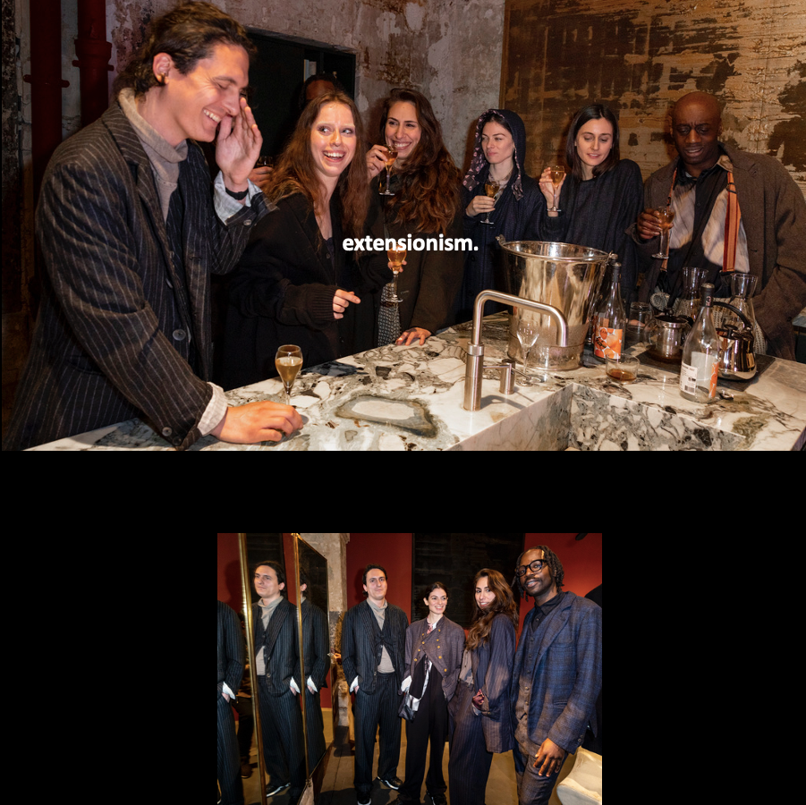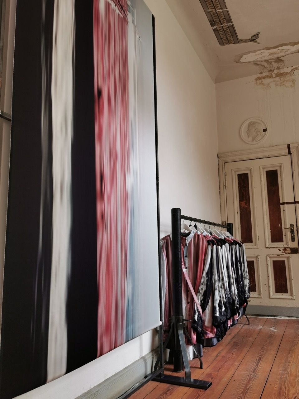 In March 2024, a special presentation of “extensionism” in Paris soon followed inside the legendary Leclaireur Hérold design spaces during Paris fashion week. The dynamic GBS “Extensionism at Leclaireur Hérold” 3-day exhibition in Paris was specially installed by GBS architect Davide Gabriele and set designer Giovanna Baseggio in collaboration with Nathalie Blanchet and Armand & Martine Hadida to integrate the all-new advanced research collection and a 5 meter double-faced pure Italian silk 16 momme raso satin exclusive print wall hanging piece made for us by the Brenna family in Como- seamslessly with unique table and sculpture works by Pia Manu and a rare white version of Zaha Hadid’s La Moraine sofa from the space’s extensive design collection.