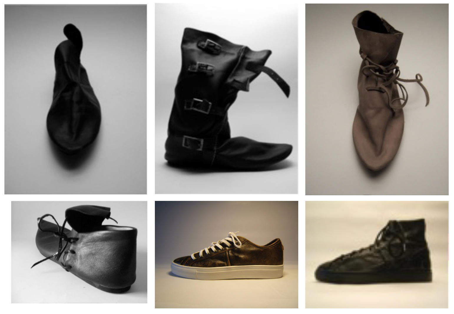 Handmade medieval reproduction shoe designs from Rebesco and Small's first collaboration (top row) the radical medieval style GBS collection "Back to the Future" that was presented in Paris in October 2006. The handmade 14th century reproduction “Poulaine” medieval shoe from the Paris January 2007 collection "Classe Dirigeante is a true technical and artistic masterpiece (lower left image). LUZ06/8 the world’s first handmade sustainable recycle leather rubber sole trainer shoe. Presented in Paris in 2009 as part of the designer’s revolutionary first fully- sustainable design wardrobe concept in the industry, it remains today over a decadd and a half later- one of the finest examples of long-term sustainable, ethically-produced and ecologically-sound shoes anywhere (lower right images).