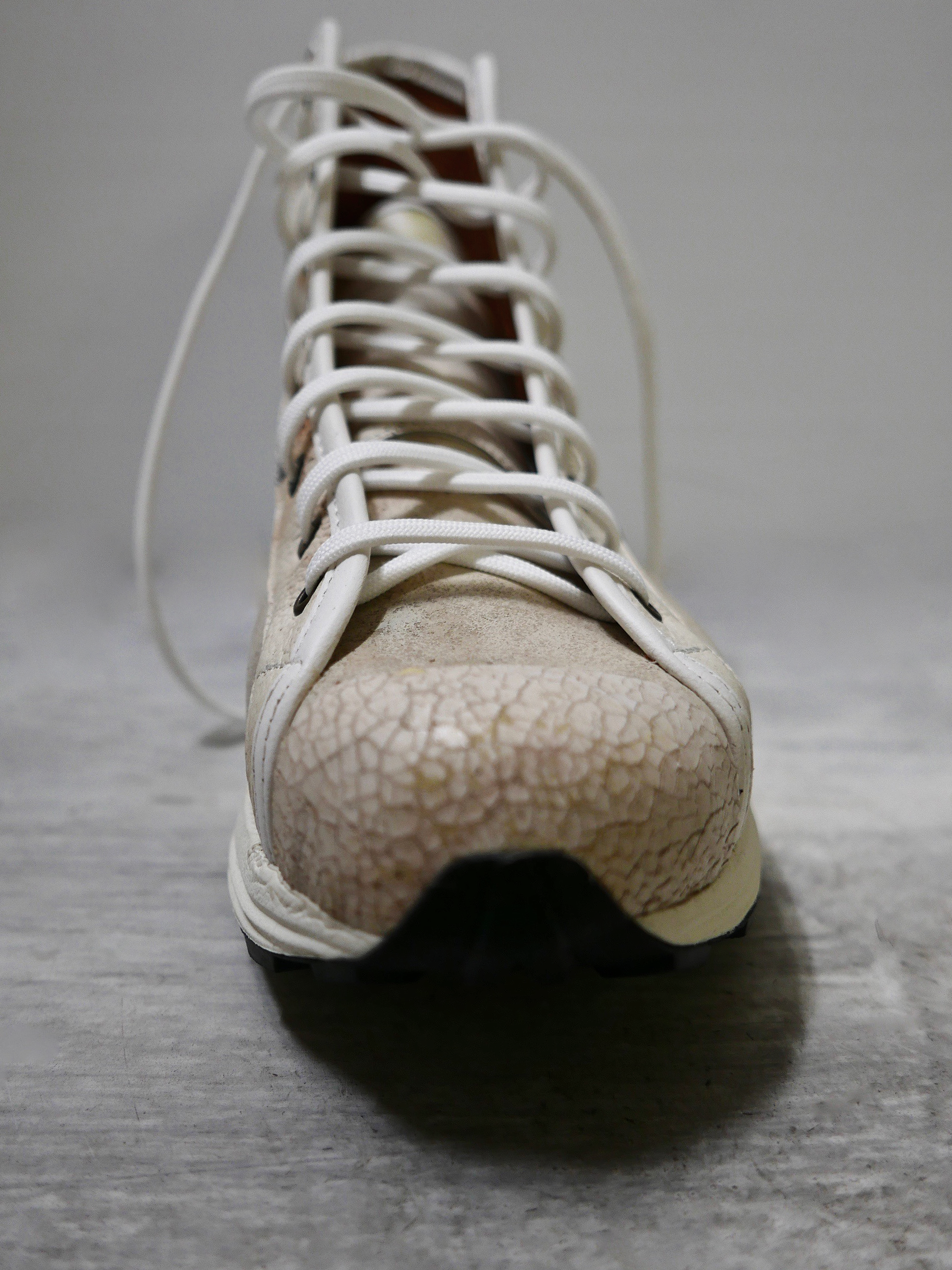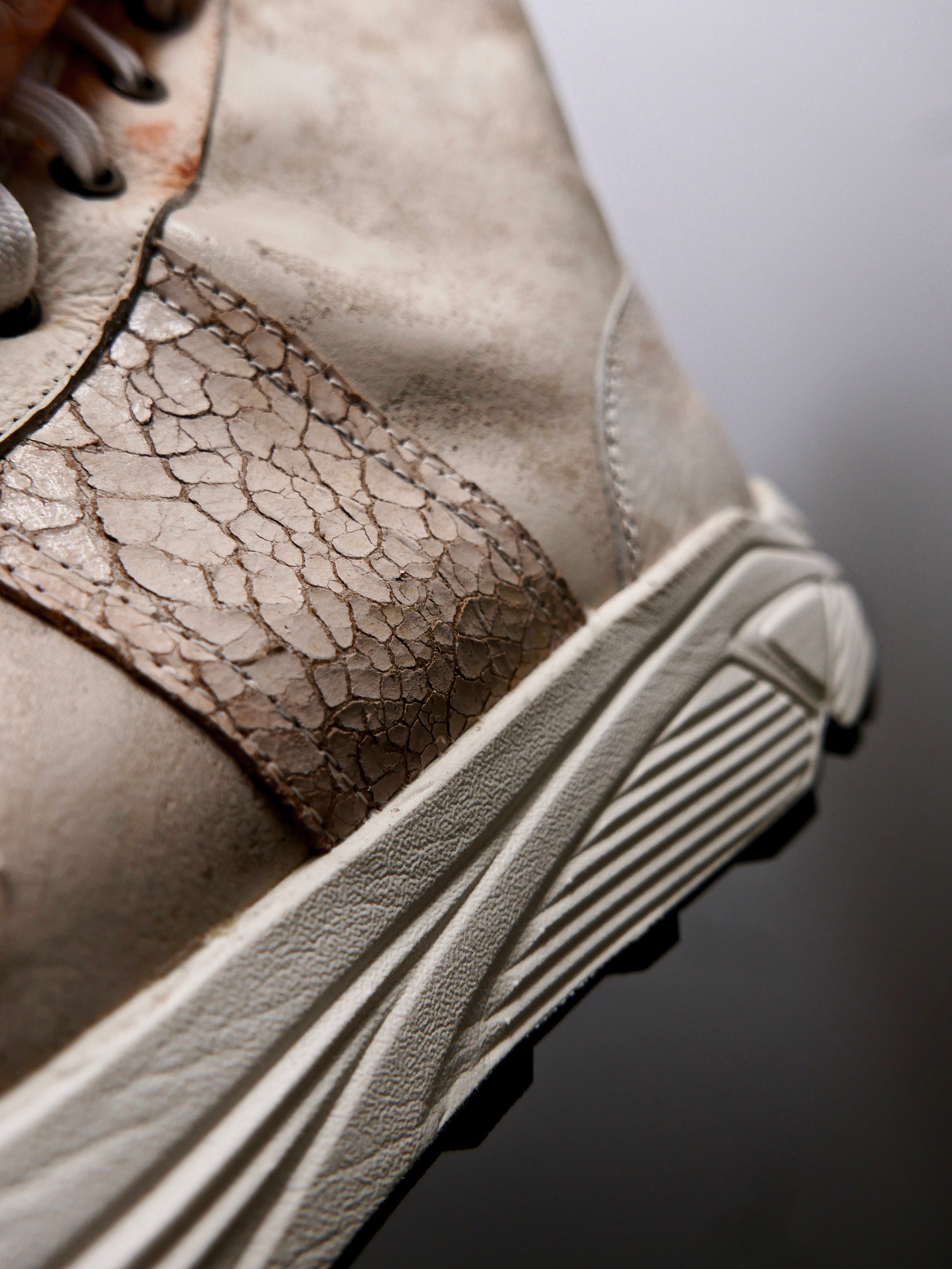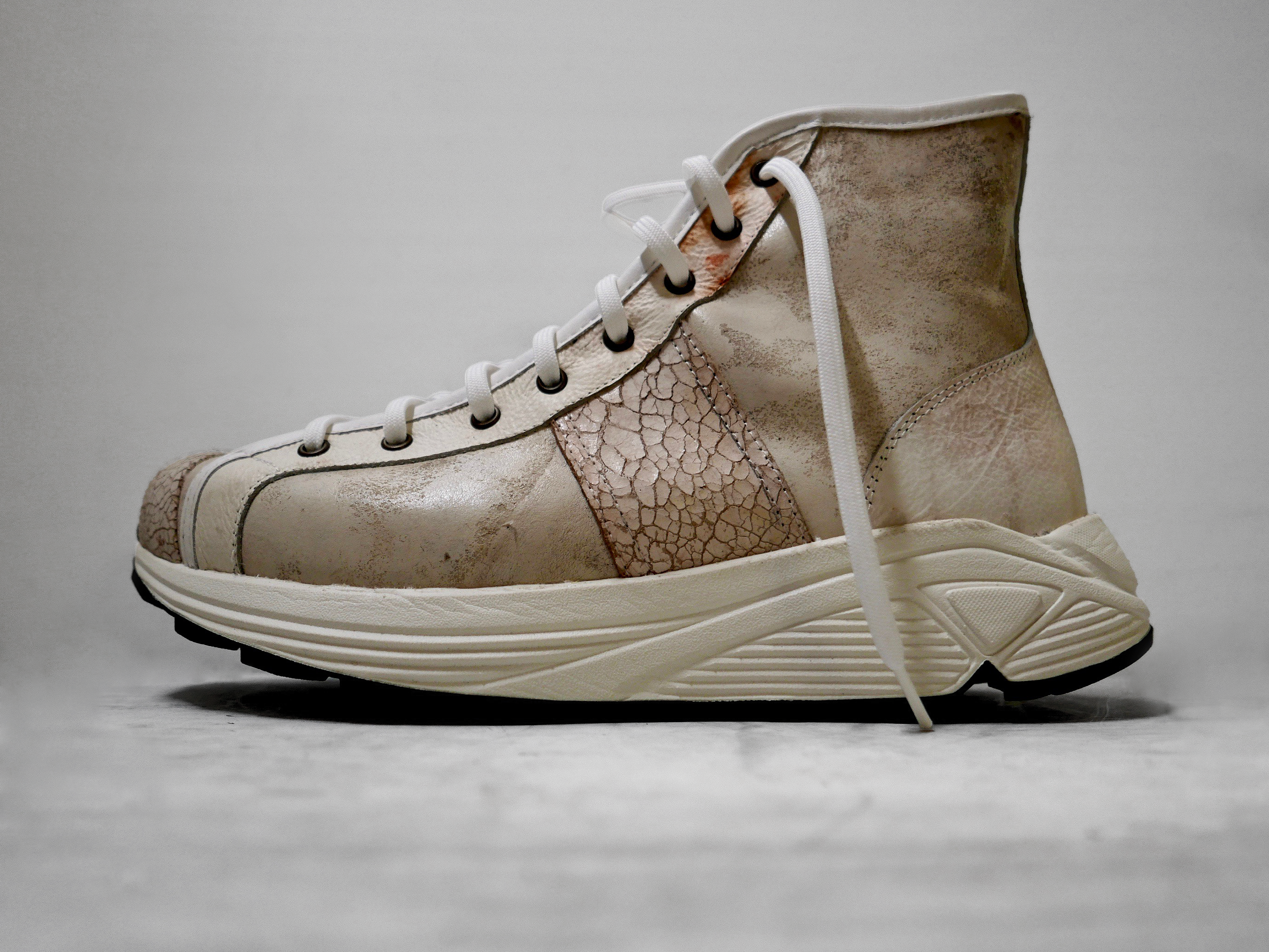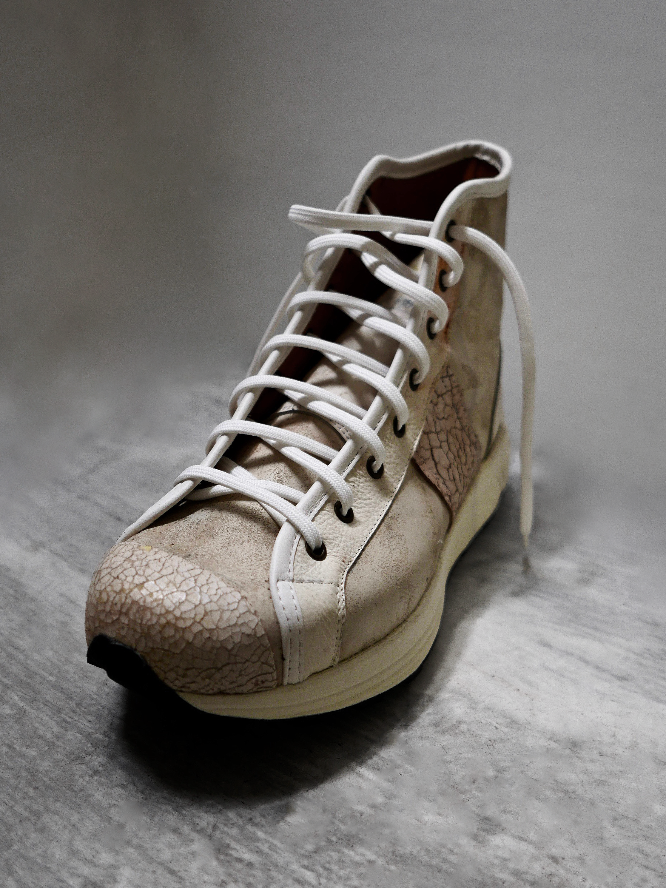 THIS special white recycle GBS Evolution IV super limited edition CLZ01 handmade high-top advanced trainer shoe design reduces environmental impact and helps fight global plastic and plastic microfiber contamination of the world's land and water. It is one of only 3 pairs currently being made by hand in the entire world, each created exclusively for Darklands in Berlin, using authentic recycled vintage garment leathers carefully selected from our recycling research, luxurious special Italian calfskin lined interiors, advanced technology natural ultra long-lasting Michelin rubber Vibram Rollingait system soles, and a classic American 1940’s hi-top basketball sneaker design upper. Each item is unique one-of-a-kind. The shoe was cut and constructed individually by hand in the town of San Zenone degli Ezzelini by Giuseppe Rebesco respecting a 15-year long collaboration of special artisanal shoe design and creation with Geoffrey B. Small and is handsigned individually by the designer. The shoes also come with two sets of different laces including a top quality all natural Italian linen laces with metal tips and a special handmade limited edition box created by the 82-year master boxmaker Giuseppe Salmaso in Piove di Sacco, Padova exclusively for GBS Evolution 2021.