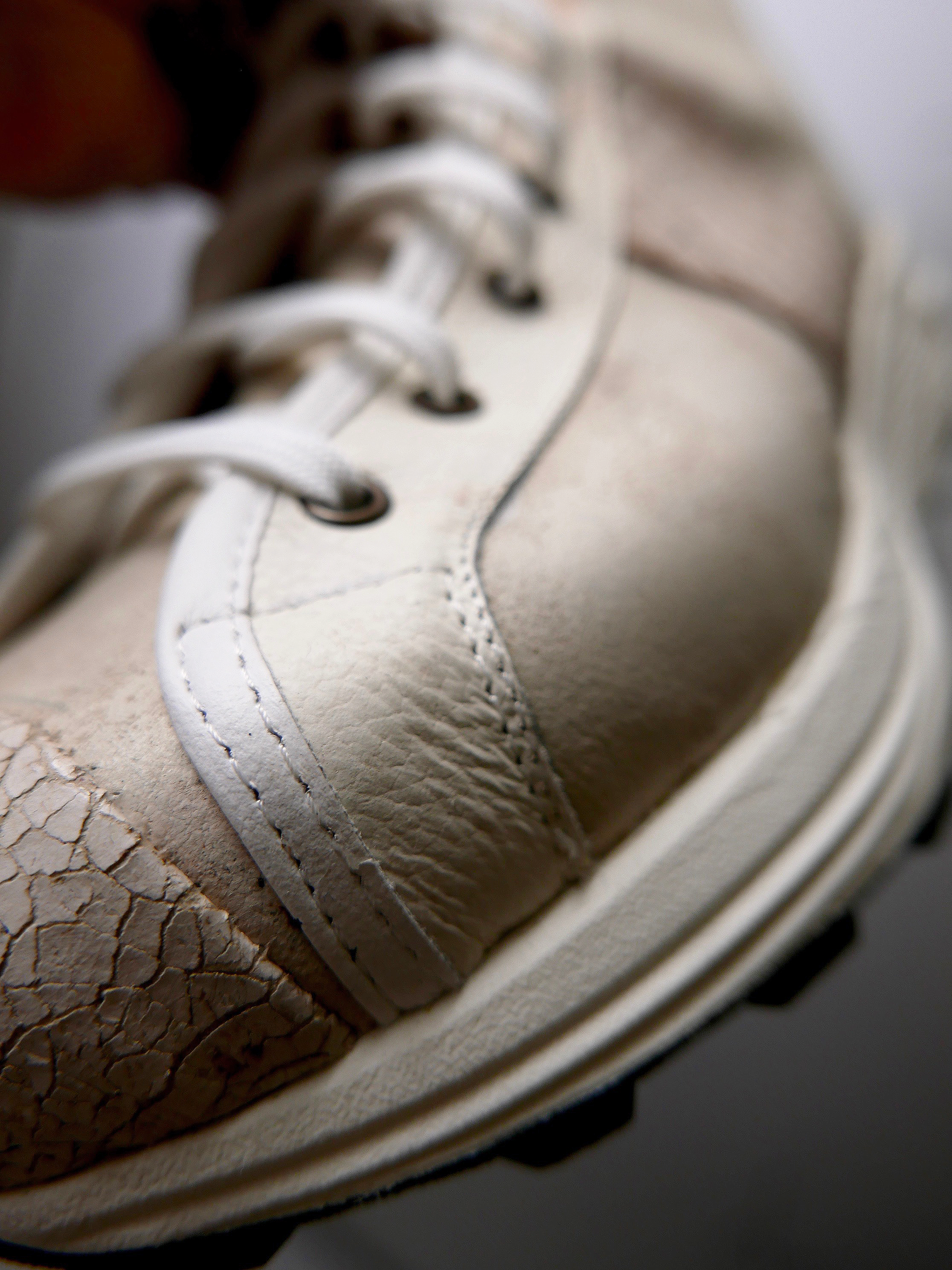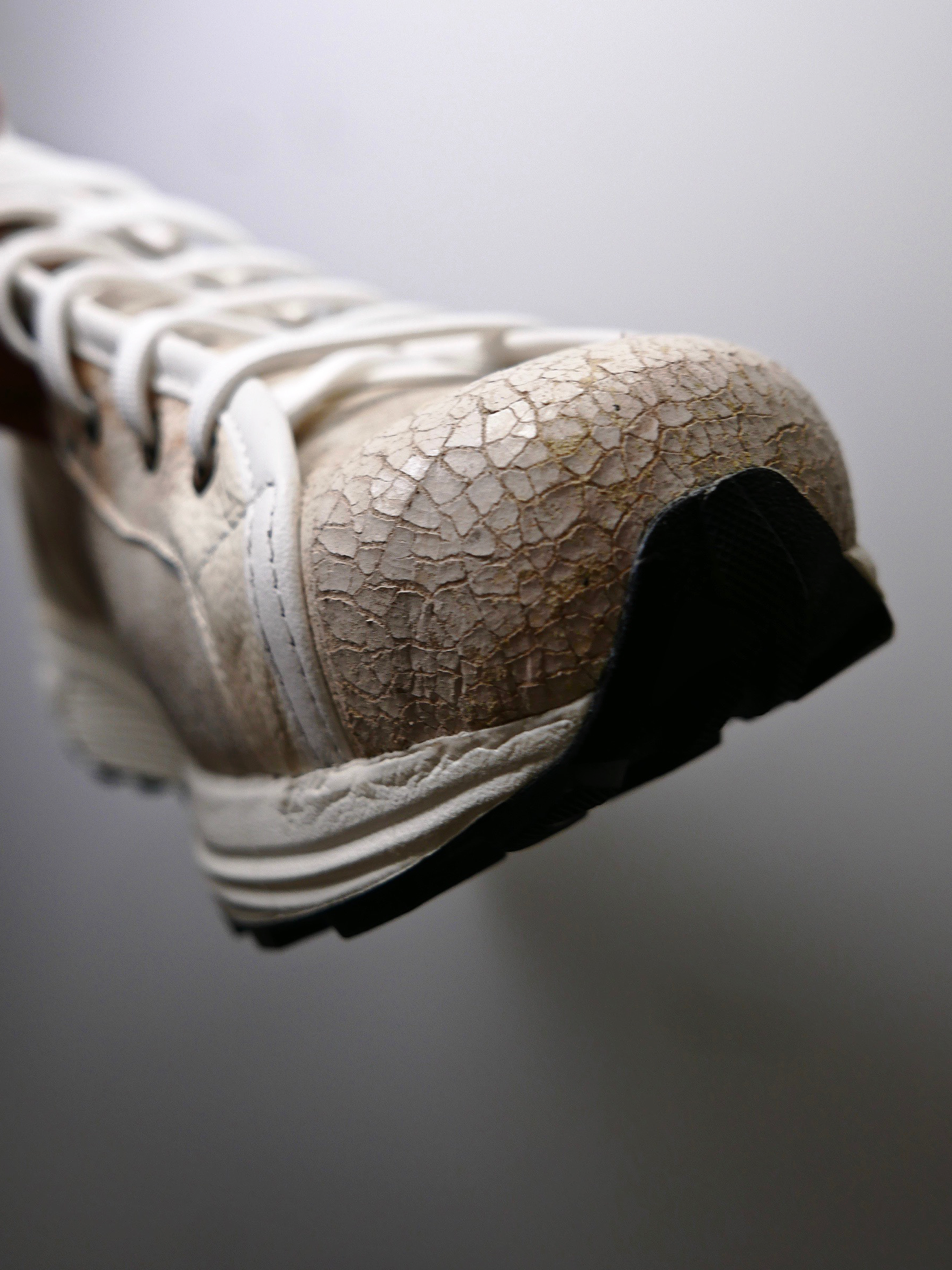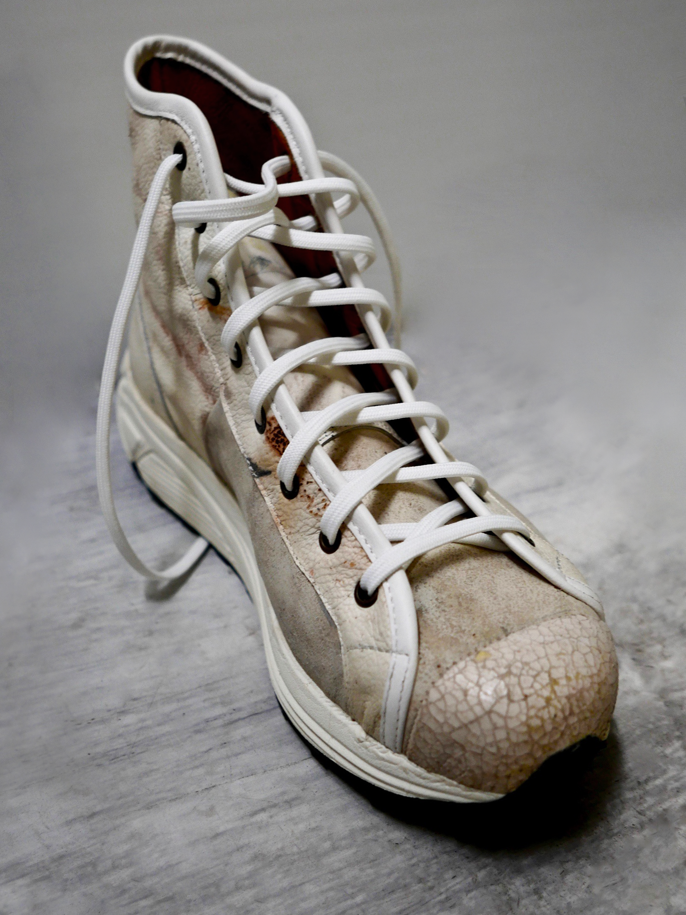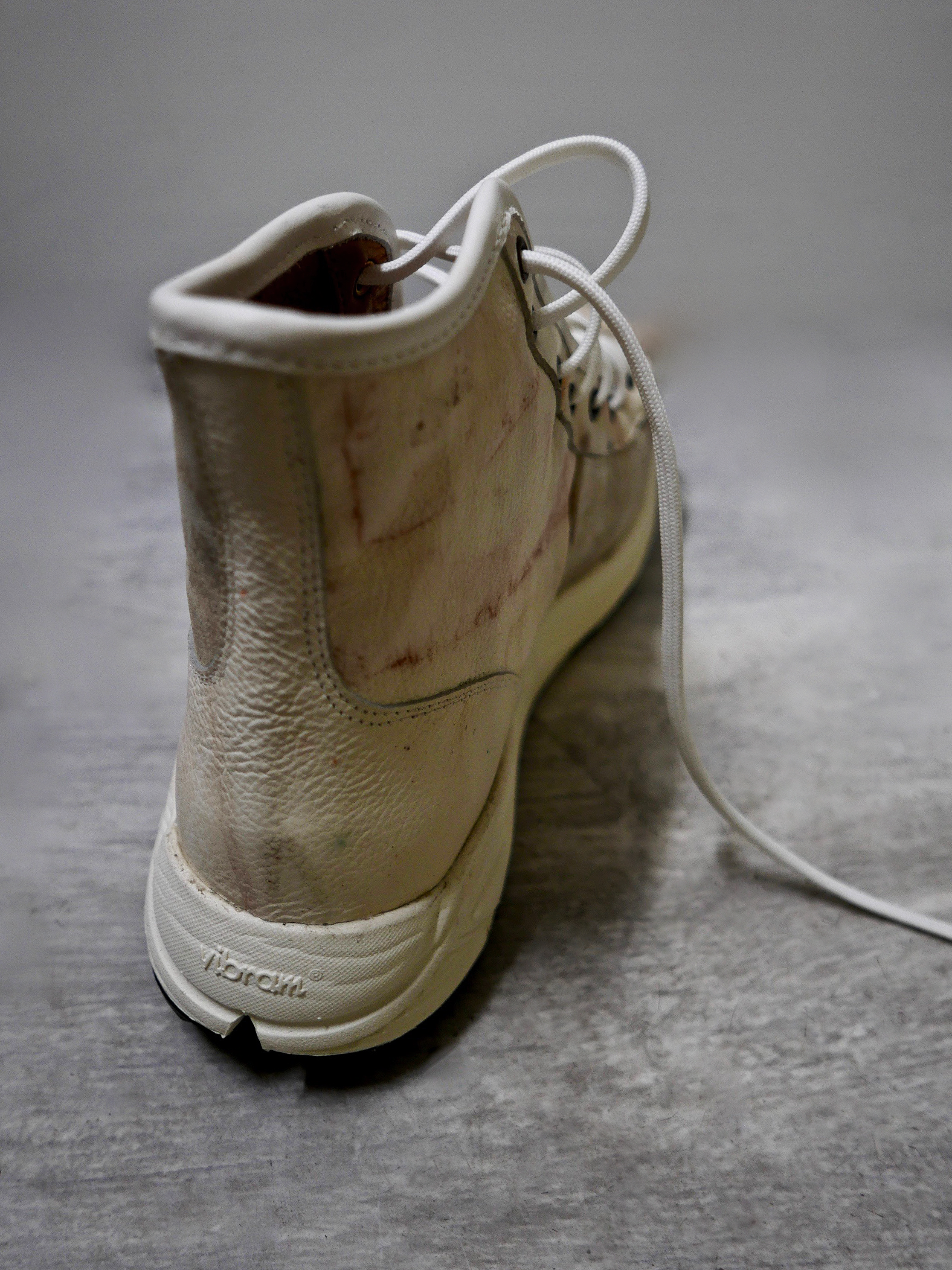 THIS special white recycle GBS Evolution IV super limited edition CLZ01 handmade high-top advanced trainer shoe design reduces environmental impact and helps fight global plastic and plastic microfiber contamination of the world's land and water. It is one of only 3 pairs currently being made by hand in the entire world, each created exclusively for Darklands in Berlin, using authentic recycled vintage garment leathers carefully selected from our recycling research, luxurious special Italian calfskin lined interiors, advanced technology natural ultra long-lasting Michelin rubber Vibram Rollingait system soles, and a classic American 1940’s hi-top basketball sneaker design upper. Each item is unique one-of-a-kind. The shoe was cut and constructed individually by hand in the town of San Zenone degli Ezzelini by Giuseppe Rebesco respecting a 15-year long collaboration of special artisanal shoe design and creation with Geoffrey B. Small and is handsigned individually by the designer. The shoes also come with two sets of different laces including a top quality all natural Italian linen laces with metal tips and a special handmade limited edition box created by the 82-year master boxmaker Giuseppe Salmaso in Piove di Sacco, Padova exclusively for GBS Evolution 2021.