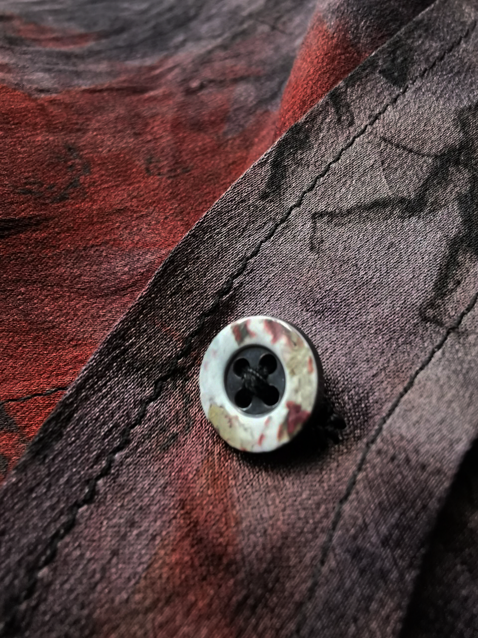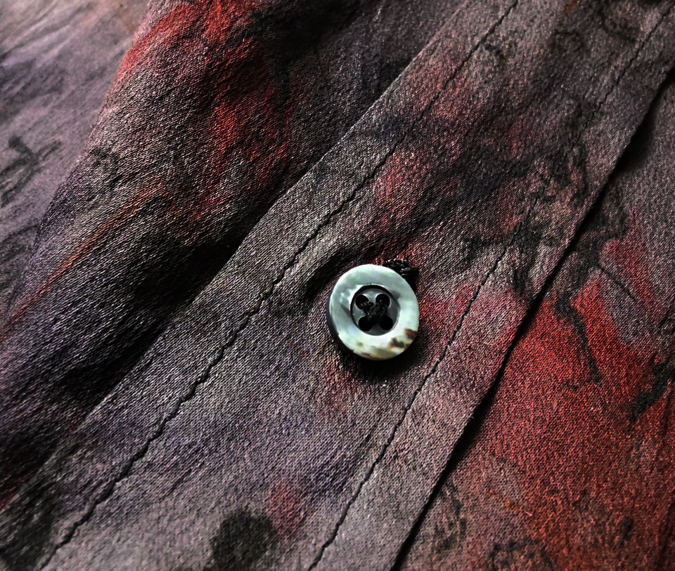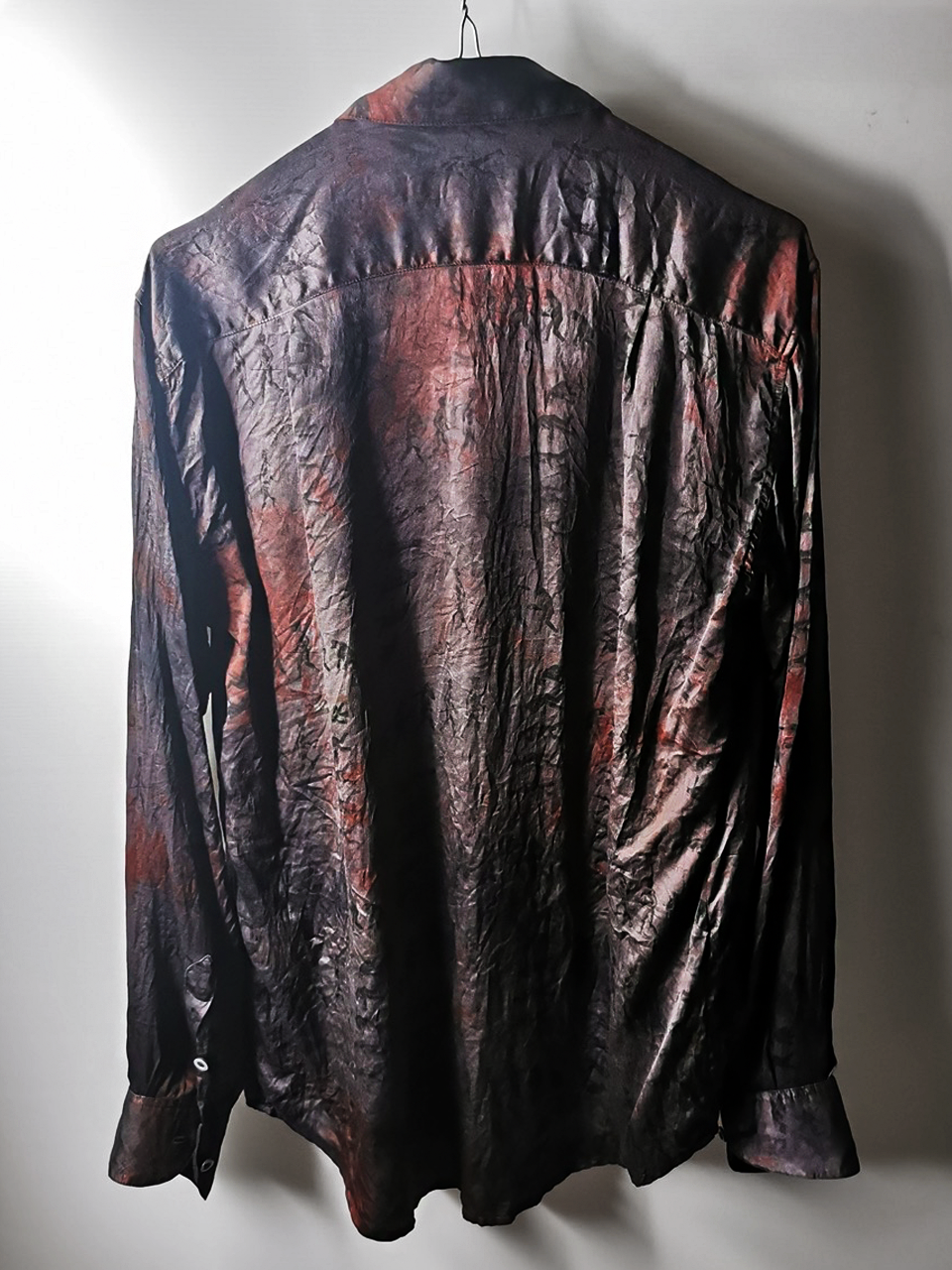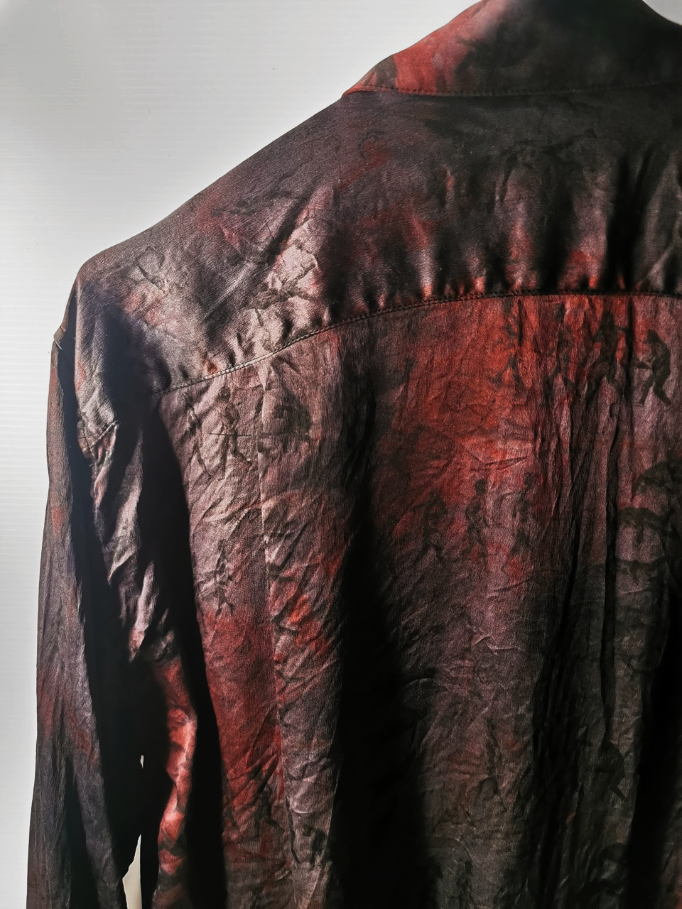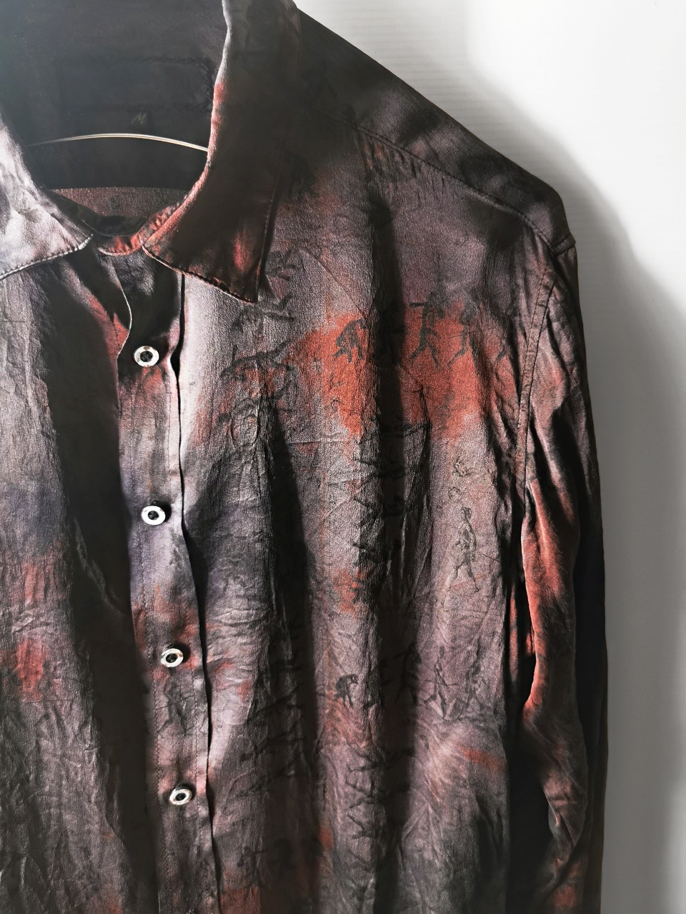 THIS special of the super limited edition RNS12 handmade shirt design is one of only 7 pieces made by hand exclusively for Darklands in Berlin. It was created by hand using an intriguing pure silk 16 momme raso satin “Evolution Man” print design created exclusively for us by the legendary Brenna family in Como Italy, the world's leading center for fine silk fabric creation, and features a classic European tailored men’s shirt cut and design, real mother-of-pearl buttons made for us by the Lanzanova family of pearl button specialists in Brescia, and no less than 12 of our signature real hand sewn buttonholes in luxurious pure silk Bozzolo Milano Seta Reale threads (which required at least 10-12 minutes to create each one). The piece was then specially multiple GBS “Accident dyed” by hand with a stunning story of red and grey tones in our studios using multiple applications of our latest advanced artisanal dye processes to achieve its unique colors, mottled patina effects and softness… and features our world leading pure silk hand dyed label created exclusively for us by Mion SpA in Torreglia which is the first label in the luxury industry to completely eliminate plastic polyester yarns in it--beautifully attached all by hand using pure silk threads. Variations in color and color density are not imperfections or irregularities, but specific characteristics of the special fabric, and hand making and dyeing techniques. Please treat buttons and buttonholes with care. We recommend professional clean only or hand wash cold water and protecting buttons with foil or plastic wrap when washing. Do not put in washing machine or machine dryer.