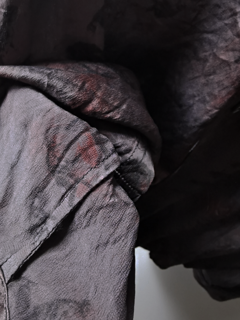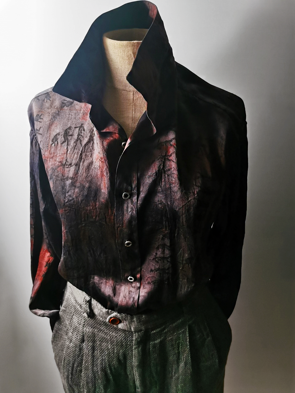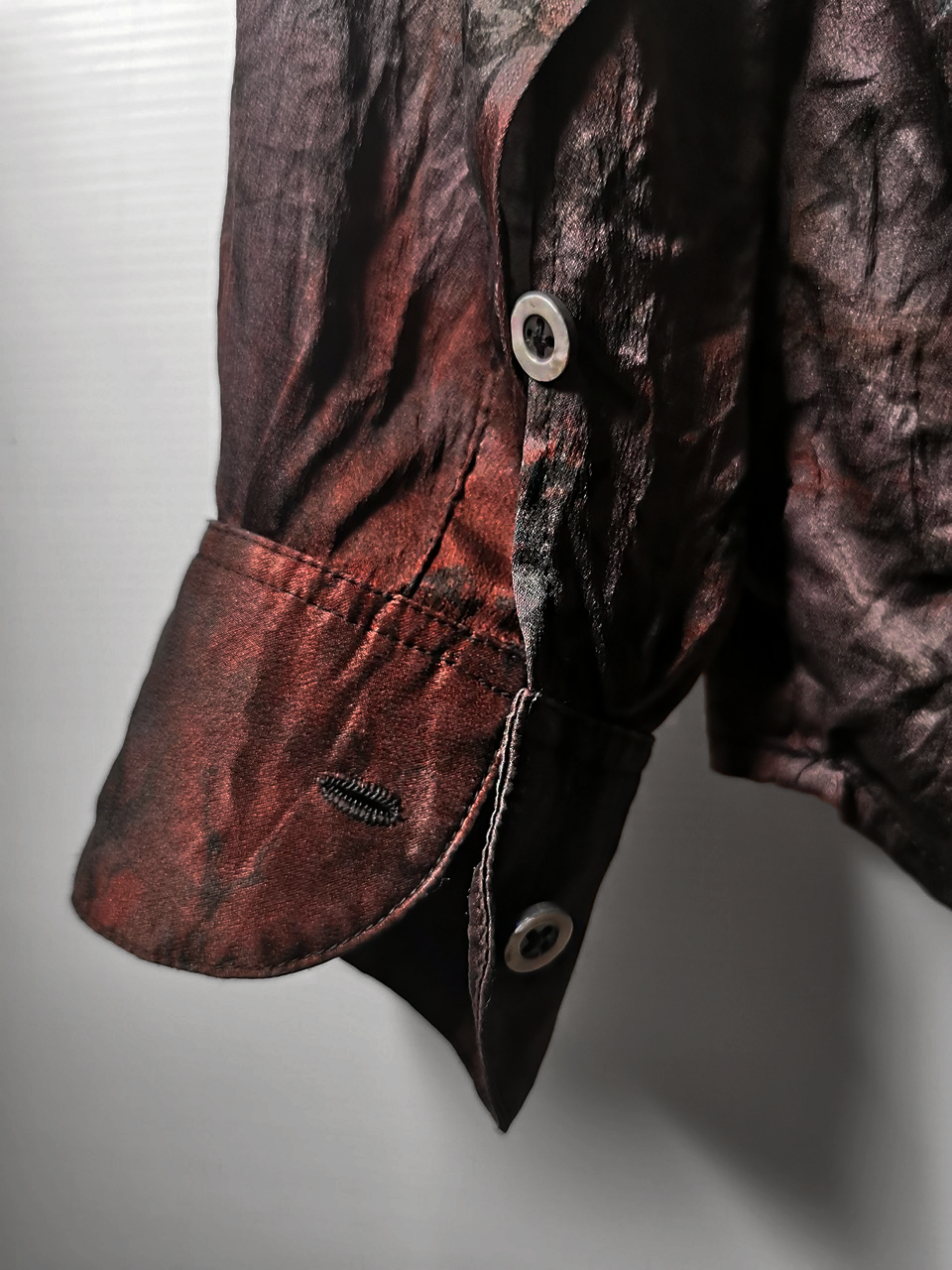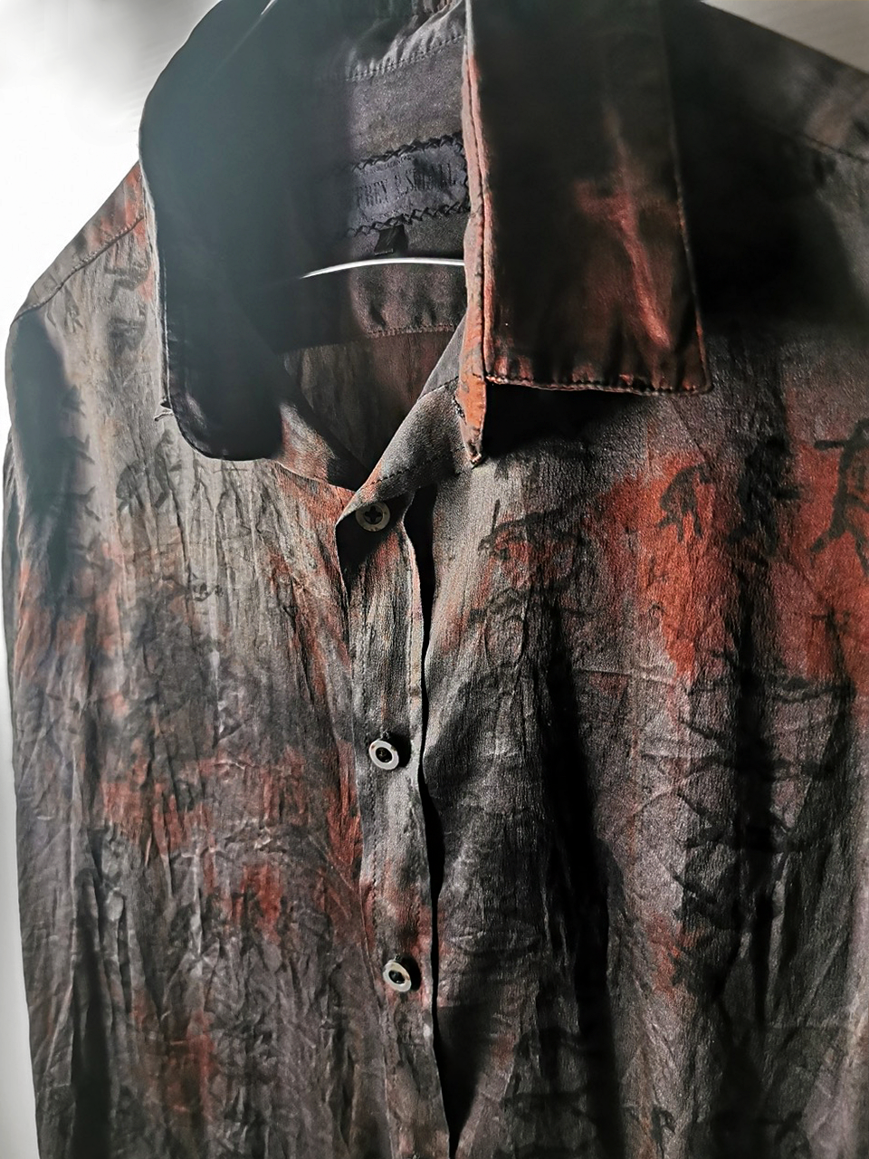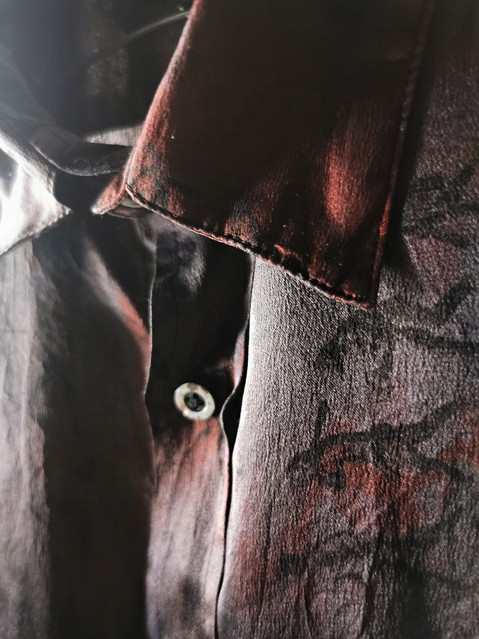 THIS special of the super limited edition RNS12 handmade shirt design is one of only 7 pieces made by hand exclusively for Darklands in Berlin. It was created by hand using an intriguing pure silk 16 momme raso satin “Evolution Man” print design created exclusively for us by the legendary Brenna family in Como Italy, the world's leading center for fine silk fabric creation, and features a classic European tailored men’s shirt cut and design, real mother-of-pearl buttons made for us by the Lanzanova family of pearl button specialists in Brescia, and no less than 12 of our signature real hand sewn buttonholes in luxurious pure silk Bozzolo Milano Seta Reale threads (which required at least 10-12 minutes to create each one). The piece was then specially multiple GBS “Accident dyed” by hand with a stunning story of red and grey tones in our studios using multiple applications of our latest advanced artisanal dye processes to achieve its unique colors, mottled patina effects and softness… and features our world leading pure silk hand dyed label created exclusively for us by Mion SpA in Torreglia which is the first label in the luxury industry to completely eliminate plastic polyester yarns in it--beautifully attached all by hand using pure silk threads. Variations in color and color density are not imperfections or irregularities, but specific characteristics of the special fabric, and hand making and dyeing techniques. Please treat buttons and buttonholes with care. We recommend professional clean only or hand wash cold water and protecting buttons with foil or plastic wrap when washing. Do not put in washing machine or machine dryer.