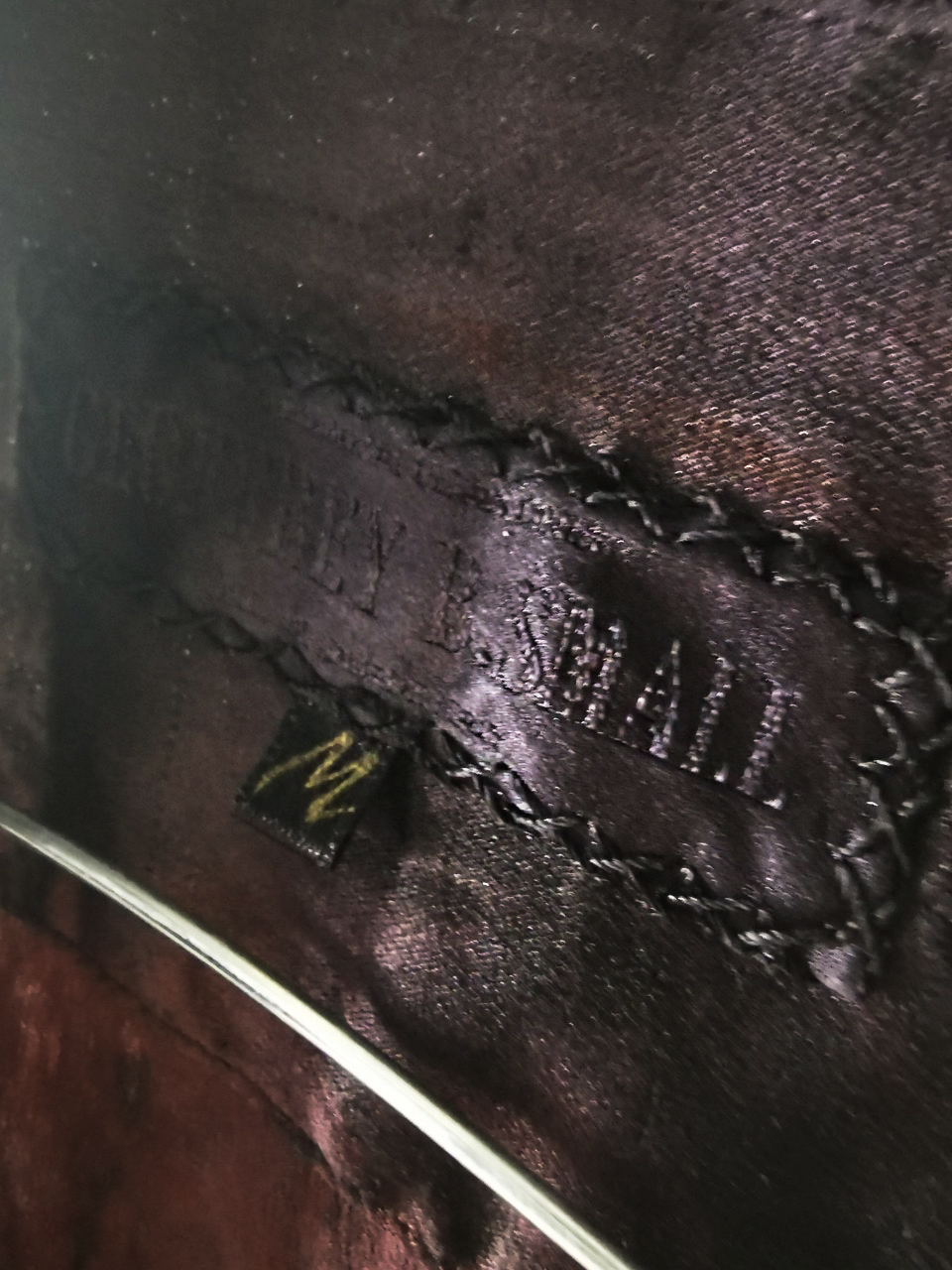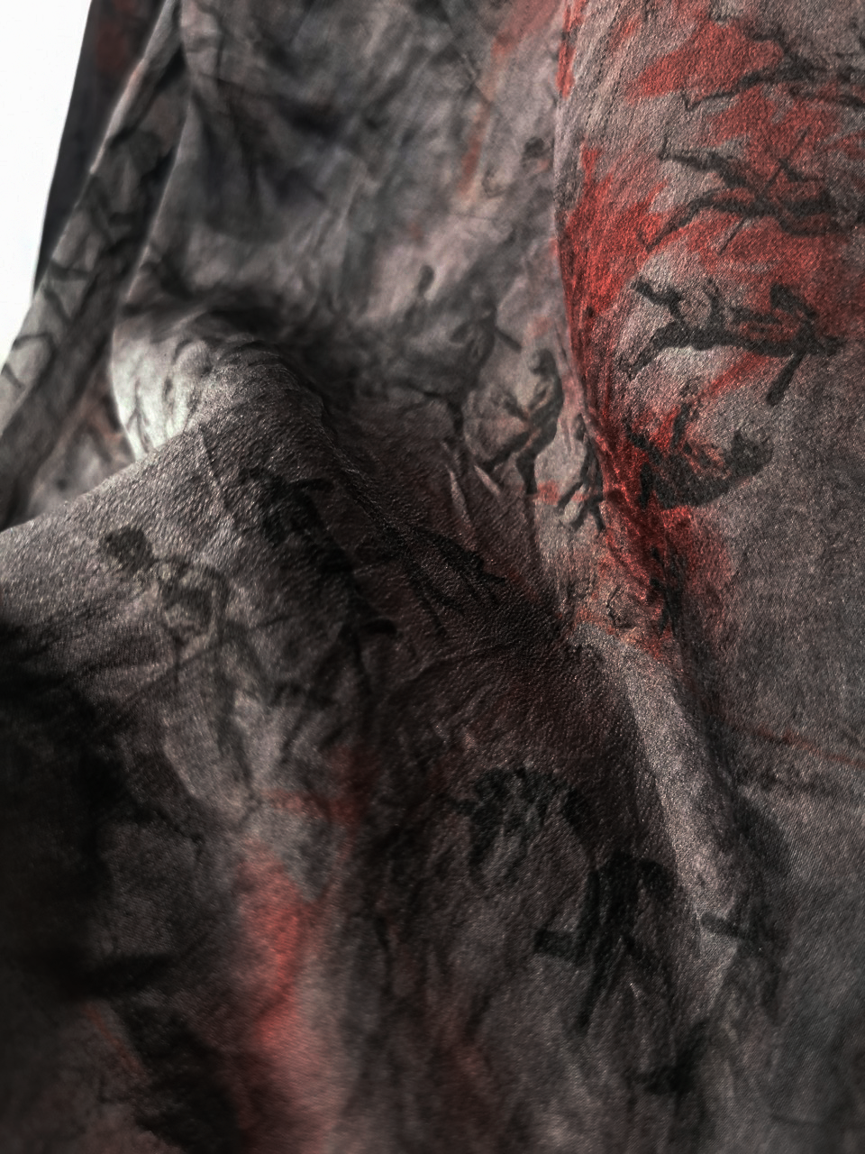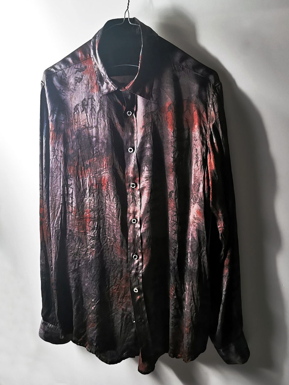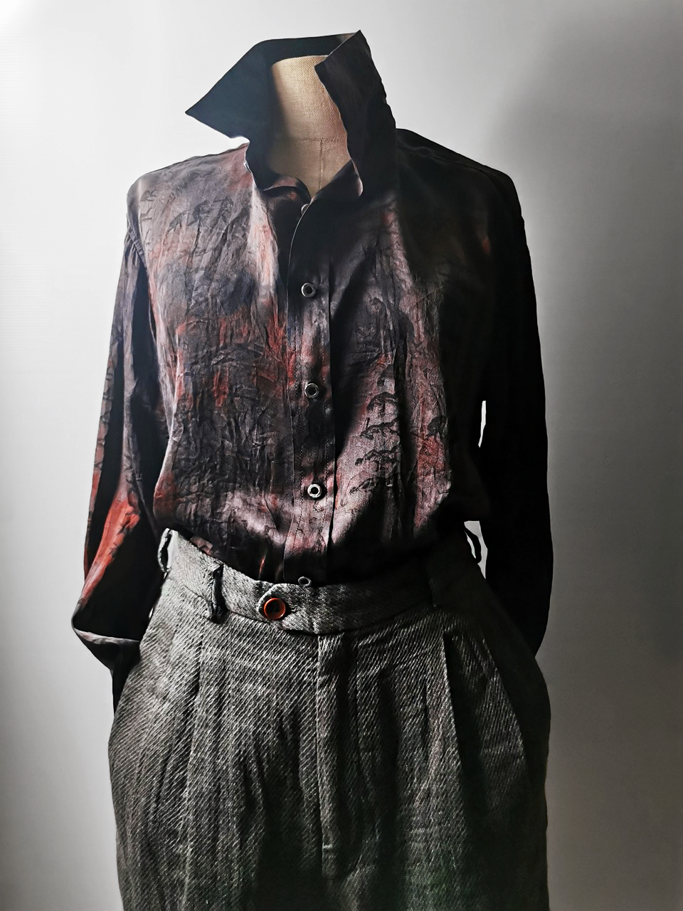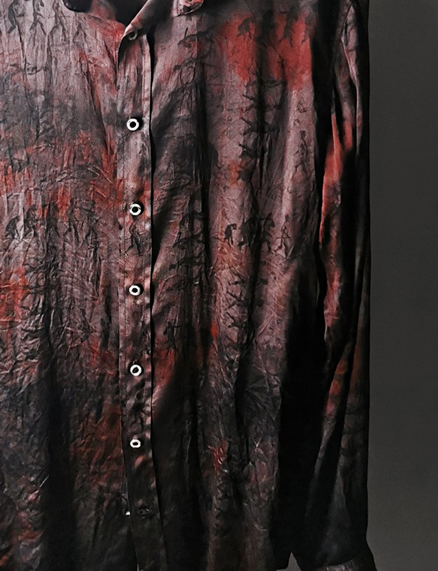 THIS special of the super limited edition RNS12 handmade shirt design is one of only 7 pieces made by hand exclusively for Darklands in Berlin. It was created by hand using an intriguing pure silk 16 momme raso satin “Evolution Man” print design created exclusively for us by the legendary Brenna family in Como Italy, the world's leading center for fine silk fabric creation, and features a classic European tailored men’s shirt cut and design, real mother-of-pearl buttons made for us by the Lanzanova family of pearl button specialists in Brescia, and no less than 12 of our signature real hand sewn buttonholes in luxurious pure silk Bozzolo Milano Seta Reale threads (which required at least 10-12 minutes to create each one). The piece was then specially multiple GBS “Accident dyed” by hand with a stunning story of red and grey tones in our studios using multiple applications of our latest advanced artisanal dye processes to achieve its unique colors, mottled patina effects and softness… and features our world leading pure silk hand dyed label created exclusively for us by Mion SpA in Torreglia which is the first label in the luxury industry to completely eliminate plastic polyester yarns in it--beautifully attached all by hand using pure silk threads. Variations in color and color density are not imperfections or irregularities, but specific characteristics of the special fabric, and hand making and dyeing techniques. Please treat buttons and buttonholes with care. We recommend professional clean only or hand wash cold water and protecting buttons with foil or plastic wrap when washing. Do not put in washing machine or machine dryer.