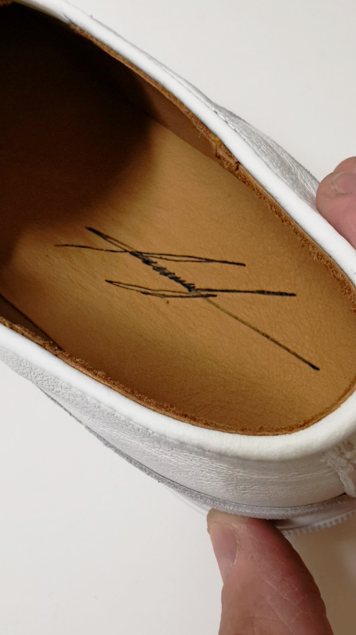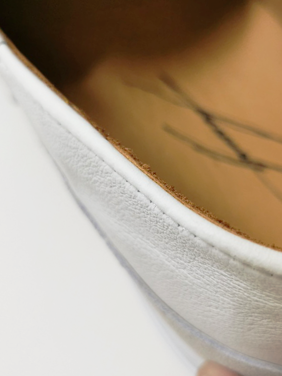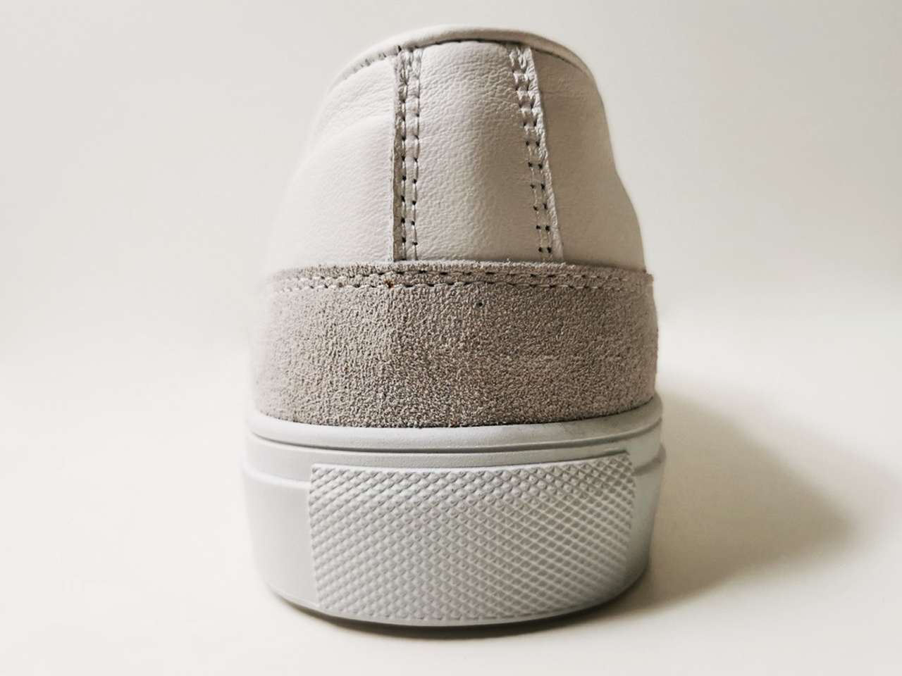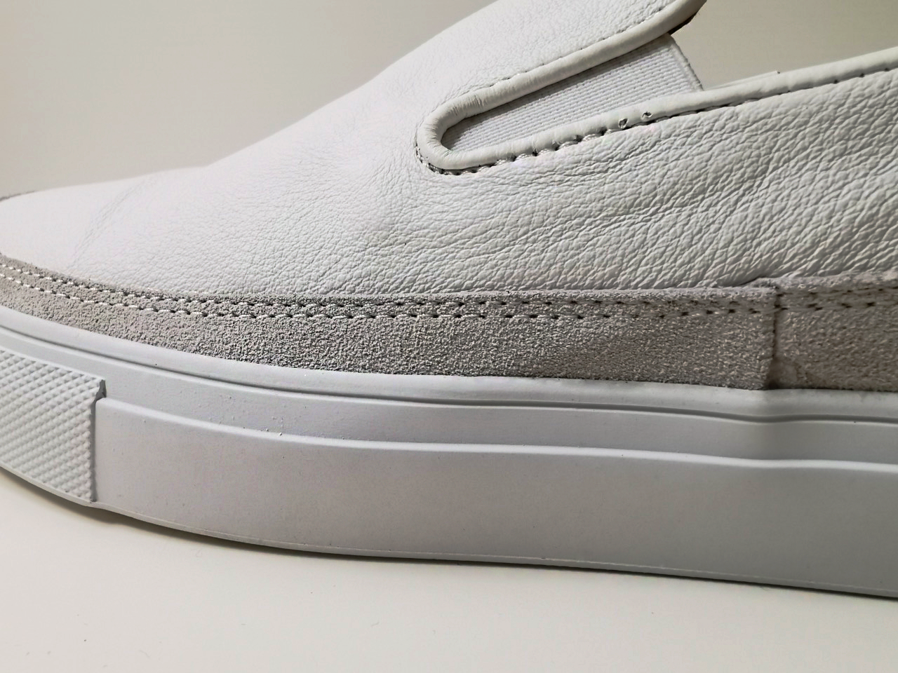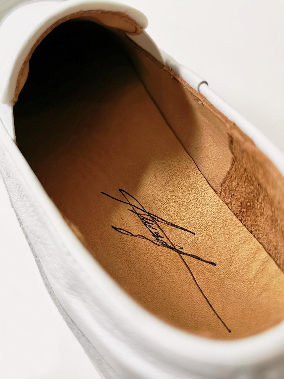 THIS special white leather version of the super limited edition RNZ03 handmade shoe design is one of only 4 pairs of its kind currently being made for the entire world, each exclusively for Blue Mountain School in London, using luxurious Vicentina vegetable-tanned leathers and Vicentina suede leathers carefully selected and hand treated, from our intensive research, luxurious special Italian calfskin lined interiors, natural ultra long-lasting rubber soles, all combined into an elegant bumper sole slip-on shoe design. The design features elasticized-tongue for easy on-off capabilities and contrasting suede trim. The unique shoes were made for us in San Zenone degli Ezzelini by the Italian master, Giuseppe Rebesco, and his mountain shoe specialists in Montebelluna, a region famous for mountain shoe making-- a leading historical expert specialist in hand crafted footwear creation. Each of the leathers was hand drawn and cut in the original method utilized since the middle ages period of shoe crafting and then meticulously assembled in a very slow and painstaking process. Each item is a unique one-of-a-kind and signed by the designer. Variations in color and color density are not imperfections or irregularities, but specific characteristics of the genuine Vicentina Italian leathers, ancient hand shoe making technique and style. Please treat with care. Clean with chamois or soft cloth and suede brush. Shoes will age with patina and become more comfortable with wear. For more care information please contact your authorized Geoffrey B. Small dealer.