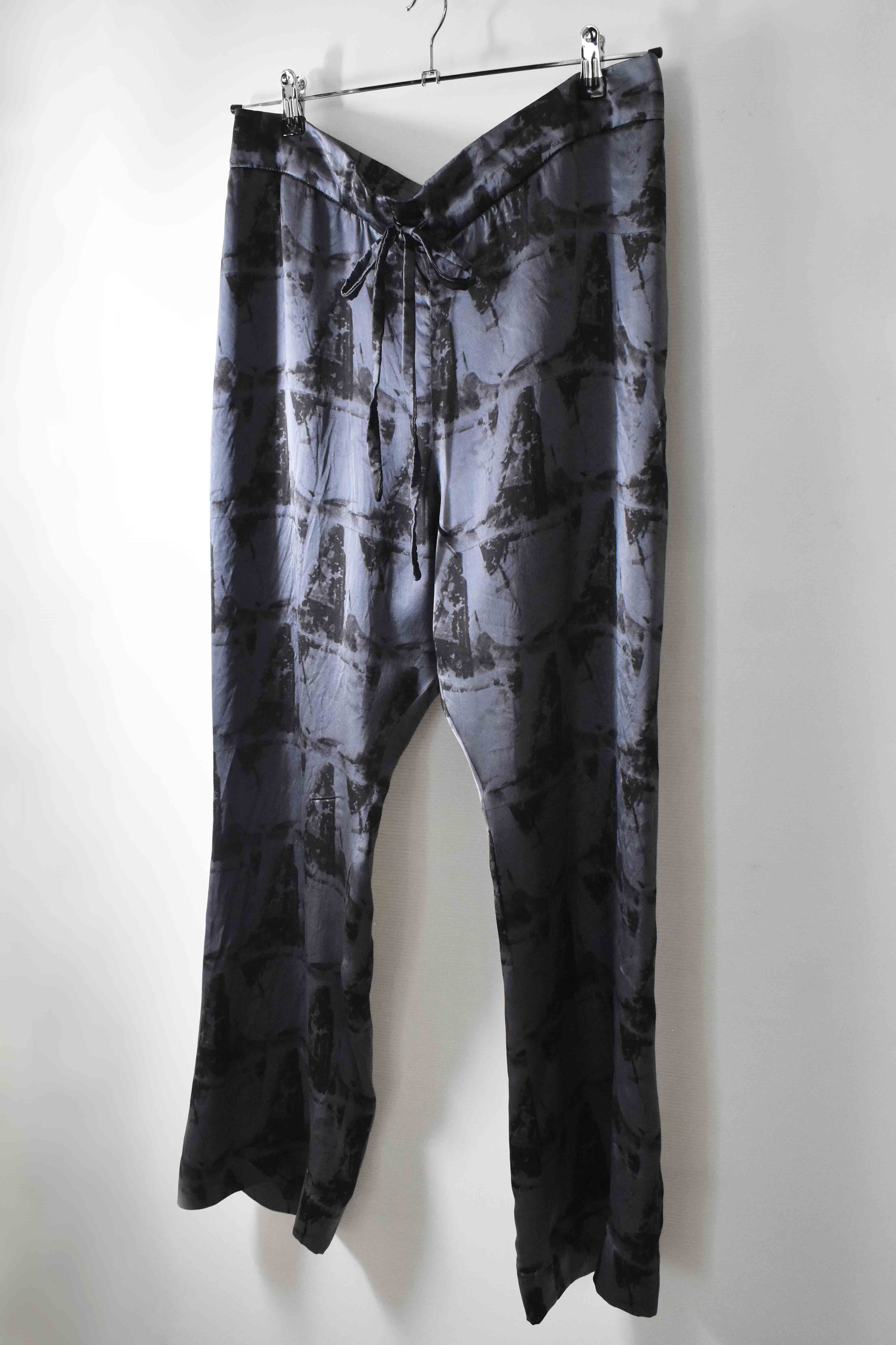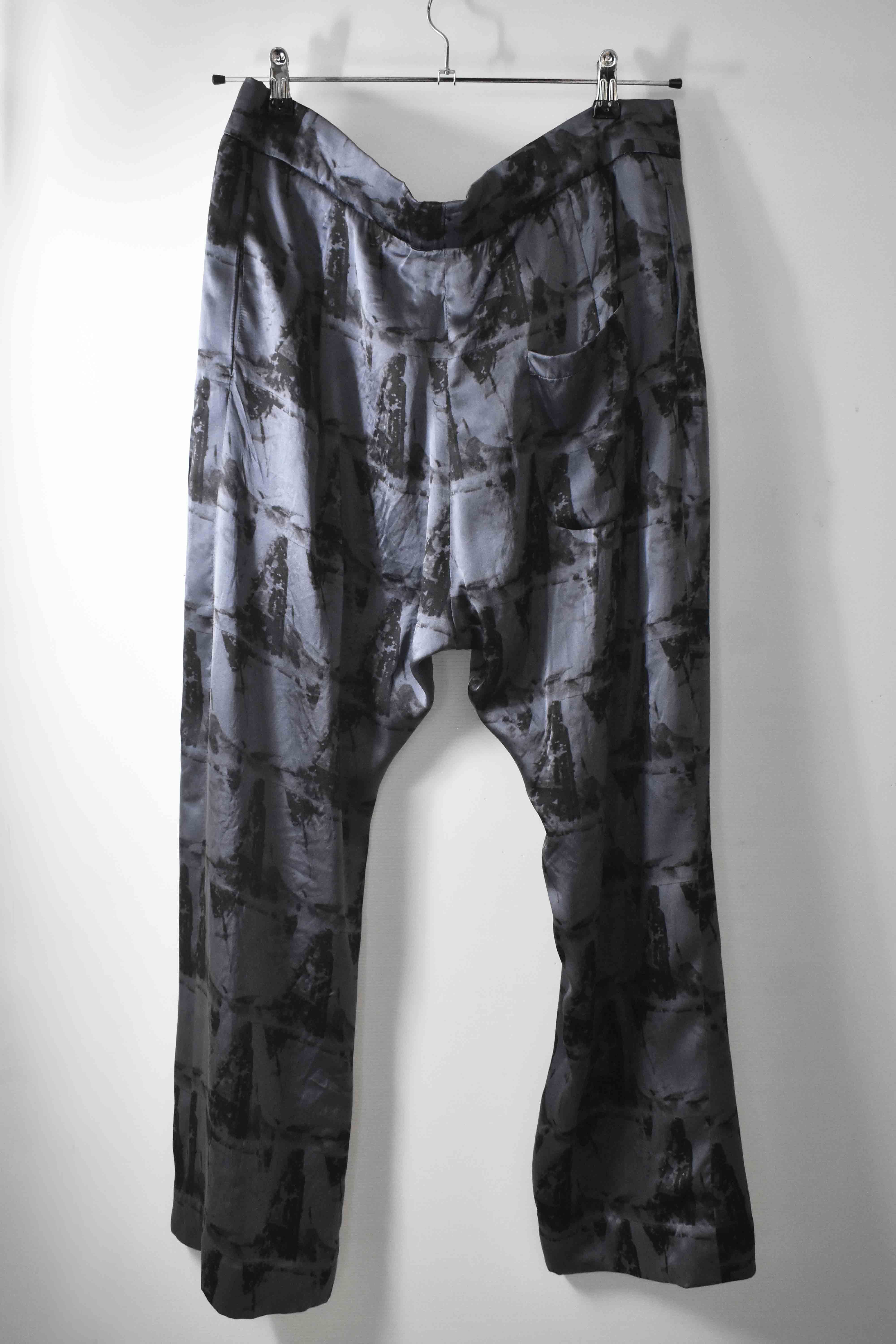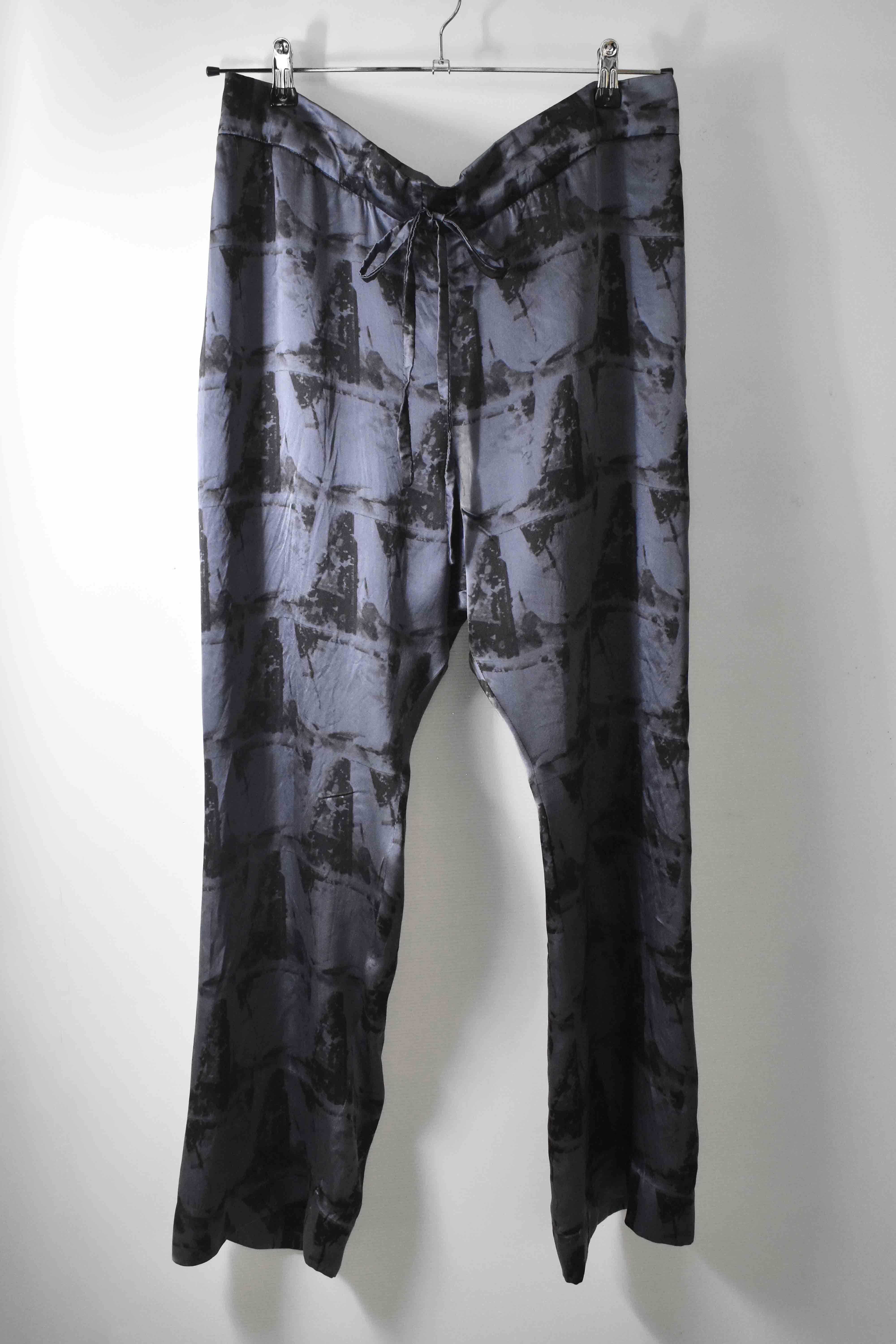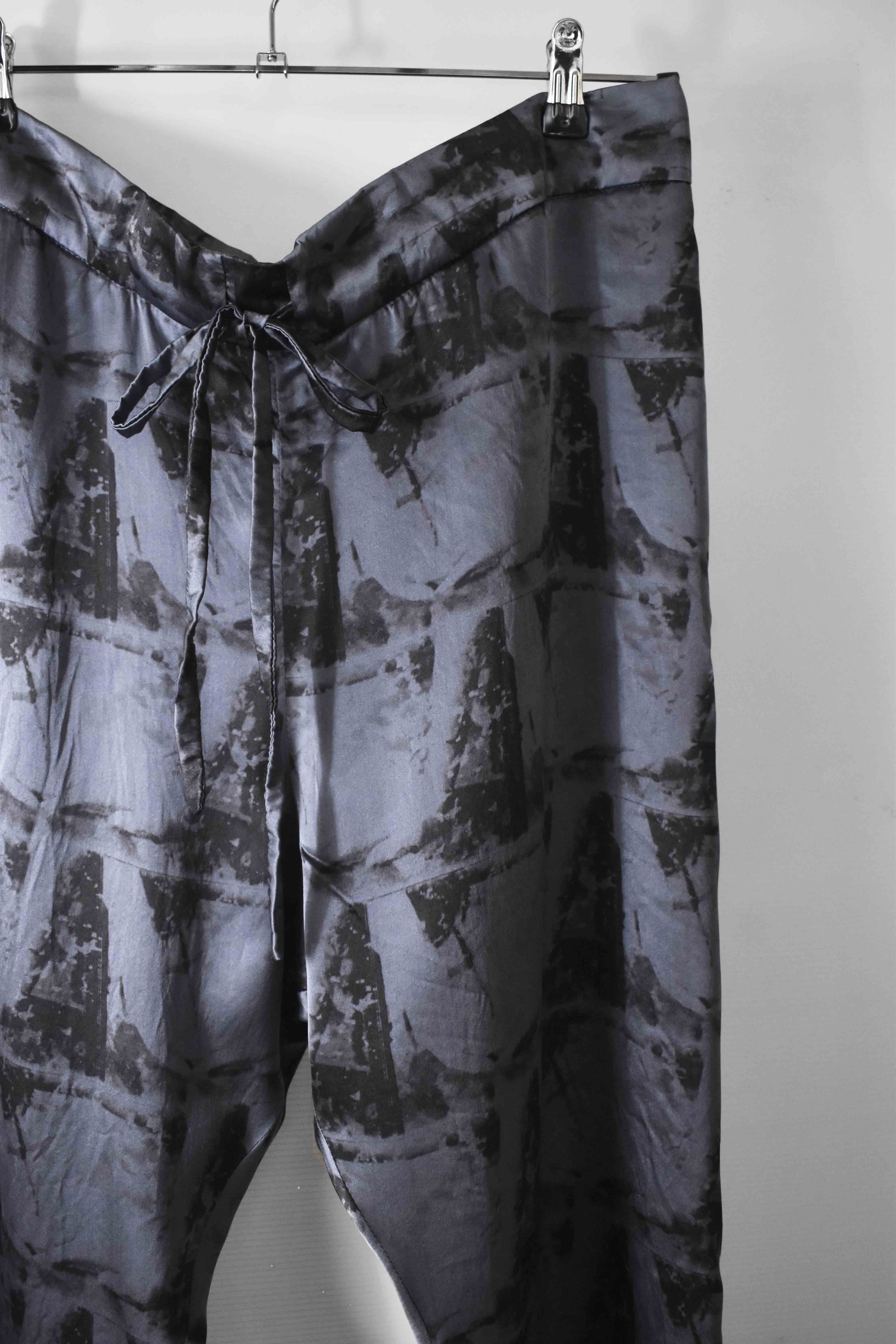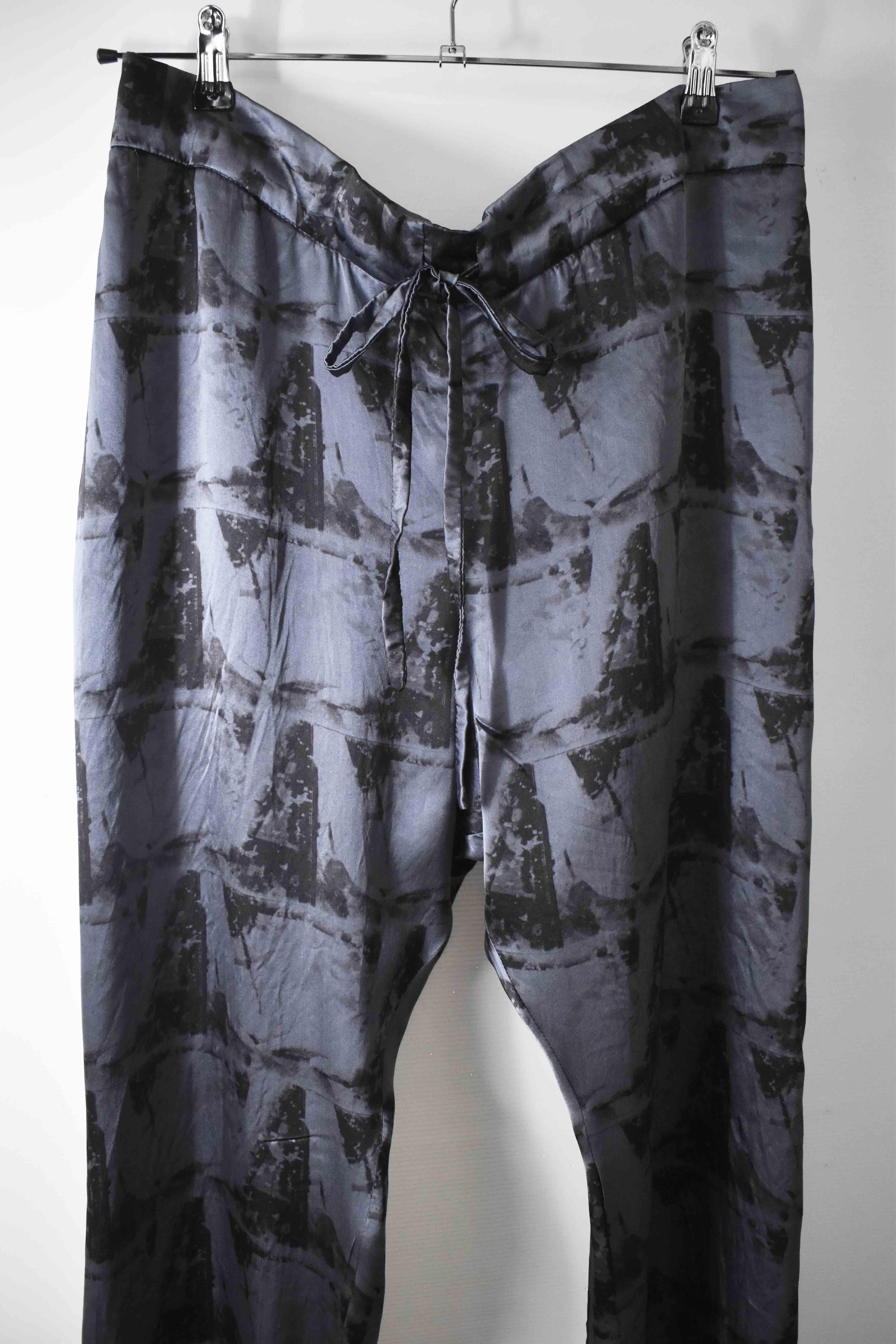 THIS special version of the super limited edition GBS Evolution IV.2 CLP03 handmade trouser design is one of only 2 pieces of its kind made by hand for the entire world using our exclusive relaxed dress drawstring waist leisure trouser pattern from our extensive tailoring research, and cut using a special pure silk exclusive "Hand and Leaves" print 16-momme raso satin cloth made only for us by the legendary Brenna family in Como, Italy---the world’s leading center for fine silk fabric creation--then specially dyed by hand in our world-famous GBS Superworkrooms at Cavarzere Venezia using a special process that required over 8 hours of expert work to achieve its beautiful colors, patina effects, shaping and incredible softness. The design features features beautifully finished interior taped seam finishing, real hand sewn taped hemlines (not machined), generous 2,5 centimeter seam allowances on major fitting seams that allow the trouser to be altered and let out a full size larger than its original cut, and our world leading pure silk hand dyed label created exclusively for us by Mion SpA in Torreglia which is the first label in the luxury industry to completely eliminate plastic polyester yarns in it—beautifully attached all by hand using pure silk threads.