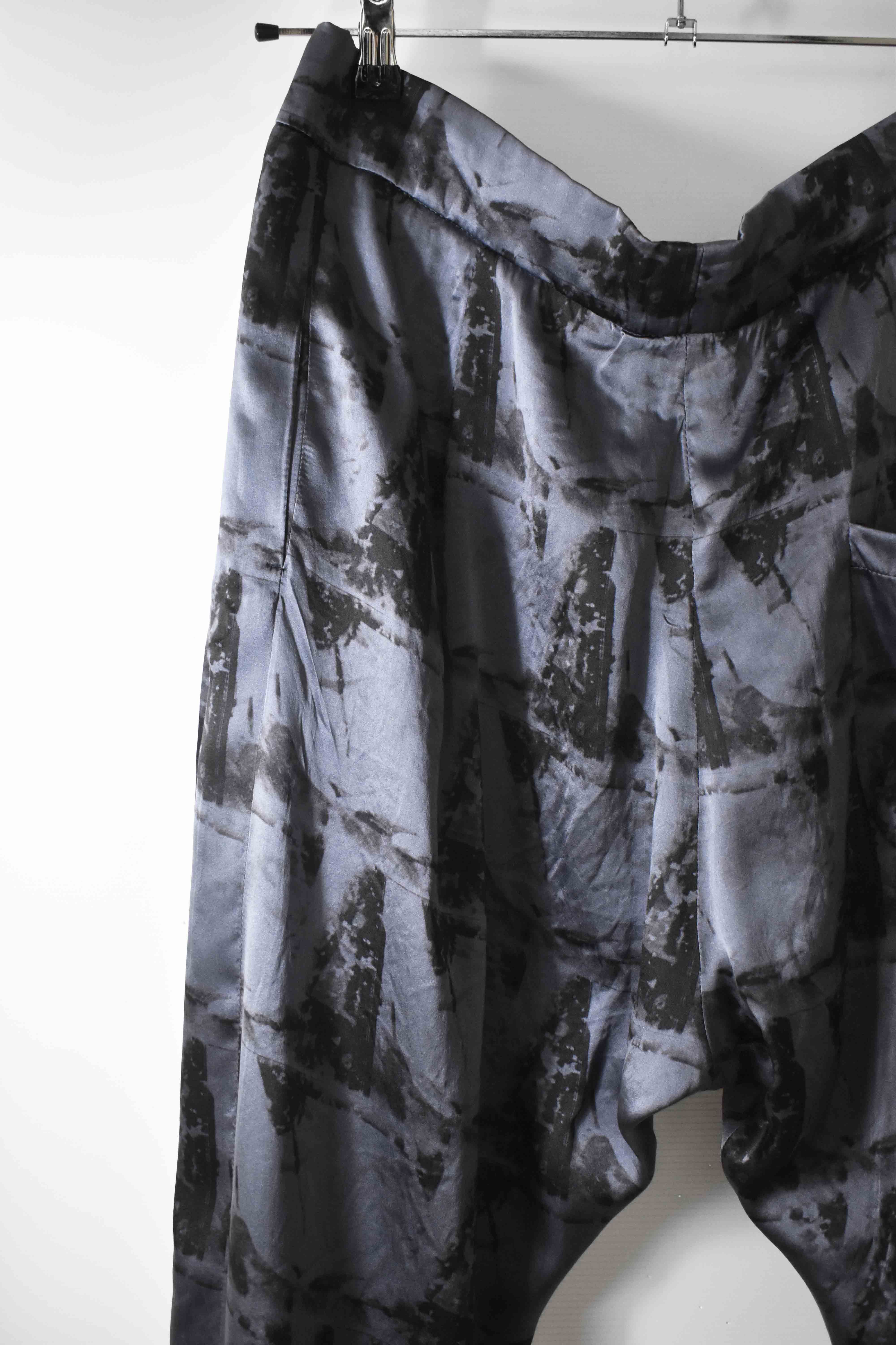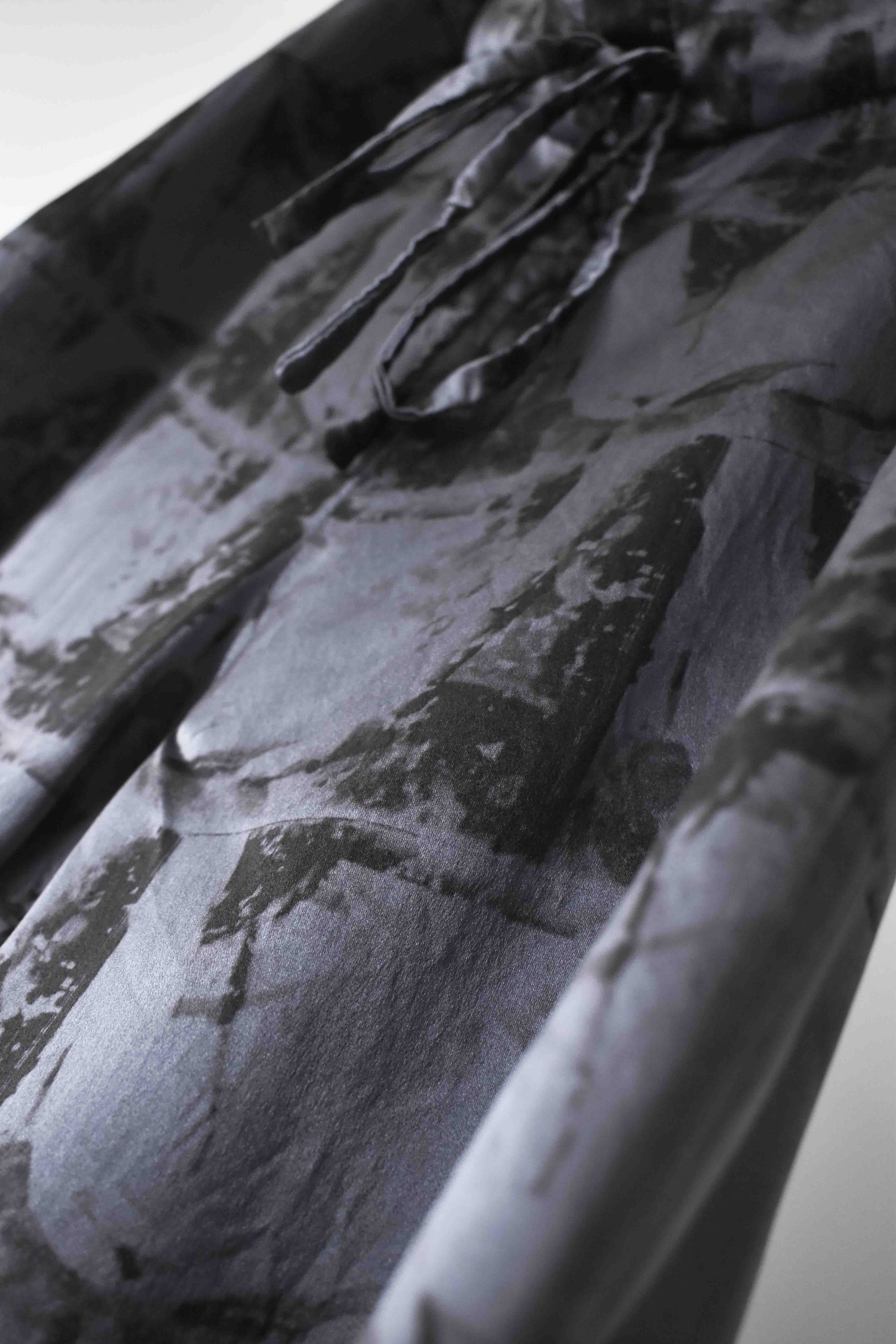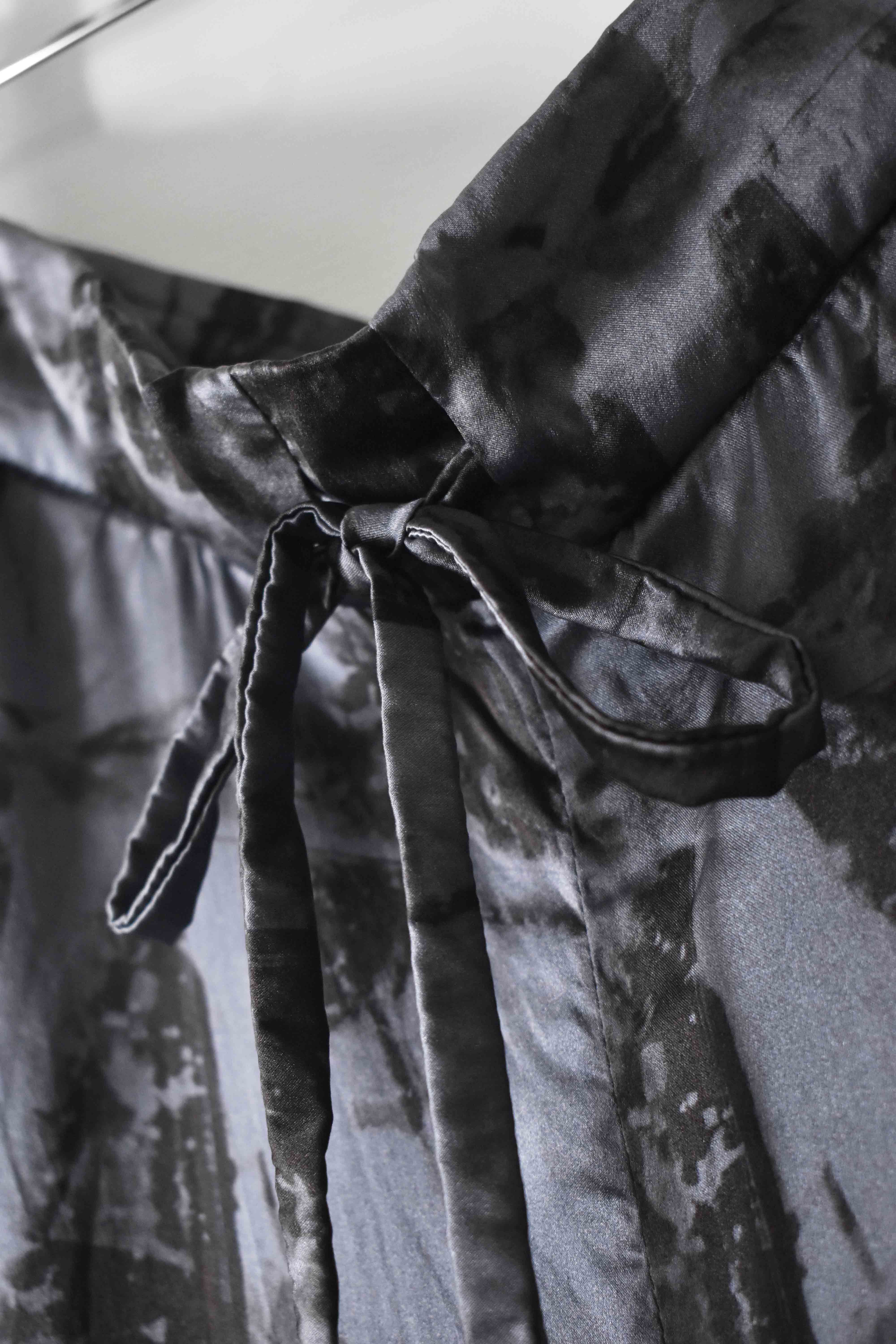 THIS special version of the super limited edition GBS Evolution IV.2 CLP03 handmade trouser design is one of only 2 pieces of its kind made by hand for the entire world using our exclusive relaxed dress drawstring waist leisure trouser pattern from our extensive tailoring research, and cut using a special pure silk exclusive "Hand and Leaves" print 16-momme raso satin cloth made only for us by the legendary Brenna family in Como, Italy---the world’s leading center for fine silk fabric creation...
