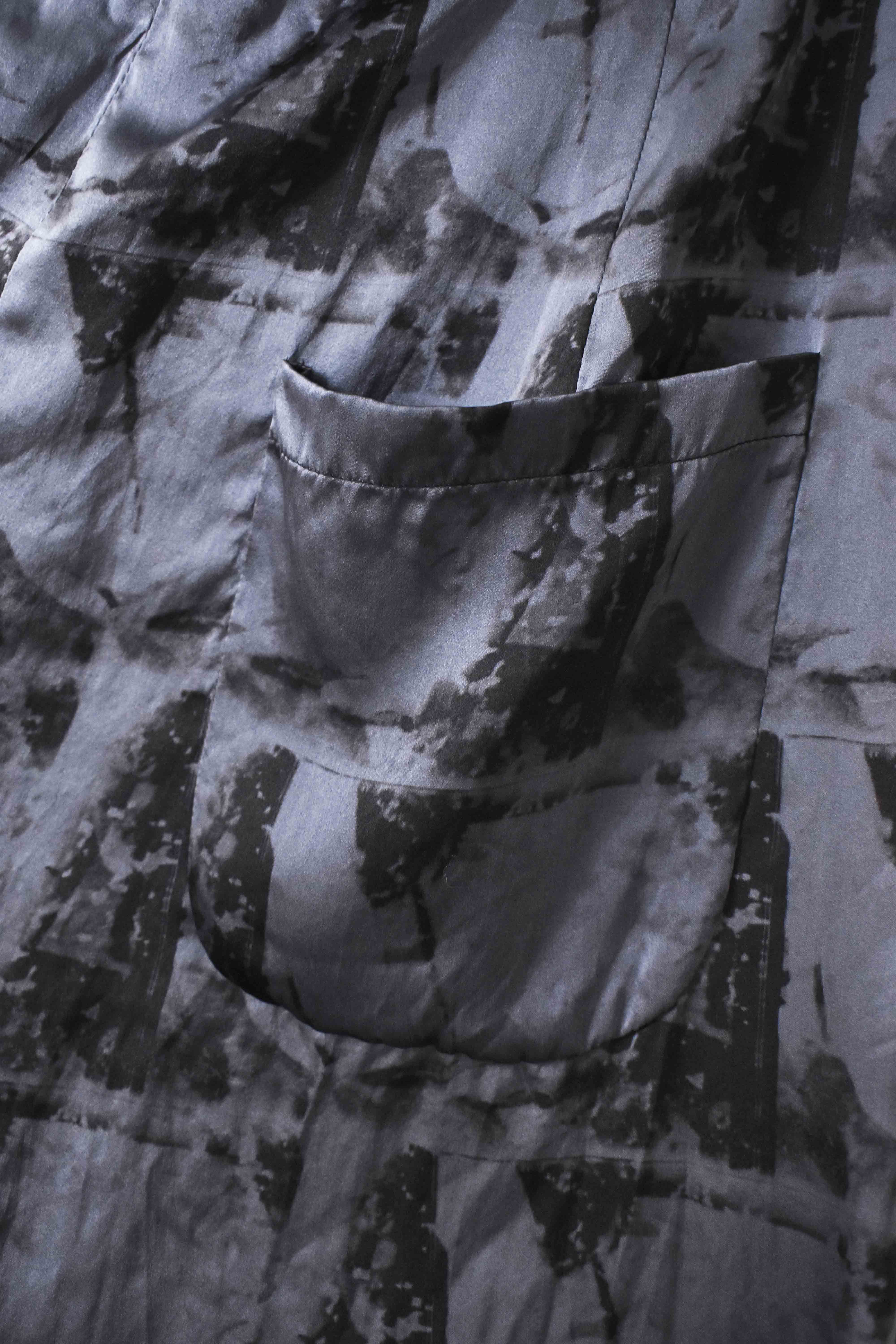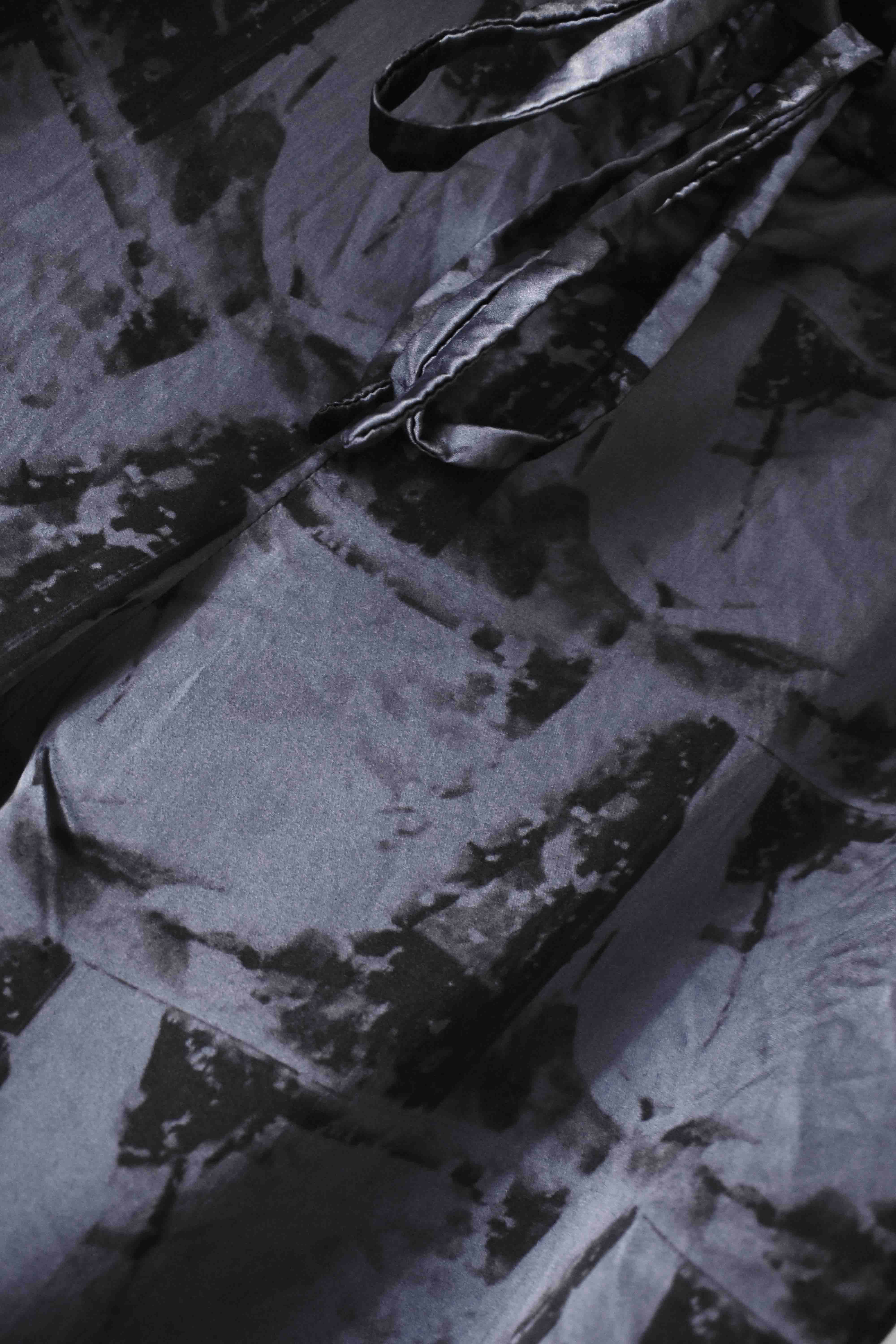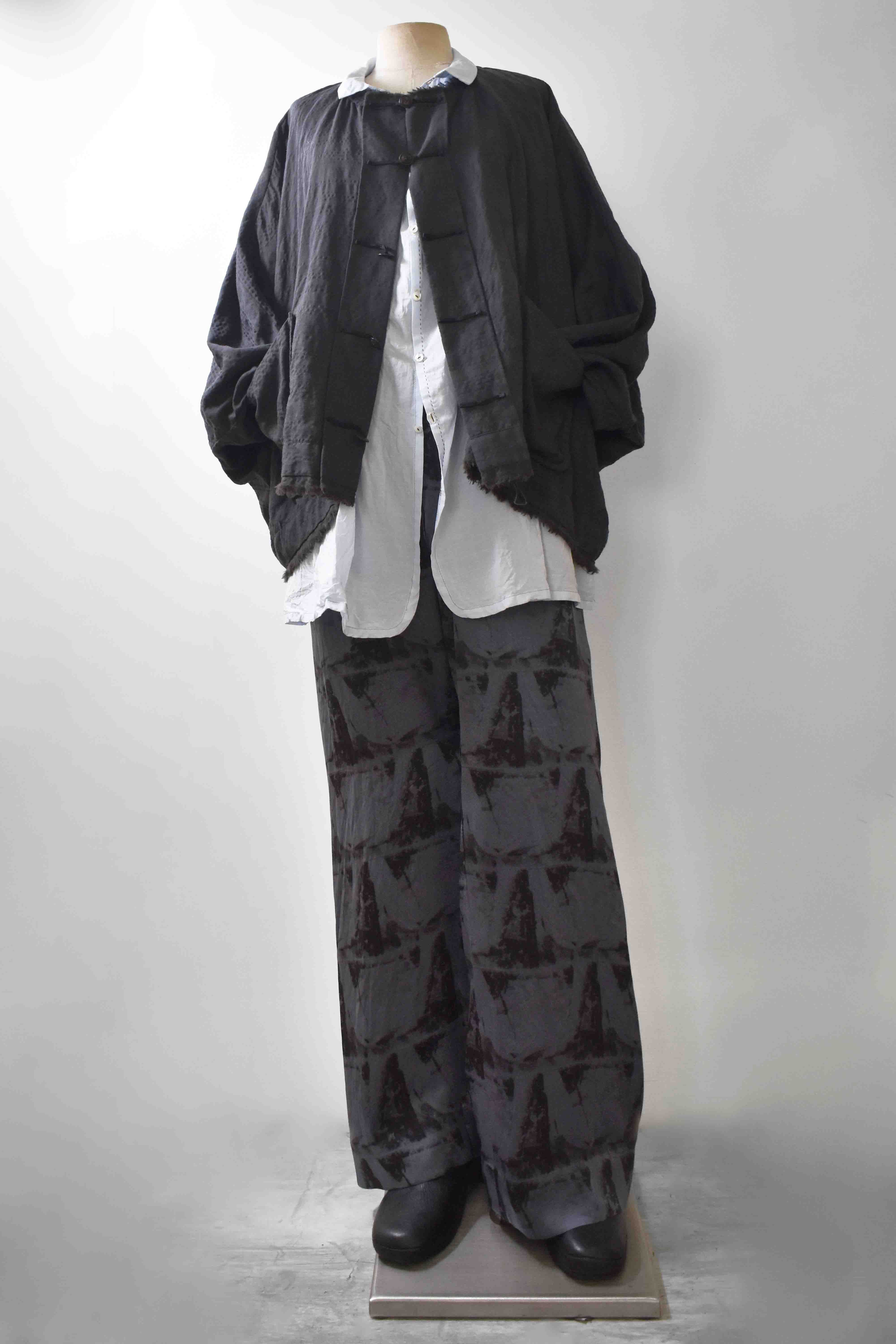 THIS special version of the super limited edition GBS Evolution IV.2 CLP03 handmade trouser design is one of only 2 pieces of its kind made by hand for the entire world using our exclusive relaxed dress drawstring waist leisure trouser pattern from our extensive tailoring research, and cut using a special pure silk exclusive "Hand and Leaves" print 16-momme raso satin cloth made only for us by the legendary Brenna family in Como, Italy---the world’s leading center for fine silk fabric creation...