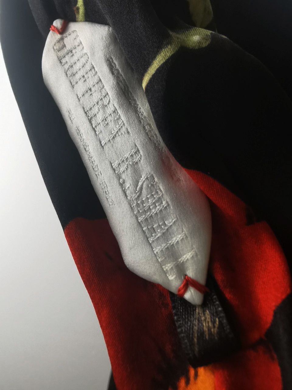 ...and our world leading pure silk hand dyed label created exclusively for us by Mion SpA in Torreglia which is the first label in the luxury industry to completely eliminate plastic polyester yarns in it—beautifully attached entirely by hand using pure silk threads...