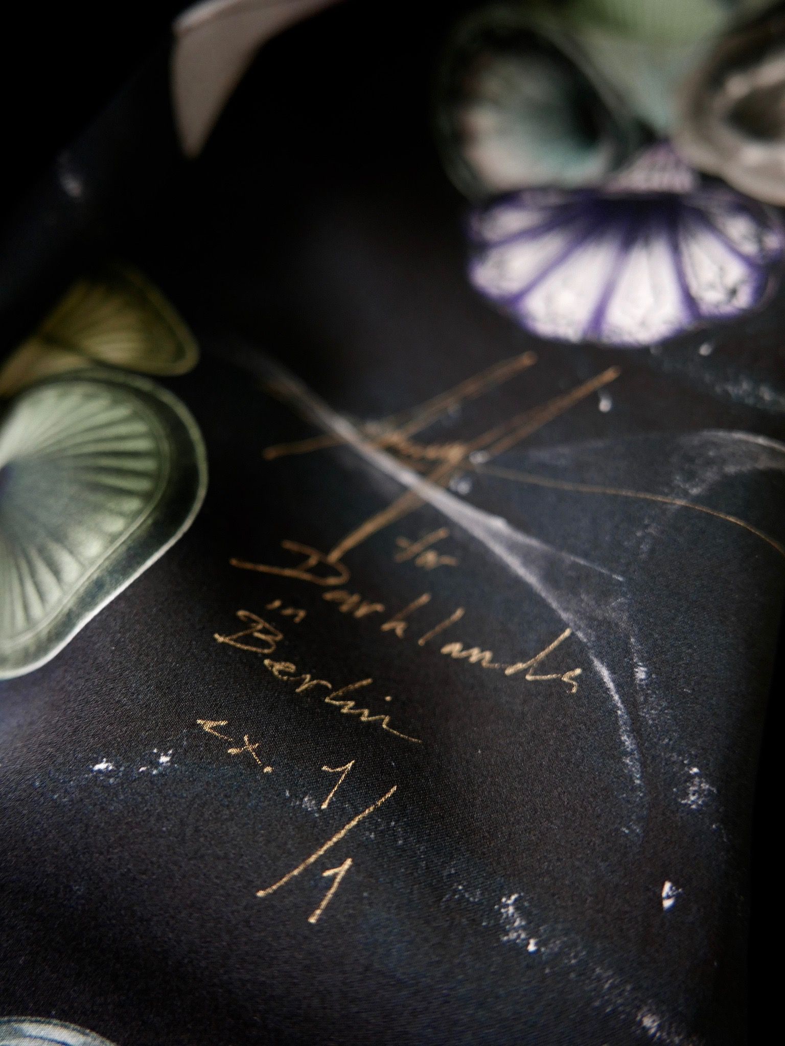 ...the piece also features our world leading pure silk hand dyed label created exclusively for us by Mion SpA in Torreglia which is the first label in the luxury industry to completely eliminate plastic polyester yarns in it-- beautifully attached entirely by hand using pure silk threads .