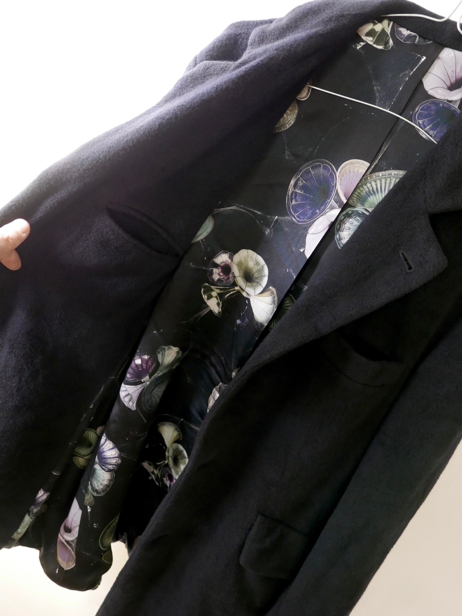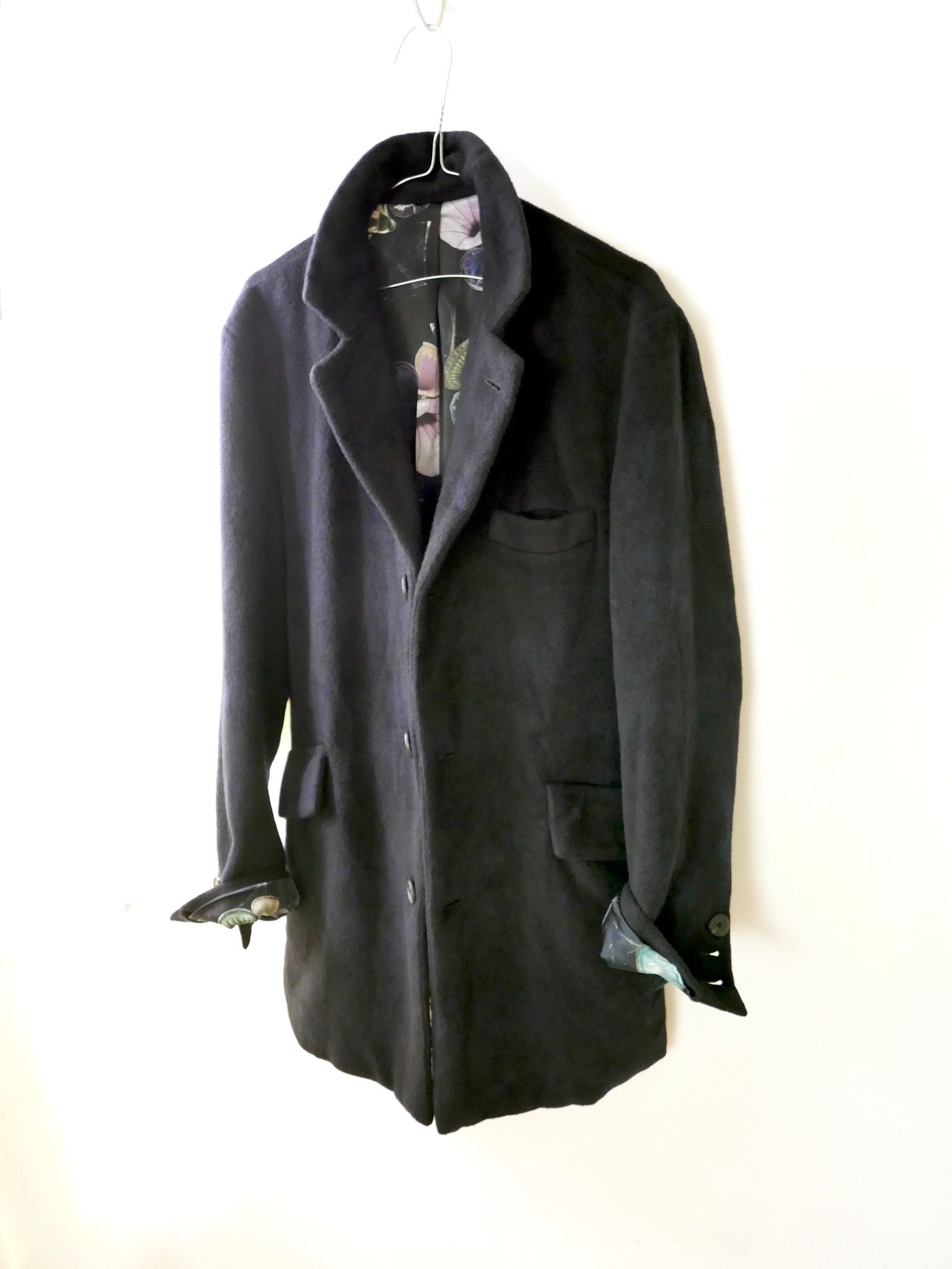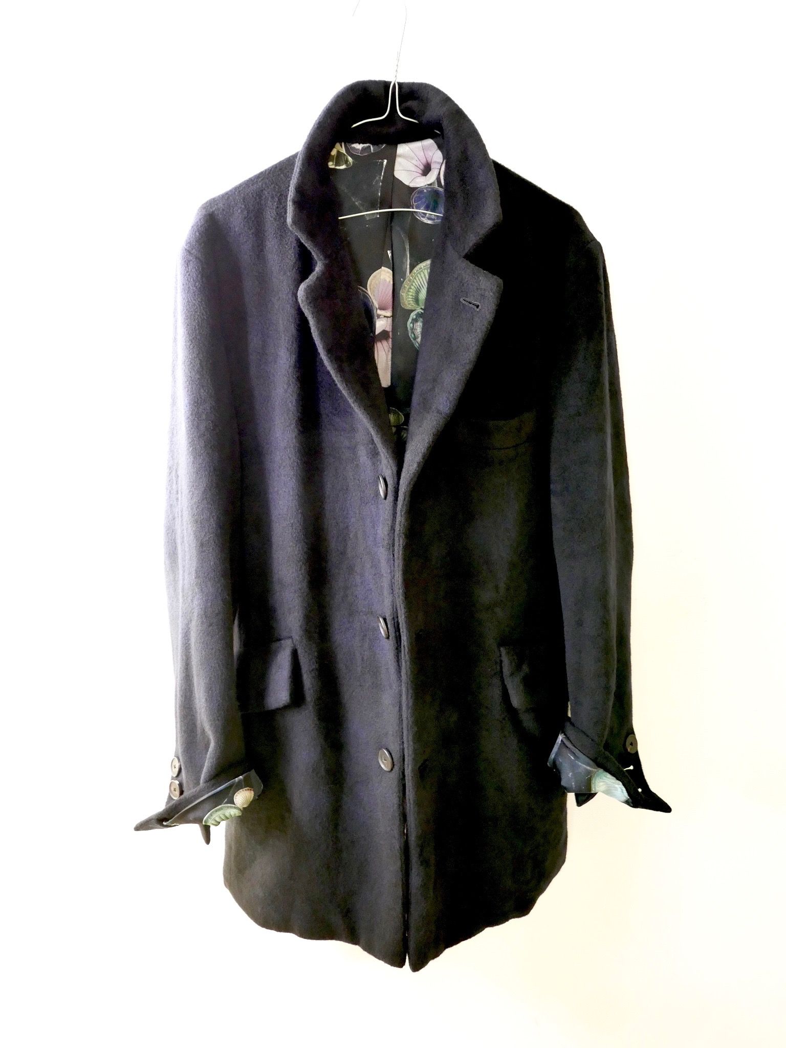 THIS special version of the super limited edition ETC01 handmade topcoat design is one of only 2 pieces of its kind made by hand in the entire world. It was created exclusively for Darklands in Berlin, from our original single-breasted 3-button notched-lapel classic car coat length pattern, from our extensive tailoring research, and cut using a superlux, supersoft 540 gram 3-ply Alashan pure cashmere coating cloth woven in Pollone Biella, Italy, by the oldest woolen mill and most respected cashmere makers in the world, Fratelli Piacenza 1733 Spa... combined with a fully-lined luxury lining story in an exclusive pure 16-momme silk raso Darkland’s gramophone “evolution of sound” print lining created for us by the legendary Brenna family in Como, the world’s leading silk production region, then specially hand dyed, washed and treated in our workrooms at Cavarzere Venezia using an intricate series of processes which required over 12 hours of painstaking expert work to achieve its beautiful colors, chiaroscuro patina effects, shaping and softness. The design features real working buttonhole handmade surgeon's cuffs, hand-cut besom welt and flap pockets and tailored center vent, hidden lapel button which allows the coat to be buttoned all the way up for cooler weather or sportier styling, generous 2,5 centimeter seam allowances on major fitting seams that allow the coat to be altered and let out a full size larger than its original cut, impeccably finished interior with handsewn hems and closures, remarkable new “Alessandro” design real horn buttons made for us by the world’s greatest living buttonmakers- Claudio and Cinzia Fontana in Parma, and no less than 10 of our signature real hand-stitched buttonholes (that required 10-15 minutes to cut and sew each one) all done in pure silk Bozzolo Reale Seta Milan thread. The piece also features our world leading pure silk hand dyed label created exclusively for us by Mion SpA in Torreglia which is the first label in the luxury industry to completely eliminate plastic polyester yarns in it--beautifully attached completely by hand using pure silk threads . Variations in color and color density are not imperfections or irregularities, but specific characteristics of the special fabric and hand making technique. Please treat buttons and buttonholes with care. We recommend professional clean only or hand wash cold water and protecting buttons with foil or plastic wrap when washing. Do not put in machine washer or dryer.