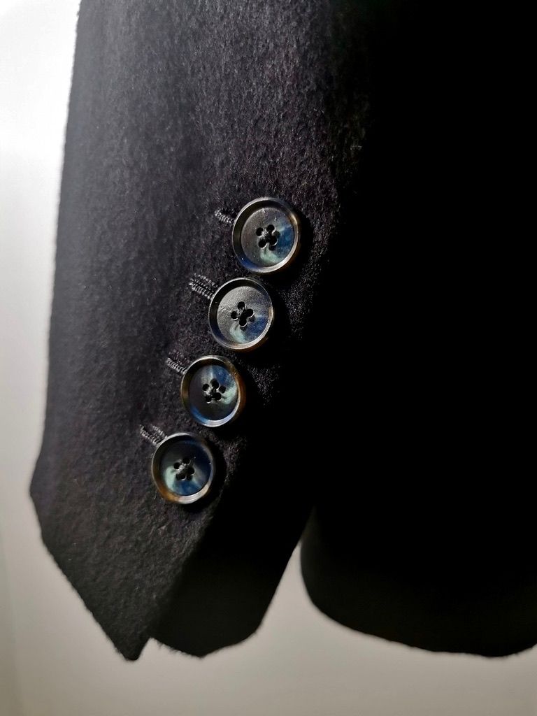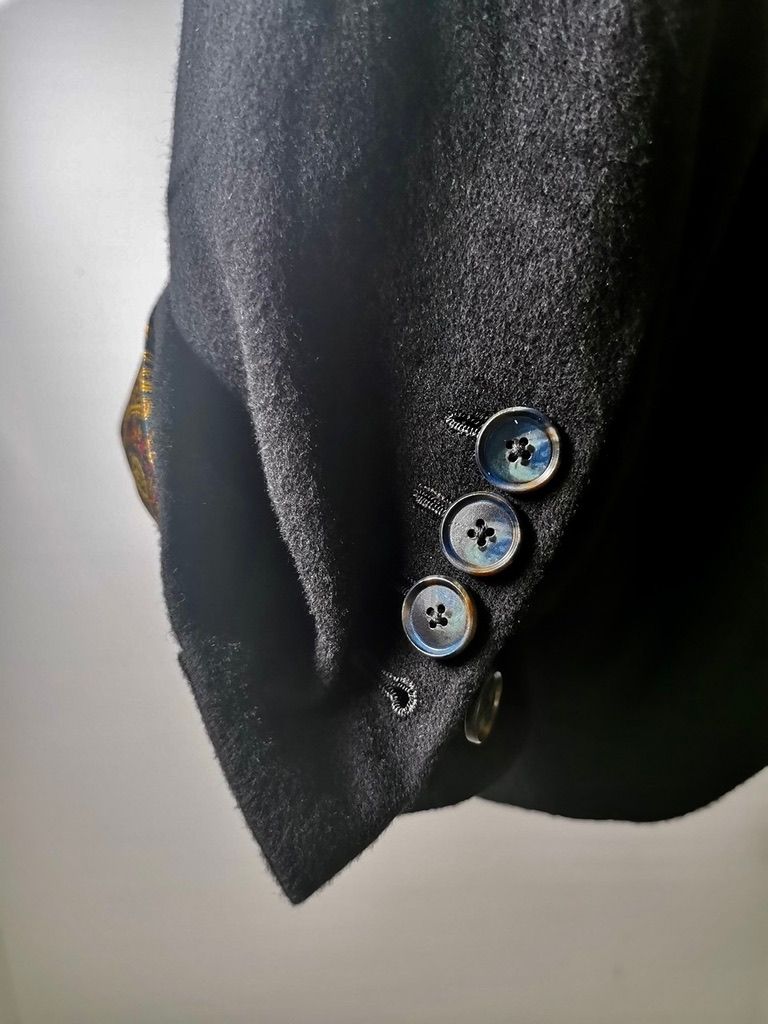 ...an exclusive advanced tinted design button story in real horn made for only us by the world’s greatest living buttonmakers- Claudio and Cinzia Fontana in Parma, Italy; and no less than 13 of our signature real hand stitched buttonholes (each one required 10-12 minutes to cut and sew) in luxurious pure silk Bozzolo Reale Milano Seta threads...