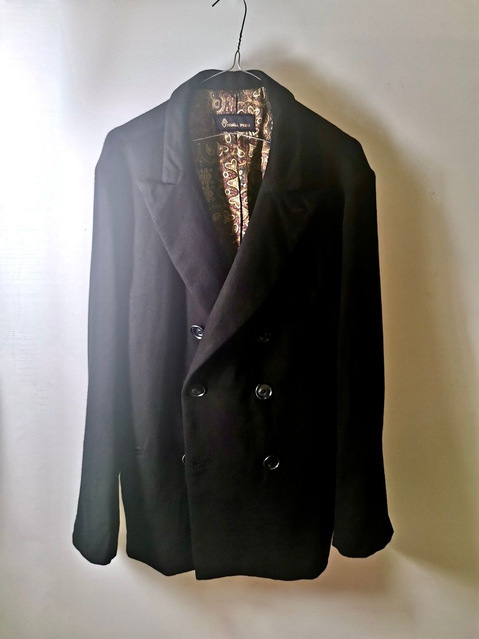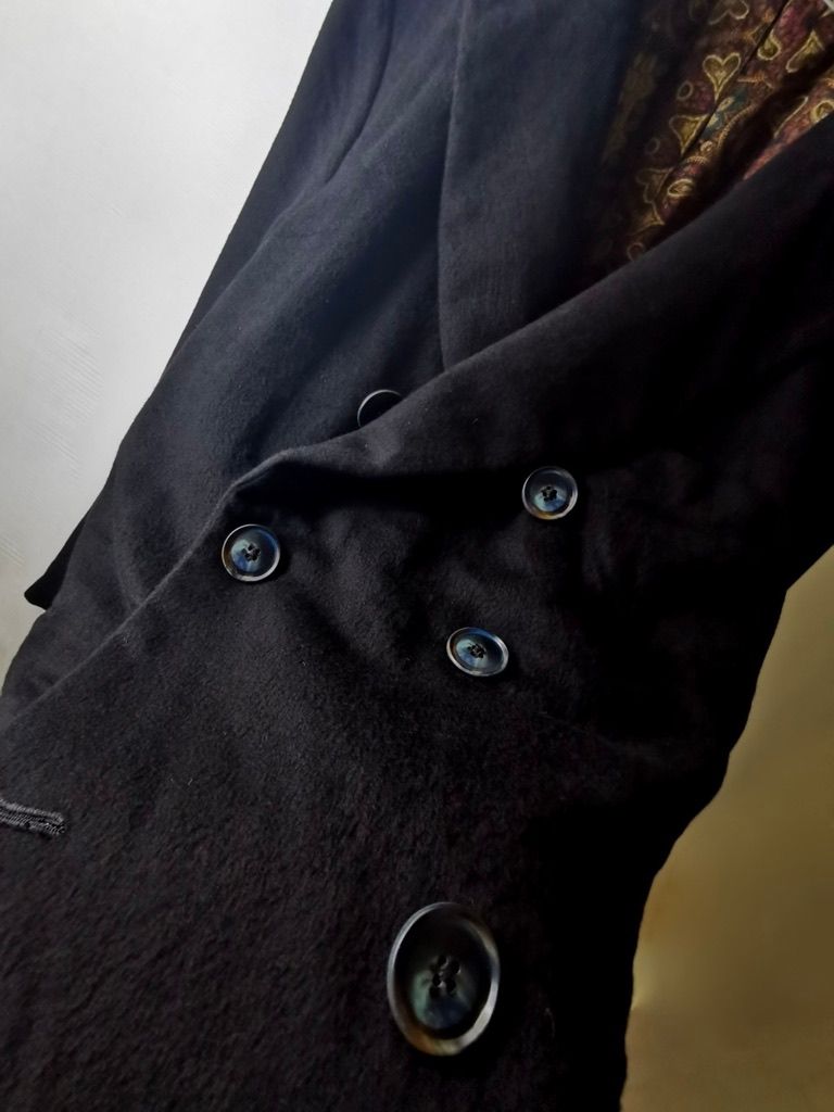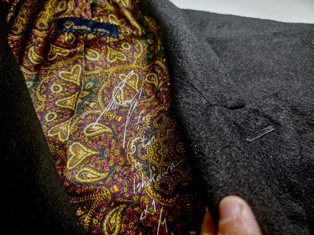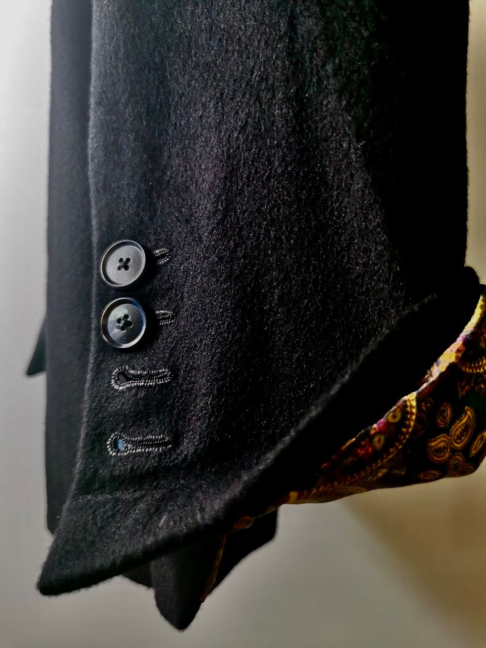 THIS special version of the GBS Evolution VI super limited edition EV6J07 handmade jacket design is the only piece of its kind made by hand in the entire world. It was created exclusively for 5ton in Ishikawa, Japanfrom our6-button peak-lapel 1930’s to early 1940’s tailored jacket pattern, and cut using hyperlux “Cocoon”fully CITES certified 80 percent Baby Cashmere and 20 percent Peruvian Vicunya 330 gram fabric woven in Pollone Biella, Italy, by the oldest woolen mill and most respected cashmere and fine wool fabric makers in the world- Fratelli Piacenza 1733 Spa... combined with a fully-lined luxury lining story in an exclusive pure 16-momme silk raso paisley design print lining created for us by the legendary Brenna family in Como, the world’s leading center for fine silk fabric creation, then specially hand dyed, washed and treated in our workrooms at Cavarzere Venezia using a series of processes which required over 20 hours of painstaking expert work to achieve its beautiful colors, patina effects, shaping, drape and incredible softness.The design features very special old-fashioned canvas horsehair front and collar interfacings totally hand-padstitched with over 1000 invisible hand stitches inside to give it its remarkable soft, natural roll line along lapels and collar, spectacular 4-button handmade working buttonhole surgeon's sleeve cuffs, beautifully clean-finished fully-lined interior construction, real hand sewn hemlines and finishing details (not machined), generous 2,5 centimeter seam allowances on major fitting seams that allow the garment to be altered and let out up to a full size larger than its original cut;an exclusive advanced design button story in real horn made for only us by the world’s greatest living buttonmakers- Claudio and Cinzia Fontana in Parma, Italy; and no less than 13 of our signature real hand stitched buttonholes (each one required 10-12 minutes to cut and sew) in luxurious pure silk Bozzolo Reale Milano Seta threads. The piece also is handsigned and numbered by the designer andfeatures our world leading pure silk hand dyed label created exclusively for us by Mion SpA in Torreglia which is the first label in the luxury industry to completely eliminate plastic polyester yarns in it—beautifully attached all by hand using pure silk threads.