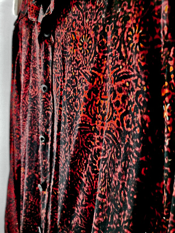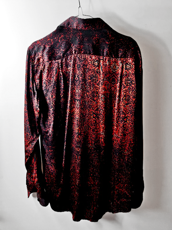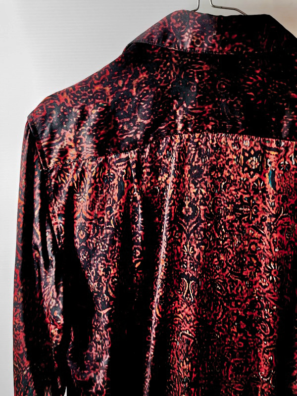 ...cut in a superlux pure silk 16 momme raso satin exclusive “Afghan tapis” print design made only for us by the legendary Brenna family in Como, Italy- the world’s leading center for fine silk fabric creation, then specially washed and treated by hand in our world-famous GBS Superworkrooms at Cavarzere Venezia for extra aging, shaping, drape and softness...