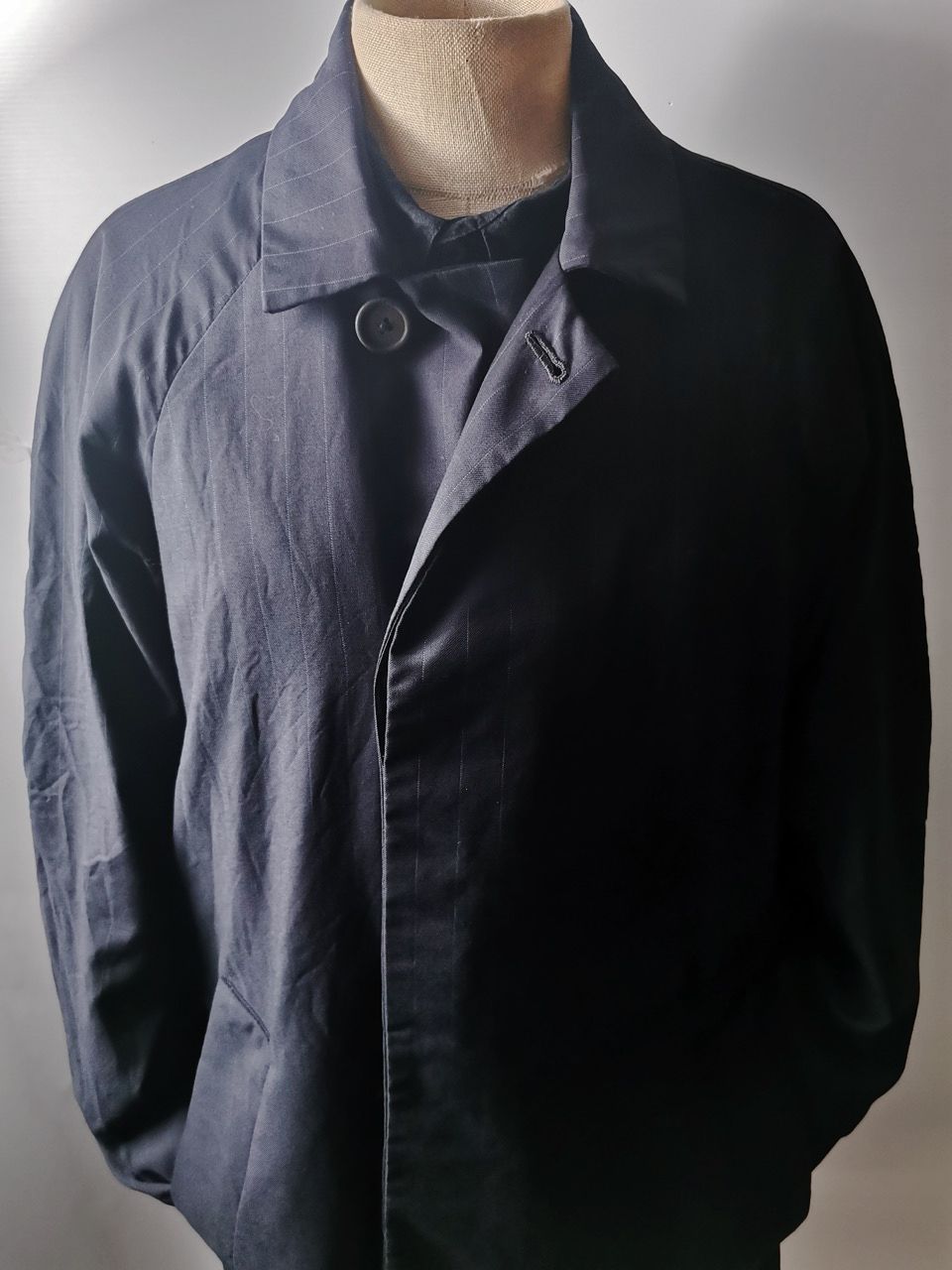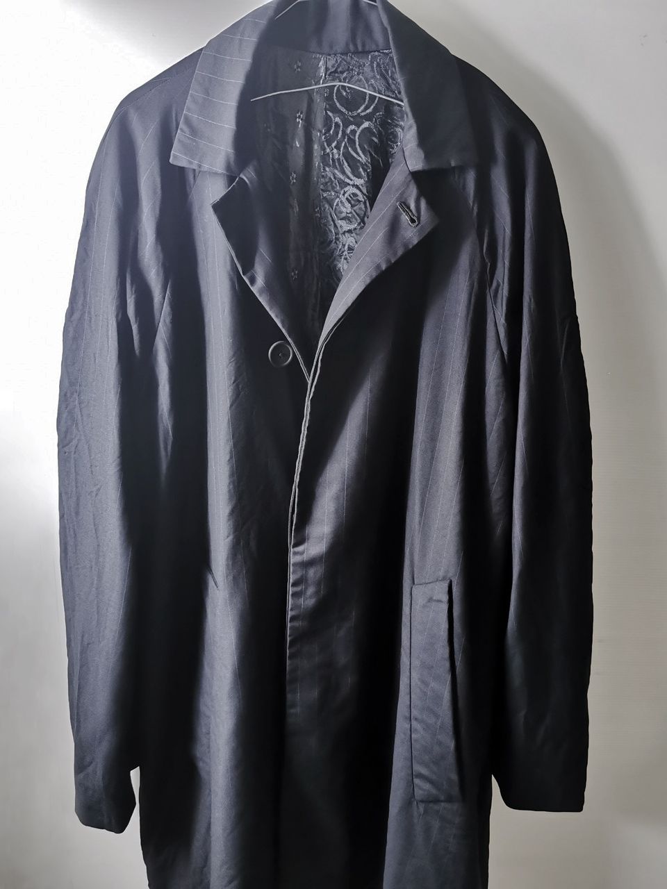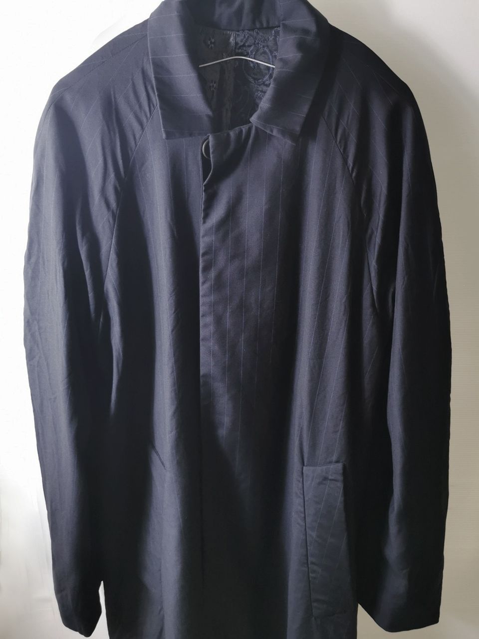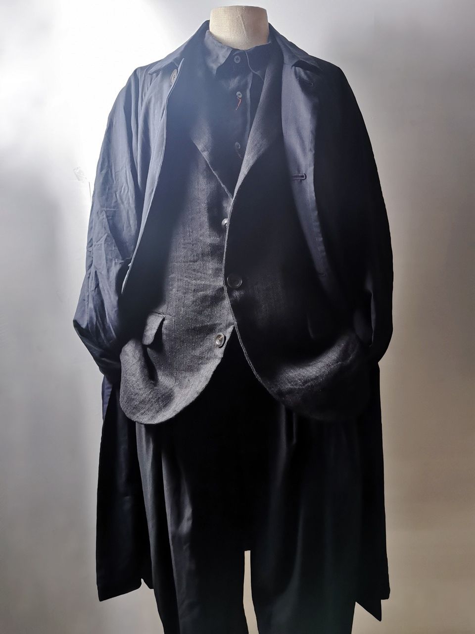 This special version of the super limited edition GBS Evolution VI.2 EV6WC01 handmade relaxed-fit balcaman coat design is one of only 2 pieces of its kind made by hand in the entire world. It was created from our modified early 1980’s Italian wide shoulder raglan sleeve medium-length fly-front coat pattern, from our extensive tailoring research, and cut using a Super 130's pure extrafine luxury wool striped suiting cloth woven in Biella, Italy--the world's leading region for fine virgin wool fabric--combined with an exquisite GBS hand accident dyed lining composition story of hand cut jacquard viscosa luxury lining and pure cupro sleeve lining fabrics woven by Ezio Ghiringhelli in Varese, and individually specially multiple hand accident dyed, washed and treated in our world-famous GBS Superworkrooms using a series of complex proprietary processes that required over 17 hours of expert work for the single piece to achieve its special lining colors, patina effects, shaping drape and softness. The design features expertly tailored invisible seamless fly-front construction with classic raglan sleeve styling, rounded button tab sleeve cuff details, specially reproduced hand cut and built pockets from the original design, beautifully all clean-finished fully-lined interior, generous 2,5 centimeter seam allowances on major fitting seams that allow the coat to be altered, remarkable real horn incision-cut design buttons made for us by the world's greatest living button-makers--Claudio and Cinzia Fontana in Parma--and no less than 8 of our signature real hand-stitched buttonholes (that required at least 10-14 minutes to create each one) in luxurious pure silk Bozzolo Reale Milano Seta thread. The piece also features our world leading pure silk natural hand dyed label created exclusively for us by Mion SpA in Torreglia which is the first label in the luxury industry to completely eliminate plastic polyester yarns in it--beautifully attached entirely by hand using pure silk threads.