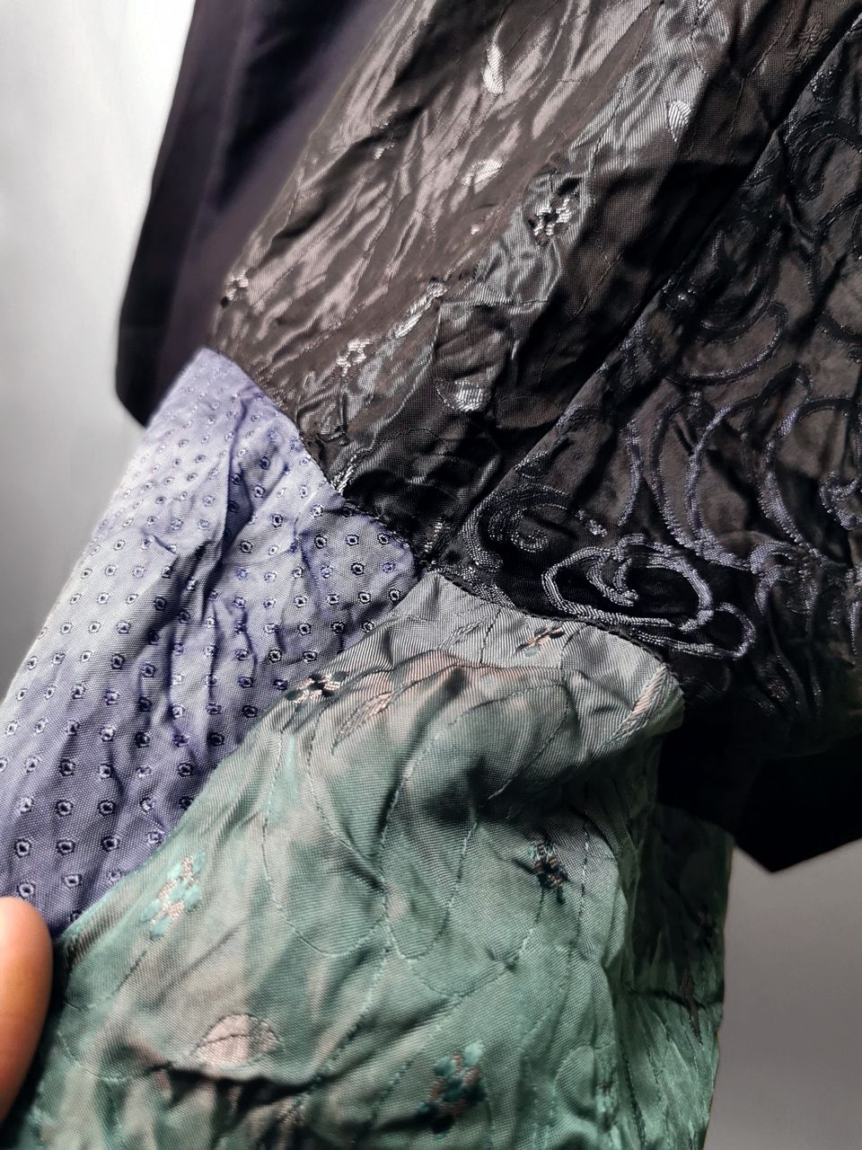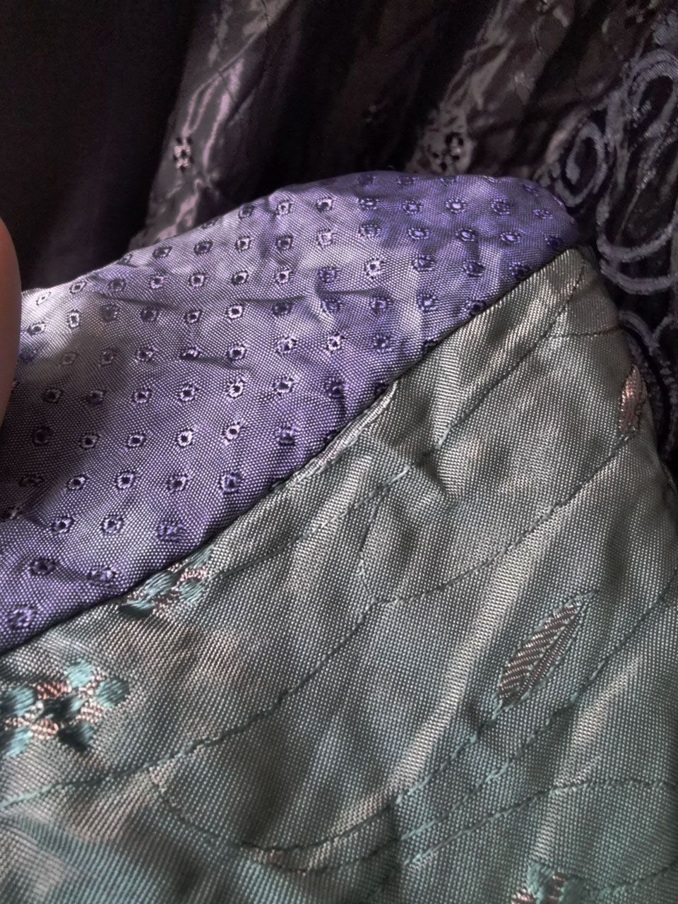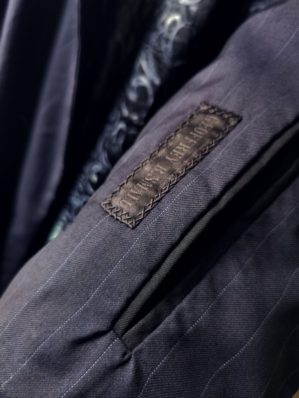 ...combined with an exquisite GBS hand accident dyed lining composition story of hand cut jacquard viscosa luxury lining and pure cupro sleeve lining fabrics woven by Ezio Ghiringhelli in Varese, and individually specially multiple hand accident dyed, washed and treated in our world-famous GBS Superworkrooms using a series of complex proprietary processes that required over 17 hours of expert work for the single piece to achieve its special lining colors, patina effects, shaping drape and softness...