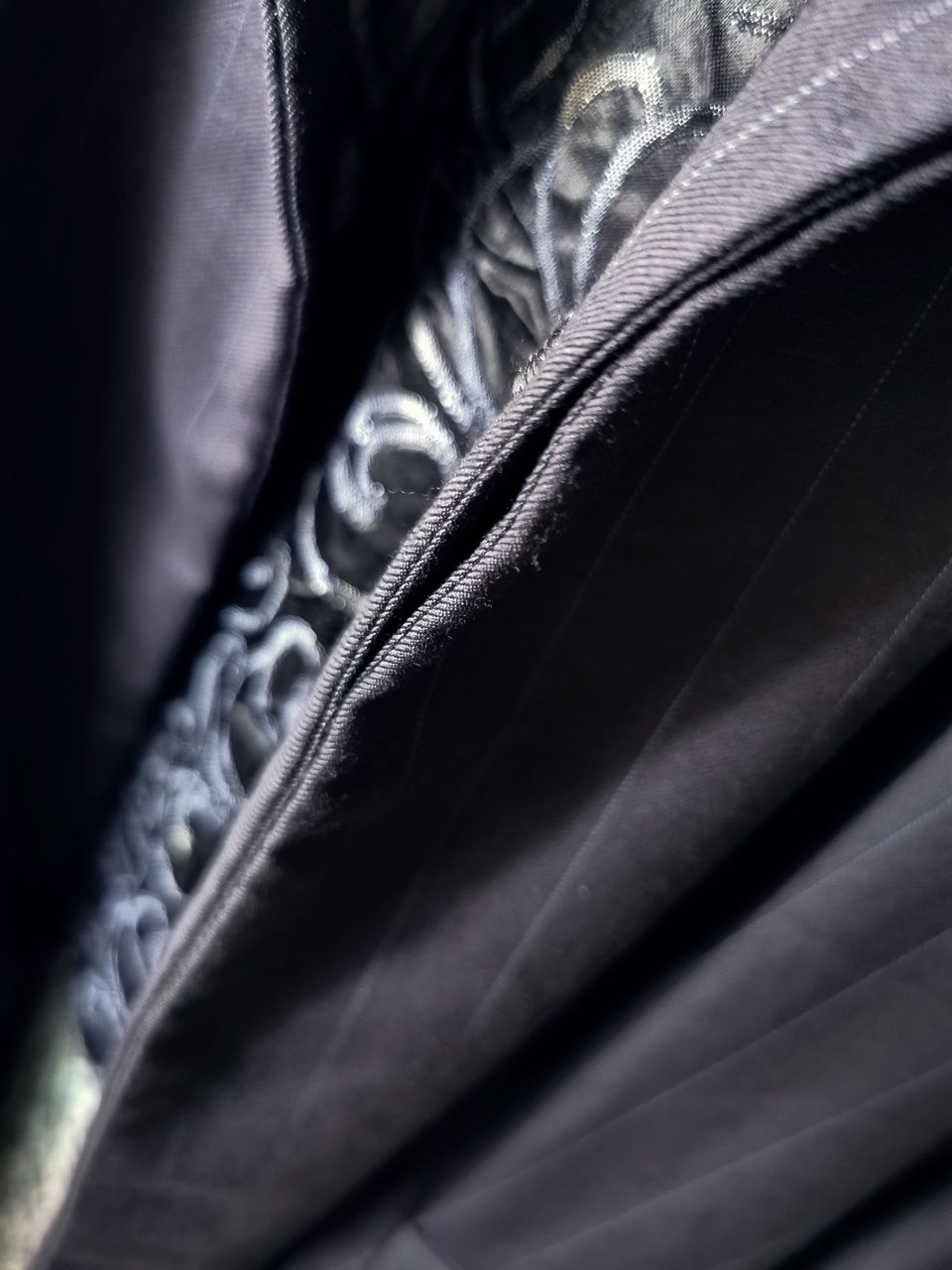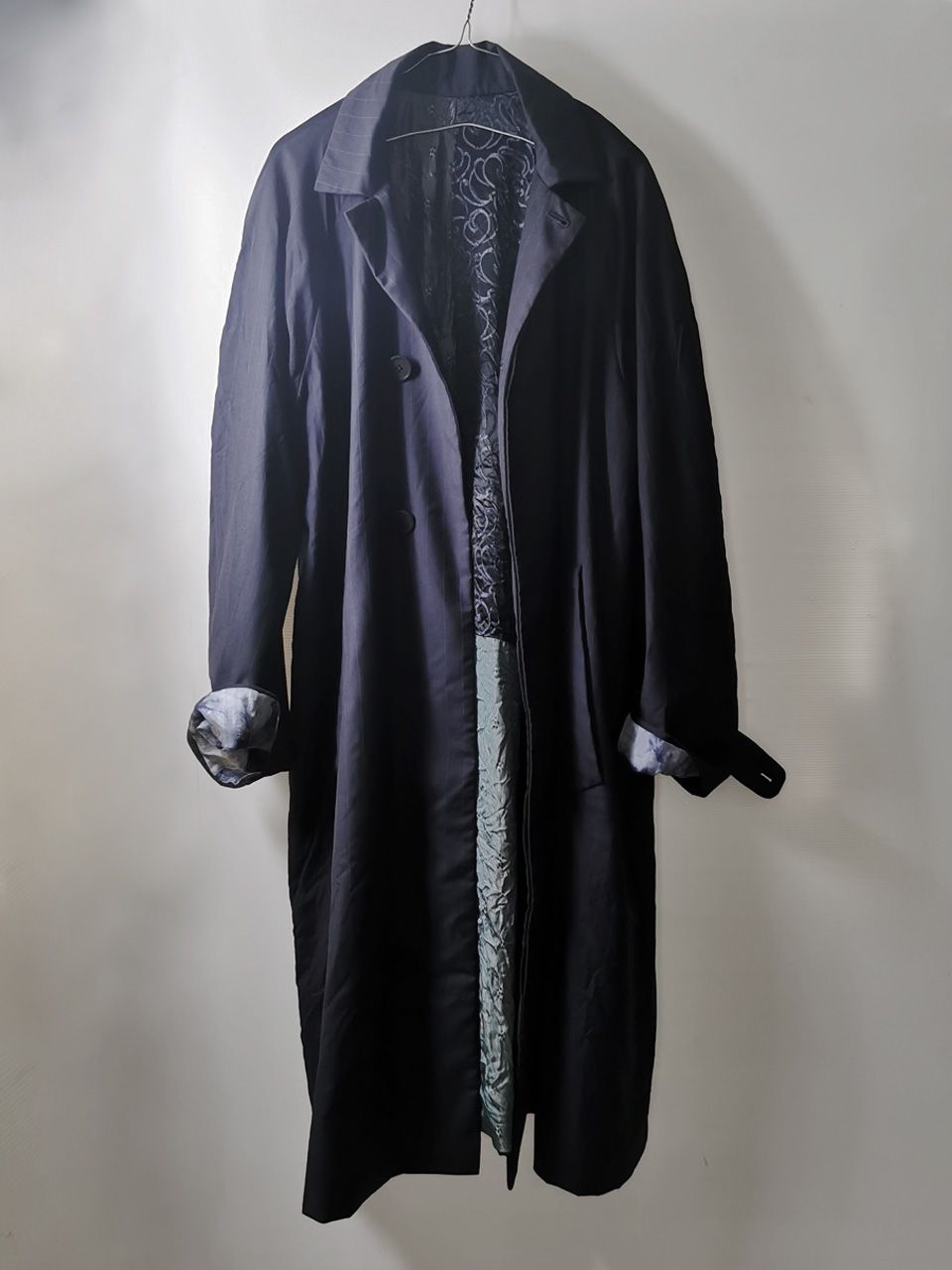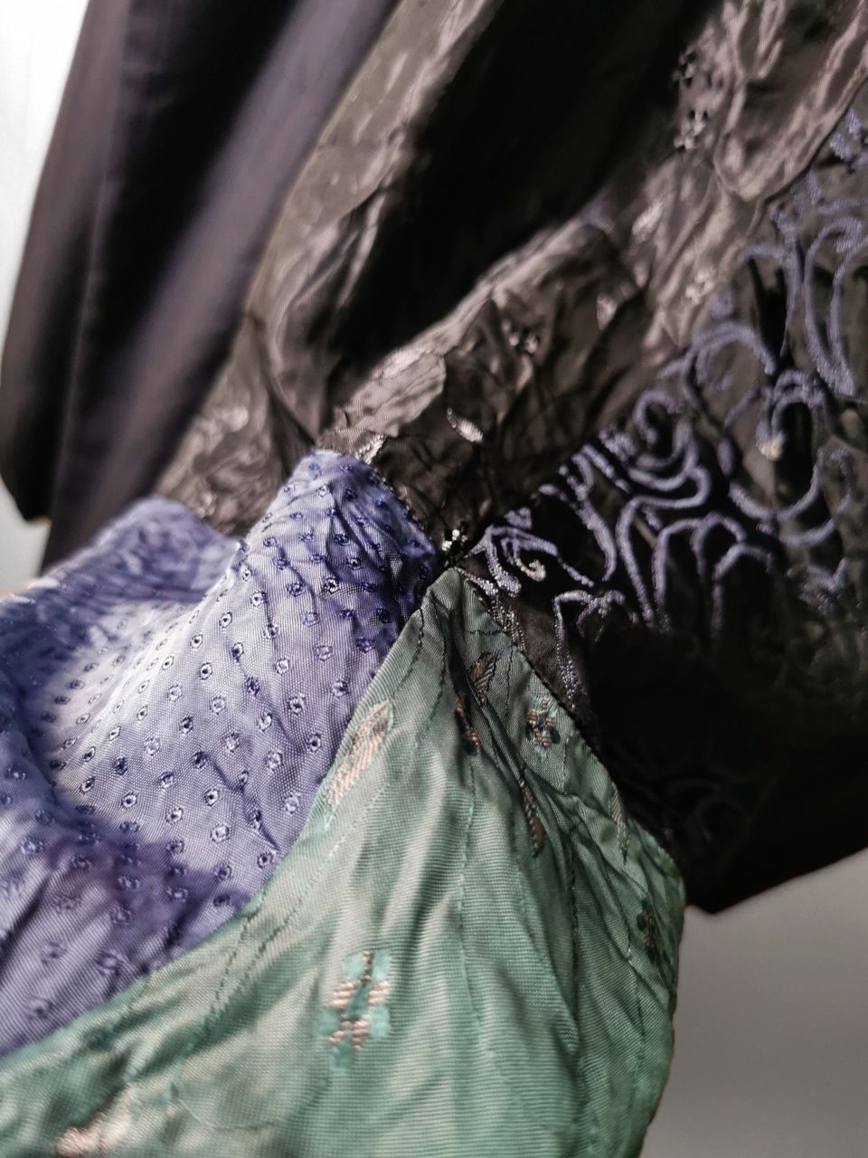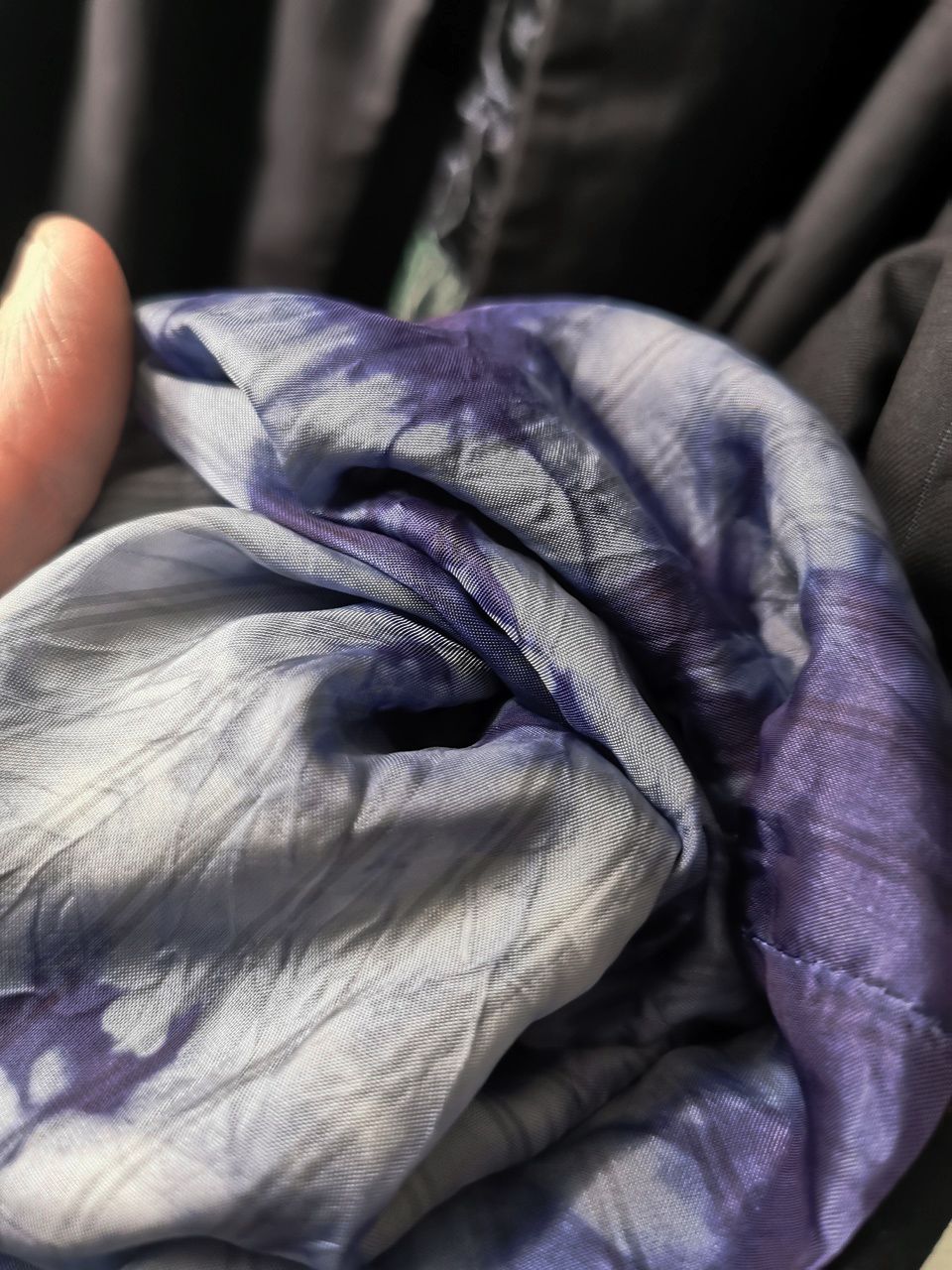 ...combined with an exquisite GBS hand accident dyed lining composition story of hand cut jacquard viscosa luxury lining and pure cupro sleeve lining fabrics woven by Ezio Ghiringhelli in Varese, and individually specially multiple hand accident dyed, washed and treated in our world-famous GBS Superworkrooms using a series of complex proprietary processes that required over 17 hours of expert work for the single piece to achieve its special lining colors, patina effects, shaping drape and softness...
