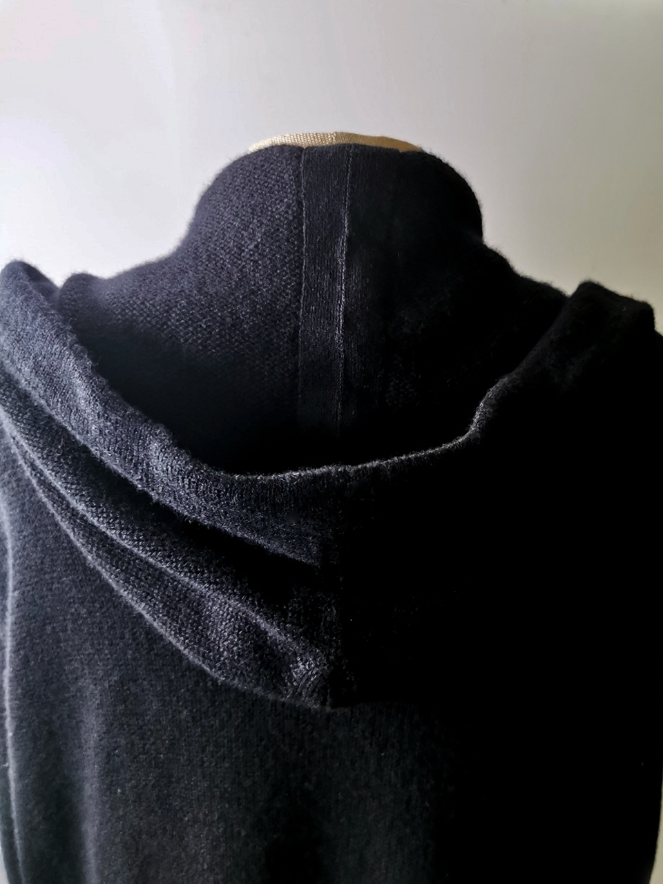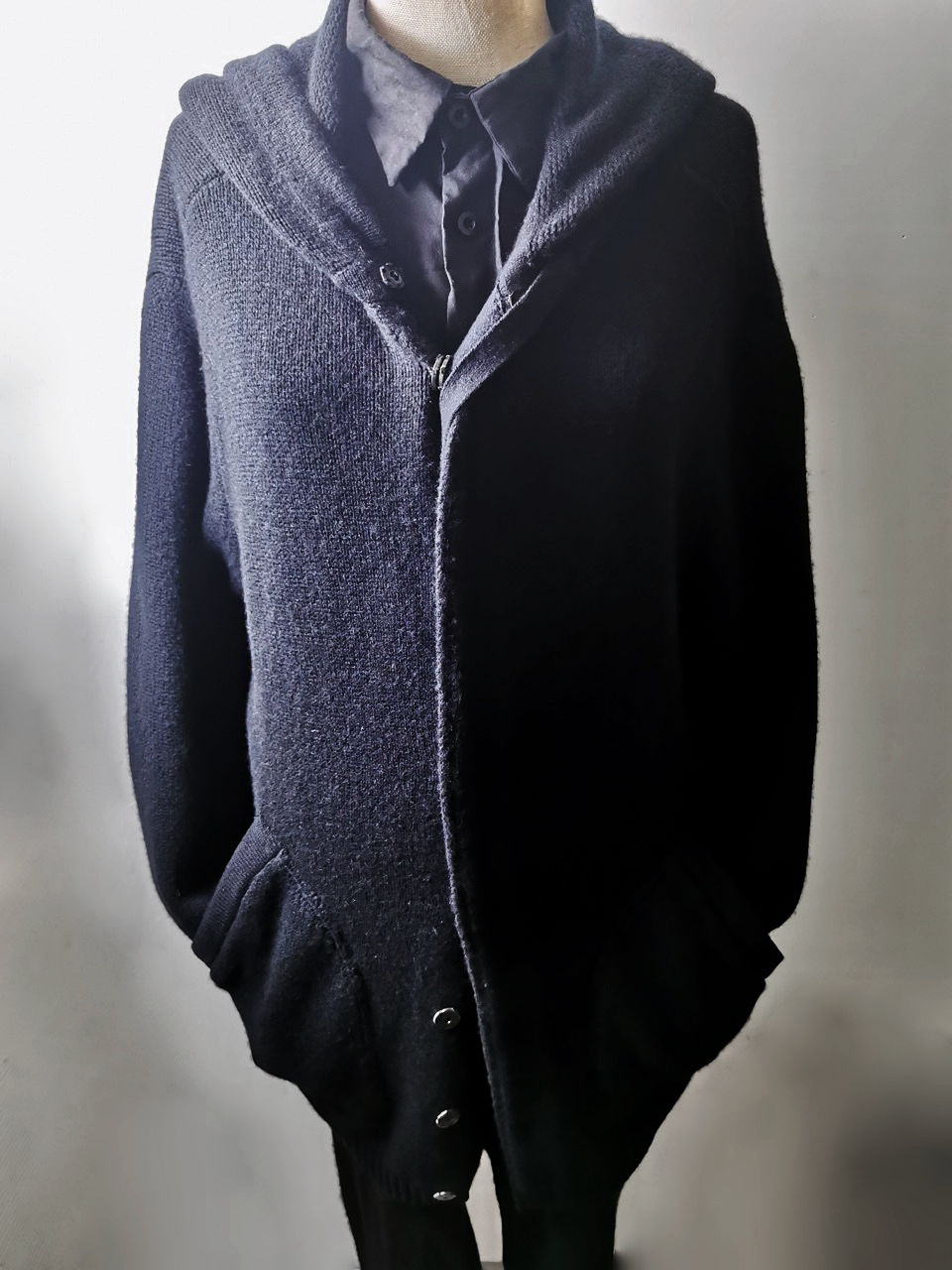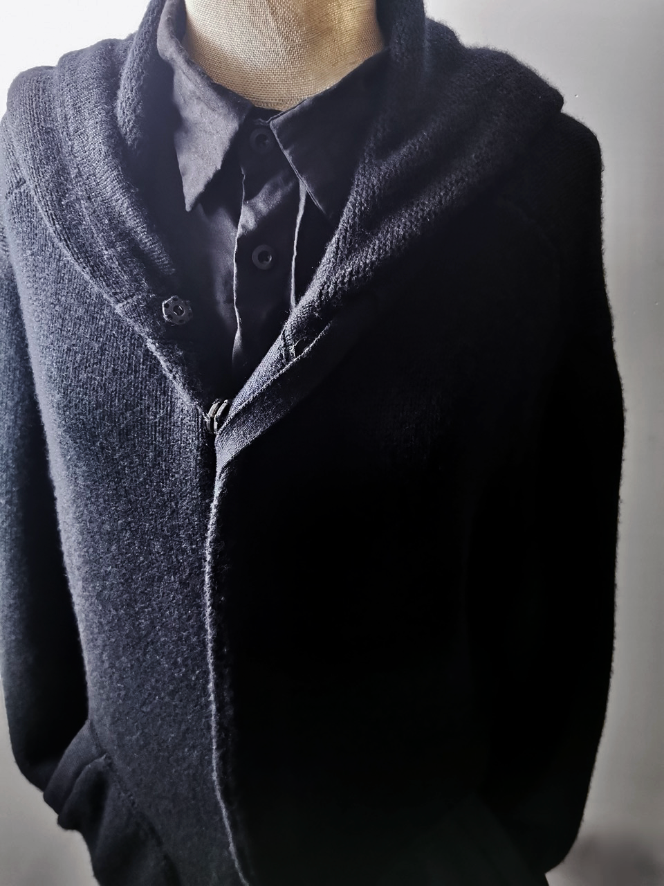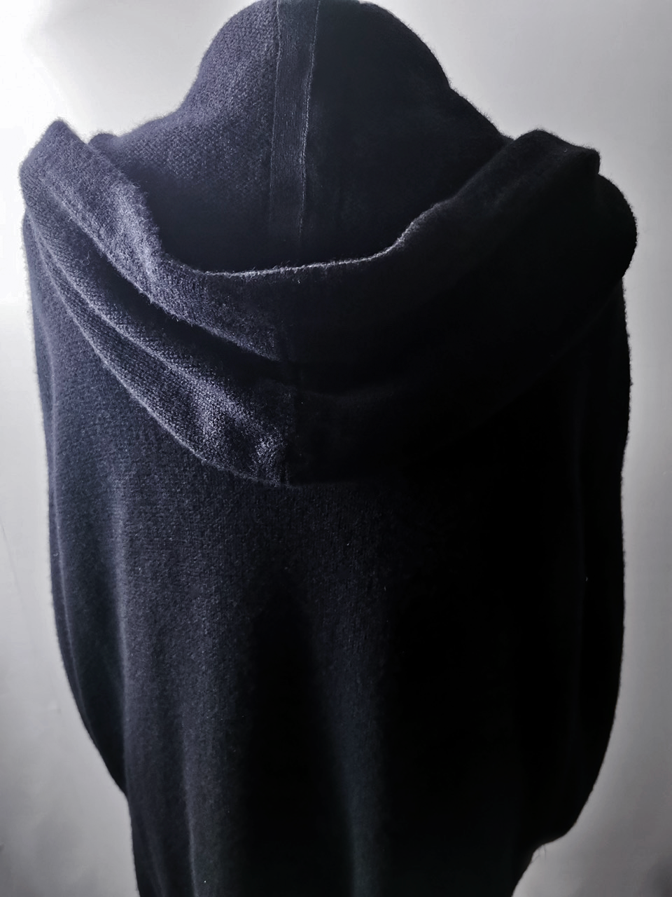 THIS super limited EVW7K02 extreme artisanal production GBS Evolution VIII supersweater design is one of only 2 pieces of its kind currently made in the entire world, each created exclusively for Labels in Sittard, Netherlands from a specially developed elongated proportion “extensionism” hooded cardigan sweater pattern developed from our extensive tailoring and technologies research with an extended length minimalist hooded hidden-button front slim-fitting cardigan sweater concept pattern, and expertly knit using classic fully fashioned construction techniques by the Sella family of master knitters in Cavarzere Venezia and over 830 grams of pure Mongolian cashmere ultralux yarn from Italy’s most prestigious cashmere yarn maker, the Cariaggi Lanificio in Cagli Pesaro e Urbino that provides 10 times more insulating power than normal wool. The special knitwear design was then specially individually dyed and treated by hand in our world-famous GBS Superworkrooms at Cavarzere Venezia to achieve its beautiful midnight colors, patina effects, incredible drape, shaping and softness...and will get even softer over time with natural use. The design features all the hallmarks of the very best in Italian knitwear craftsmanship from its impeccable seamless one piece build entirely made from scratch with no sewing seams or cutting to the exquisitely executed “costina” rib-knit sections, “calatura” 4 into 2 shoulder seam and armhole shaping, beautifully clean finished zipper installation, front patch pocket application, and interior hood finishing work- all done entirely by hand with matching Cariaggi cashmere yarn knit trimmings-- plus handsewn pure silk hood strap loops, and no less than 8 spectacular advanced real horn automatica pressure snap button designs made only for us by the world’s greatest living buttonmakers—Claudio and Cinzia Fontana in Parma, each handsewn in pure silk Bozzolo Reale Milano Seta threads (which required at least 17-22 minutes to attach each one, over 2 hours of expert work just on the button attachments alone for a single sweater). The piece also features our world leading pure silk hand dyed label created exclusively for us by Mion SpA in Torreglia which is the first label in the luxury industry to completely eliminate plastic polyester yarns in it, which was specially hand dyed to achieve its beautiful color and lustre and exquisitely attached and sewn in by hand using luxurious pure silk Bozzolo Reale Milano Seta threads.