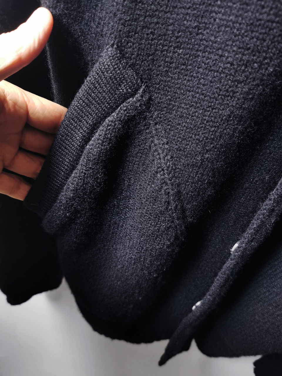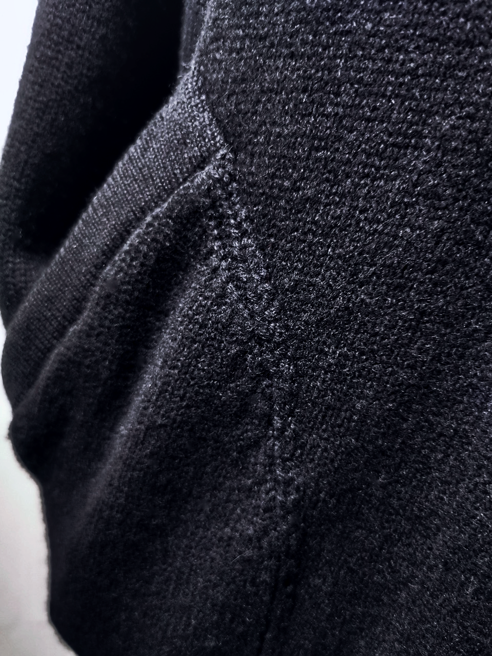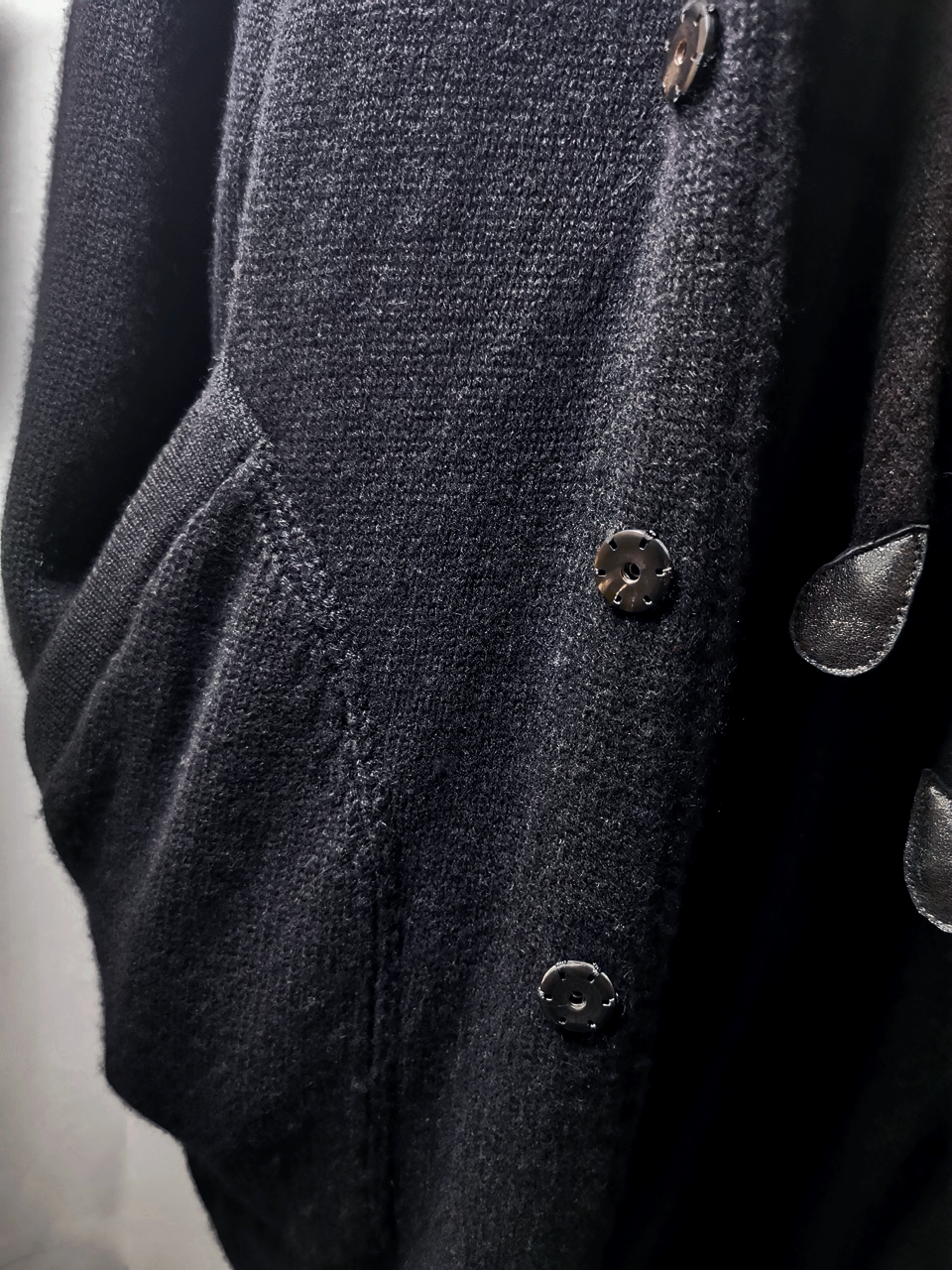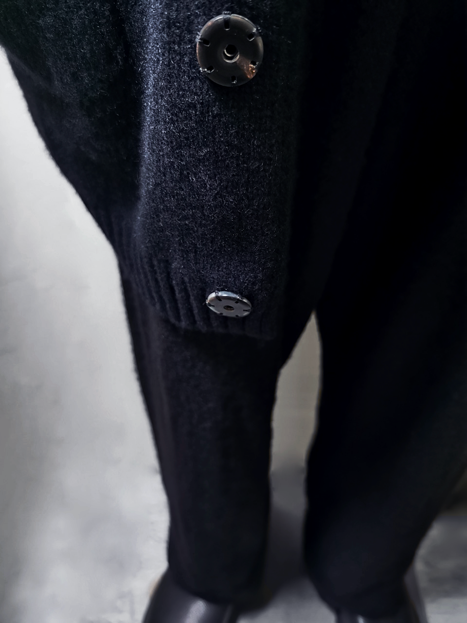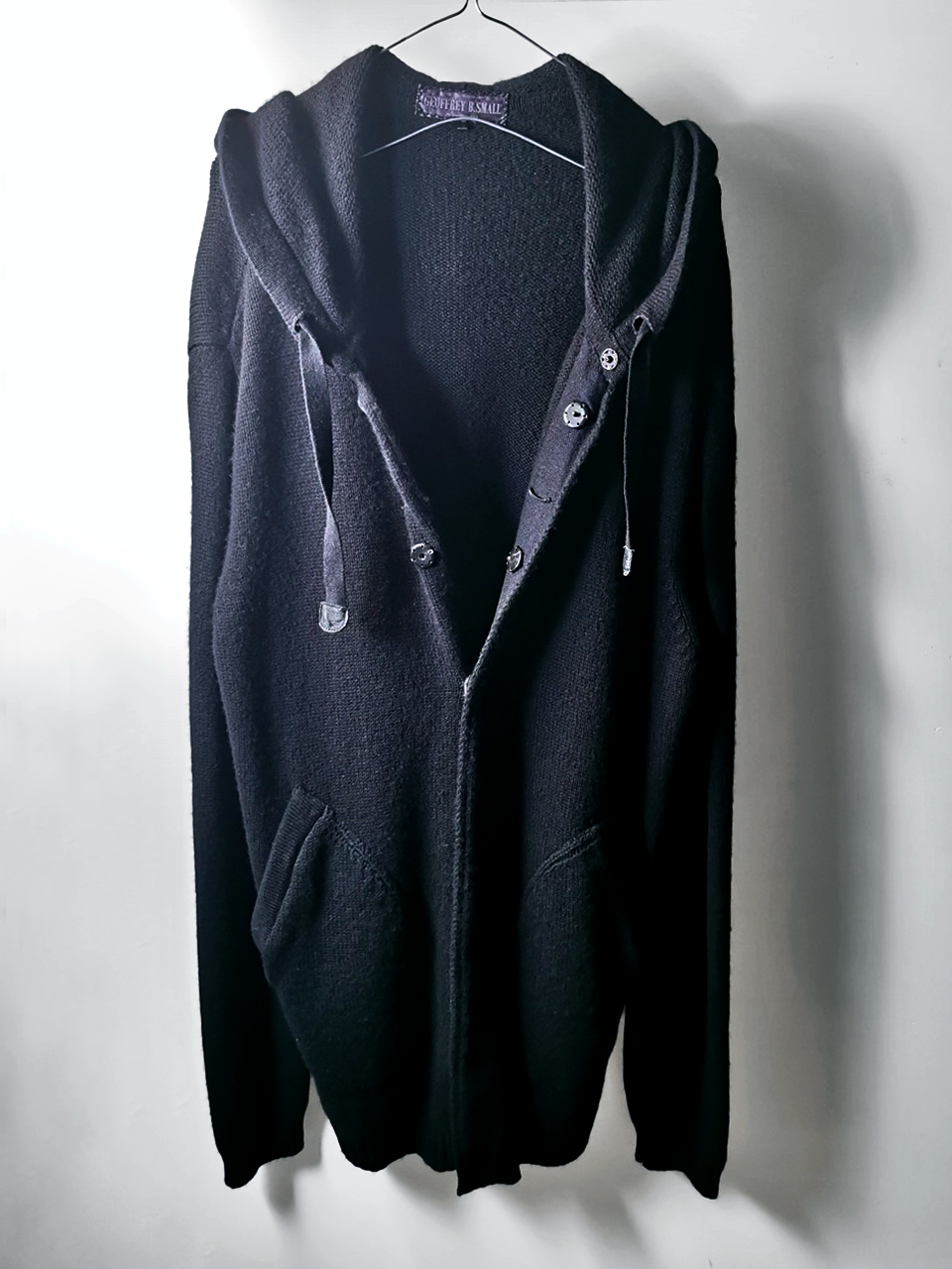 THIS super limited EVW7K02 extreme artisanal production GBS Evolution VIII supersweater design is one of only 2 pieces of its kind currently made in the entire world, each created exclusively for Labels in Sittard, Netherlands from a specially developed elongated proportion “extensionism” hooded cardigan sweater pattern developed from our extensive tailoring and technologies research with an extended length minimalist hooded hidden-button front slim-fitting cardigan sweater concept pattern, and expertly knit using classic fully fashioned construction techniques by the Sella family of master knitters in Cavarzere Venezia and over 830 grams of pure Mongolian cashmere ultralux yarn from Italy’s most prestigious cashmere yarn maker, the Cariaggi Lanificio in Cagli Pesaro e Urbino that provides 10 times more insulating power than normal wool. The special knitwear design was then specially individually dyed and treated by hand in our world-famous GBS Superworkrooms at Cavarzere Venezia to achieve its beautiful midnight colors, patina effects, incredible drape, shaping and softness...and will get even softer over time with natural use. The design features all the hallmarks of the very best in Italian knitwear craftsmanship from its impeccable seamless one piece build entirely made from scratch with no sewing seams or cutting to the exquisitely executed “costina” rib-knit sections, “calatura” 4 into 2 shoulder seam and armhole shaping, beautifully clean finished zipper installation, front patch pocket application, and interior hood finishing work- all done entirely by hand with matching Cariaggi cashmere yarn knit trimmings-- plus handsewn pure silk hood strap loops, and no less than 8 spectacular advanced real horn automatica pressure snap button designs made only for us by the world’s greatest living buttonmakers—Claudio and Cinzia Fontana in Parma, each handsewn in pure silk Bozzolo Reale Milano Seta threads (which required at least 17-22 minutes to attach each one, over 2 hours of expert work just on the button attachments alone for a single sweater). The piece also features our world leading pure silk hand dyed label created exclusively for us by Mion SpA in Torreglia which is the first label in the luxury industry to completely eliminate plastic polyester yarns in it, which was specially hand dyed to achieve its beautiful color and lustre and exquisitely attached and sewn in by hand using luxurious pure silk Bozzolo Reale Milano Seta threads.