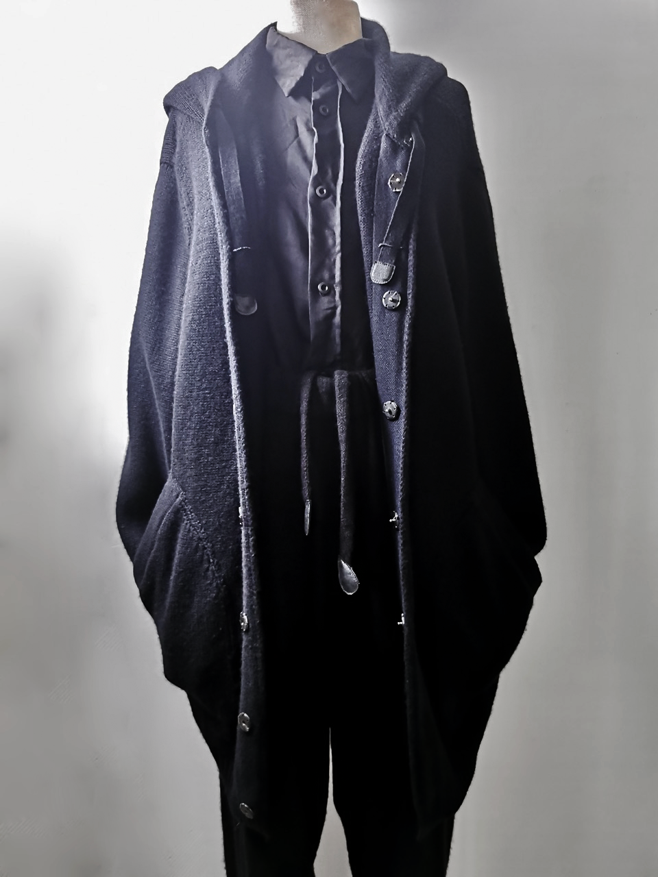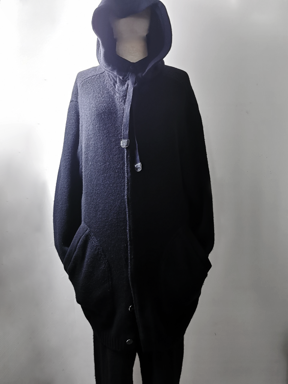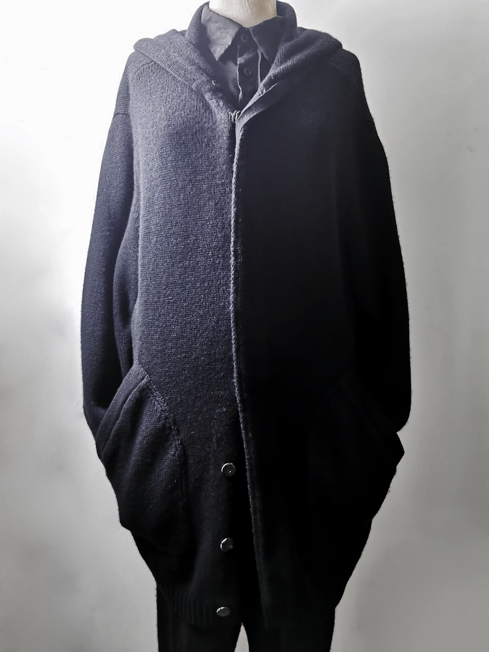 The amazing EV7K02 hyperlux advanced knitwear design is based upnn a specially developed elongated proportion “extensionism” hooded cardigan sweater pattern developed from our extensive tailoring and technologies research with an extended length minimalist hooded hidden-button front slim-fitting cardigan sweater concept pattern...