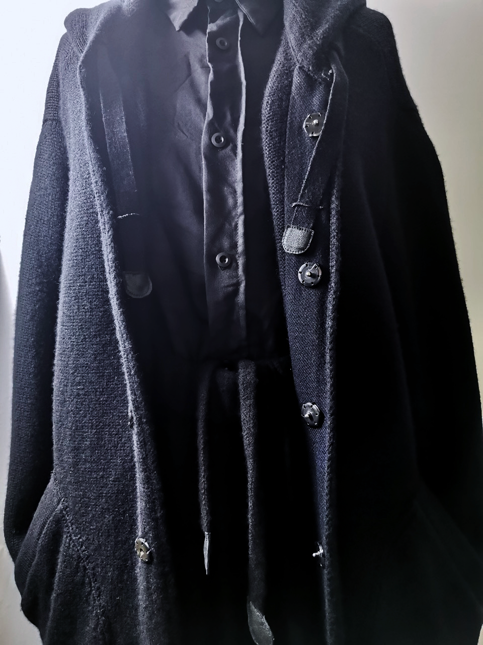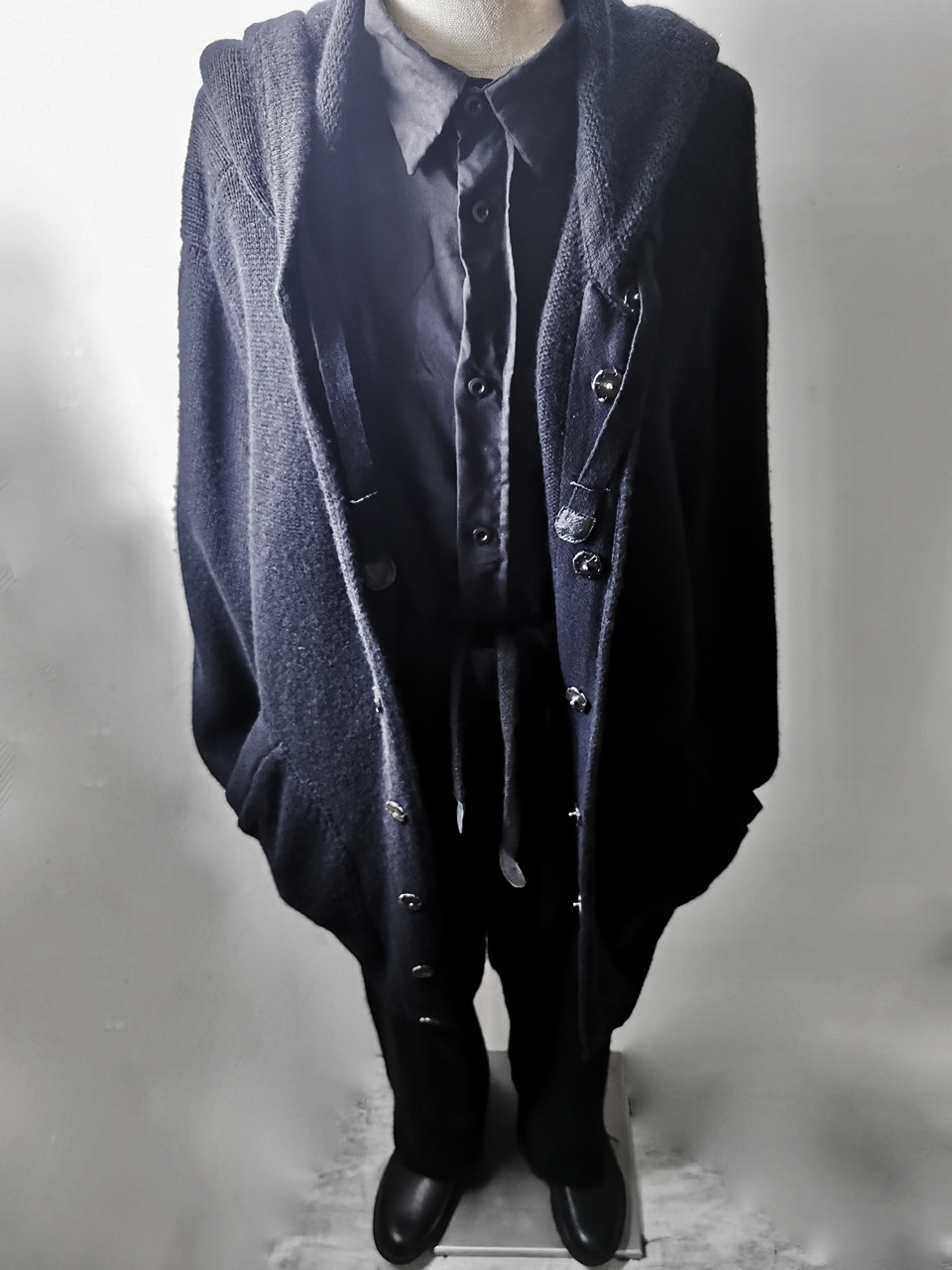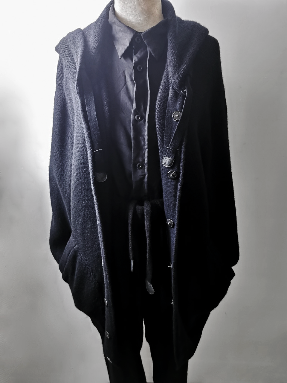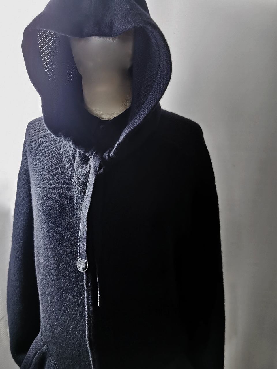 The amazing EV7K02 hyperlux advanced knitwear design is based upnn a specially developed elongated proportion “extensionism” hooded cardigan sweater pattern developed from our extensive tailoring and technologies research with an extended length minimalist hooded hidden-button front slim-fitting cardigan sweater concept pattern...