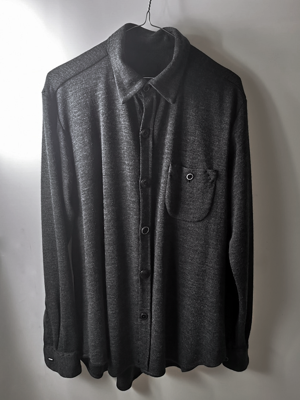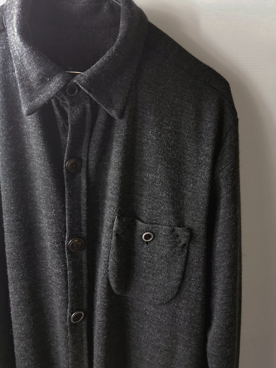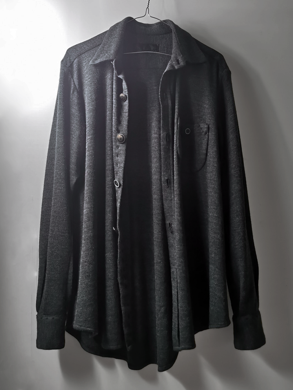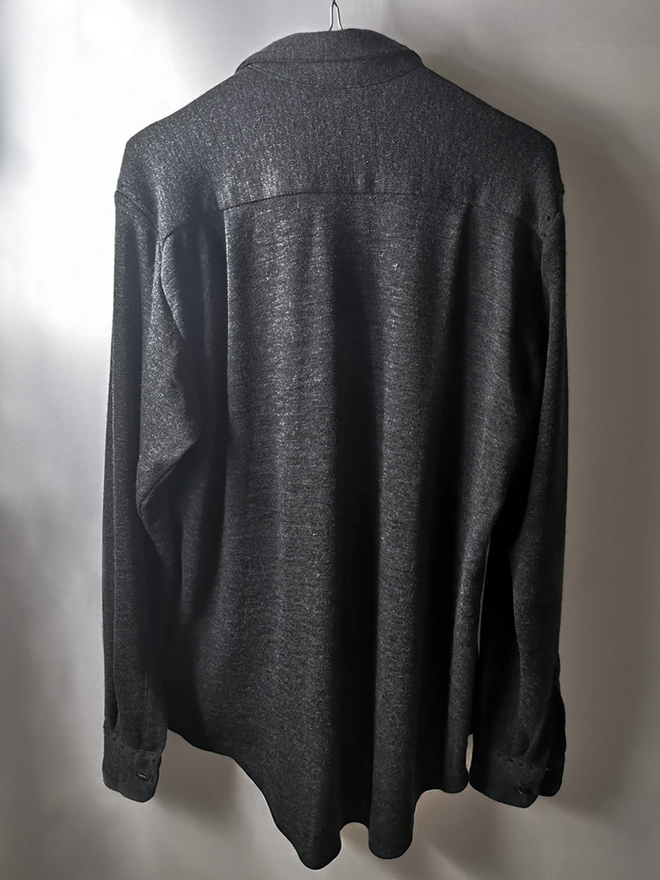 This special charcoal grey version of the super limited edition GBS Evolution VIII EV8K03 knit shirt cardigan design is one of only 5 pieces of its kind made in the entire world, each exclusively for Darklands in Berlin from a modified “extensionism” collection version of a classic European cut tailored men’s shirt pattern from our extensive tailoring research, and cut using an exclusive extrafine lightweight 300-320 gram pure virgin Merino wool fine jersey luxury knit suiting cloth created in Biella Italy, the world’s leading region for fine wool cloth production, then painstakingly washed, shaped and treated by hand in our world-famous GBS Superworkrooms at Cavarzere Venezia for extra aging, drape, flow and softness. The design features beautiful extensive entirely handstitched embroidery detail work using precious pure Cariaggi Italian deluxe cashmere yarns throughout the piece on center front, sleeve cuffs, pocket, and shoulder seams, a special cut with elegant proportions, exquisitely crafted tailored seamless pocket design, impeccable clean-finished French-seamed interior and all single-needle construction; extraordinary real corozo and bone button designs made for us by the world’s greatest living buttonmakers—Claudio and Cinzia Fontana in Parma and our signature hand-stitched buttonholes in pure silk Bozzolo Reale Milano Seta threads (which required at least 10-14 minutes to create each one on the challenging knit jersey fabric). The piece also features our world leading pure silk label created exclusively for us by Mion SpA in Torreglia- the first label in the luxury industry to completely eliminate plastic polyester yarns in it which was hand dyed to achieve its beautiful color and lustre and exquisitely attached by hand using pure silk threads. Variations in color and color density are not imperfections or irregularities, but specific characteristics of this special handmaking technique. Please treat buttons and buttonholes with care. We recommend professional clean only or hand wash extra gentle in cold water. Do not put in machine washer or dryer.