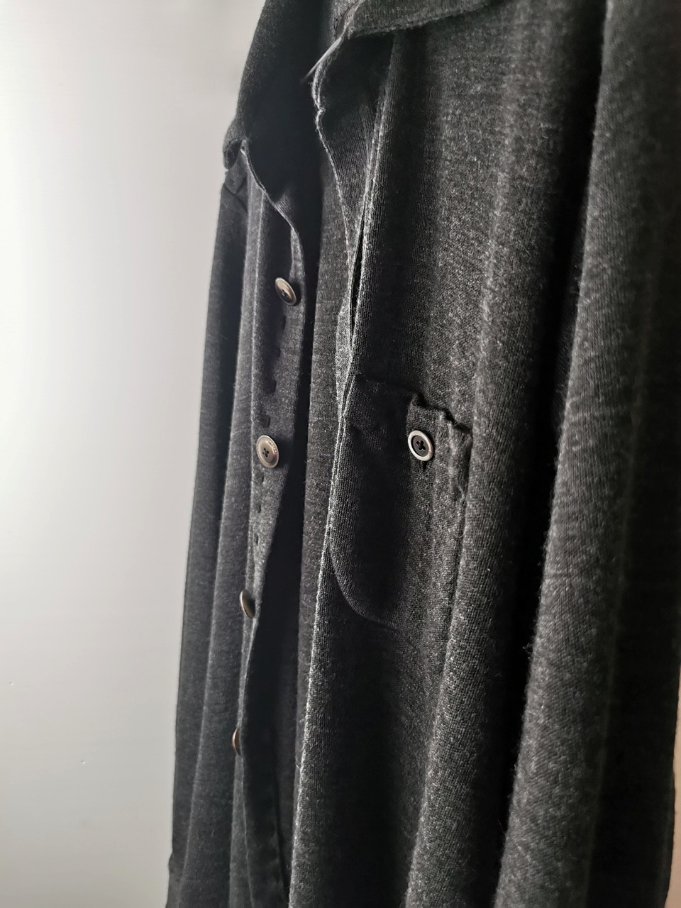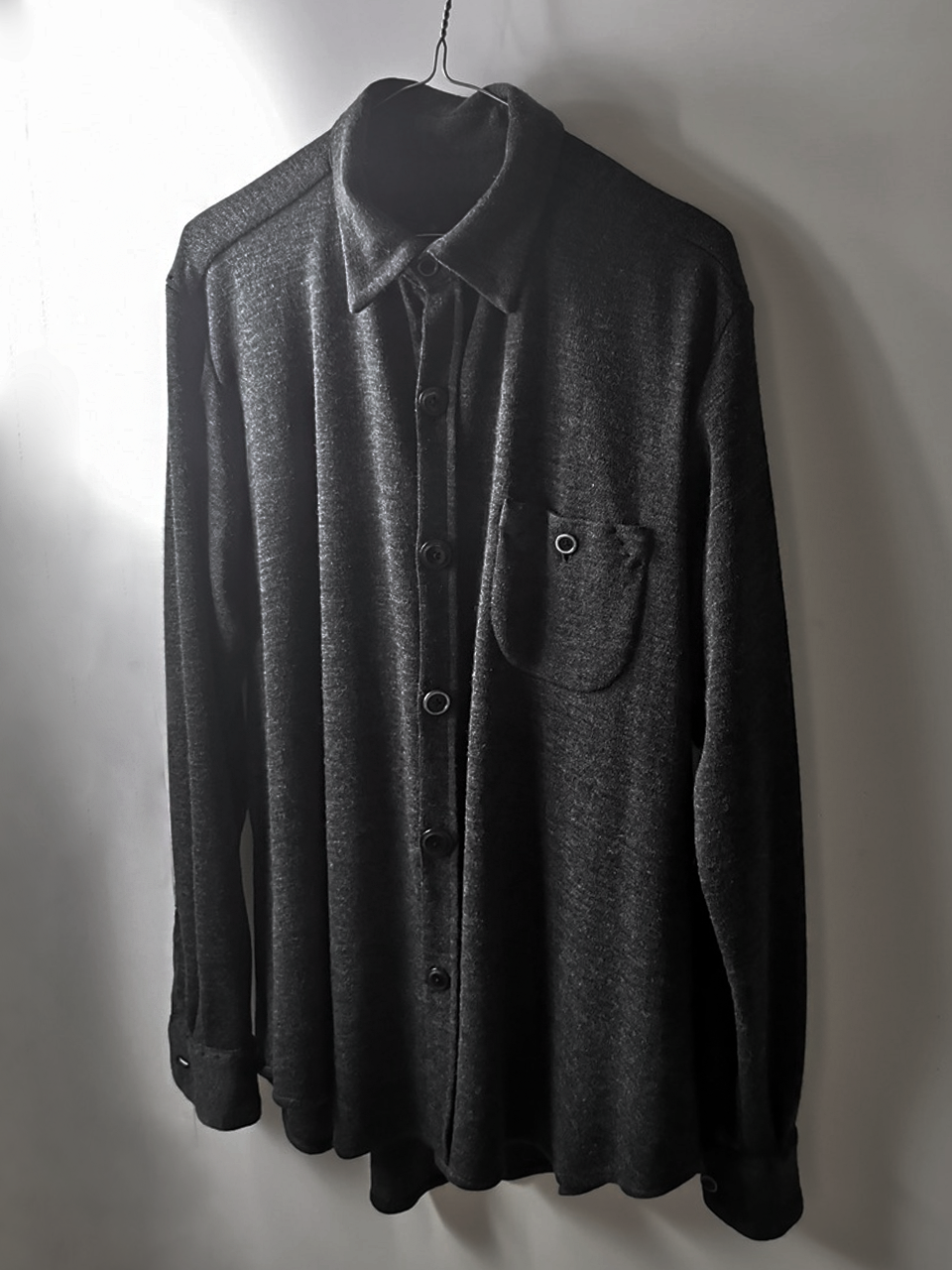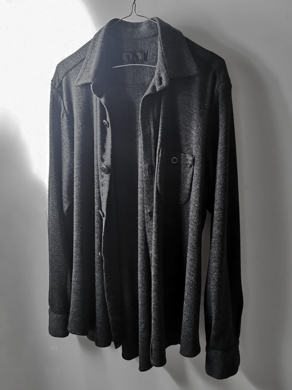 This special charcoal grey version of the super limited edition GBS Evolution VIII EV8K03 knit shirt cardigan design is one of only 5 pieces of its kind made in the entire world, each exclusively for Darklands in Berlin from a modified “extensionism” collection version of a classic European cut tailored men’s shirt pattern from our extensive tailoring research, and cut using an exclusive extrafine lightweight 300-320 gram pure virgin Merino wool fine jersey luxury knit suiting cloth created in Biella Italy, the world’s leading region for fine wool cloth production, then painstakingly washed, shaped and treated by hand in our world-famous GBS Superworkrooms at Cavarzere Venezia for extra aging, drape, flow and softness. The design features beautiful extensive entirely handstitched embroidery detail work using precious pure Cariaggi Italian deluxe cashmere yarns throughout the piece on center front, sleeve cuffs, pocket, and shoulder seams, a special cut with elegant proportions, exquisitely crafted tailored seamless pocket design, impeccable clean-finished French-seamed interior and all single-needle construction; extraordinary real corozo and bone button designs made for us by the world’s greatest living buttonmakers—Claudio and Cinzia Fontana in Parma and our signature hand-stitched buttonholes in pure silk Bozzolo Reale Milano Seta threads (which required at least 10-14 minutes to create each one on the challenging knit jersey fabric). The piece also features our world leading pure silk label created exclusively for us by Mion SpA in Torreglia- the first label in the luxury industry to completely eliminate plastic polyester yarns in it which was hand dyed to achieve its beautiful color and lustre and exquisitely attached by hand using pure silk threads. Variations in color and color density are not imperfections or irregularities, but specific characteristics of this special handmaking technique. Please treat buttons and buttonholes with care. We recommend professional clean only or hand wash extra gentle in cold water. Do not put in machine washer or dryer.