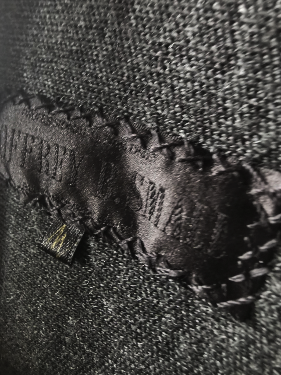 ...The piece also features our world leading pure silk label created exclusively for us by Mion SpA in Torreglia- the first label in the luxury industry to completely eliminate plastic polyester yarns in it which was hand dyed to achieve its beautiful color and lustre and exquisitely attached by hand using pure silk threads...