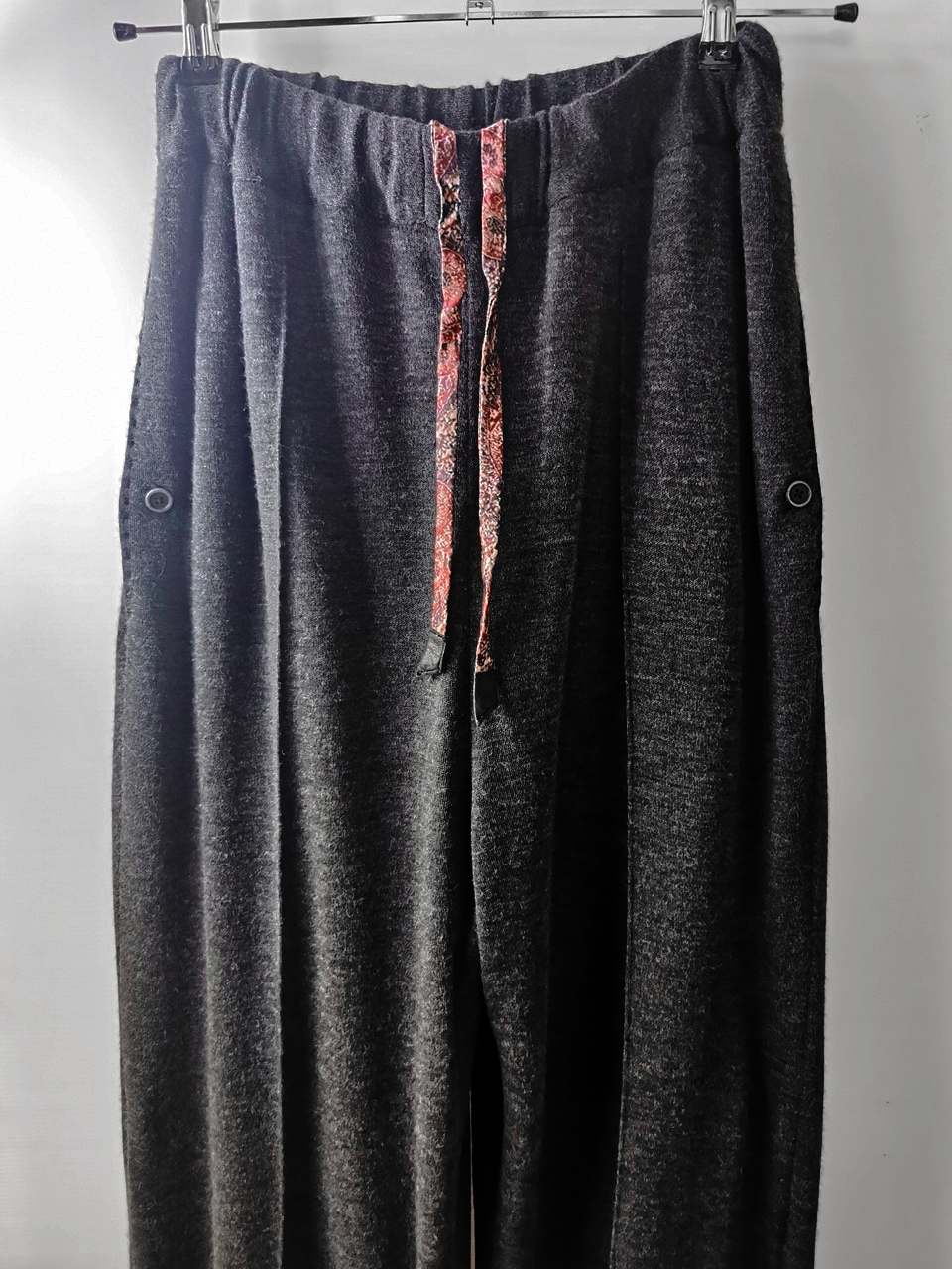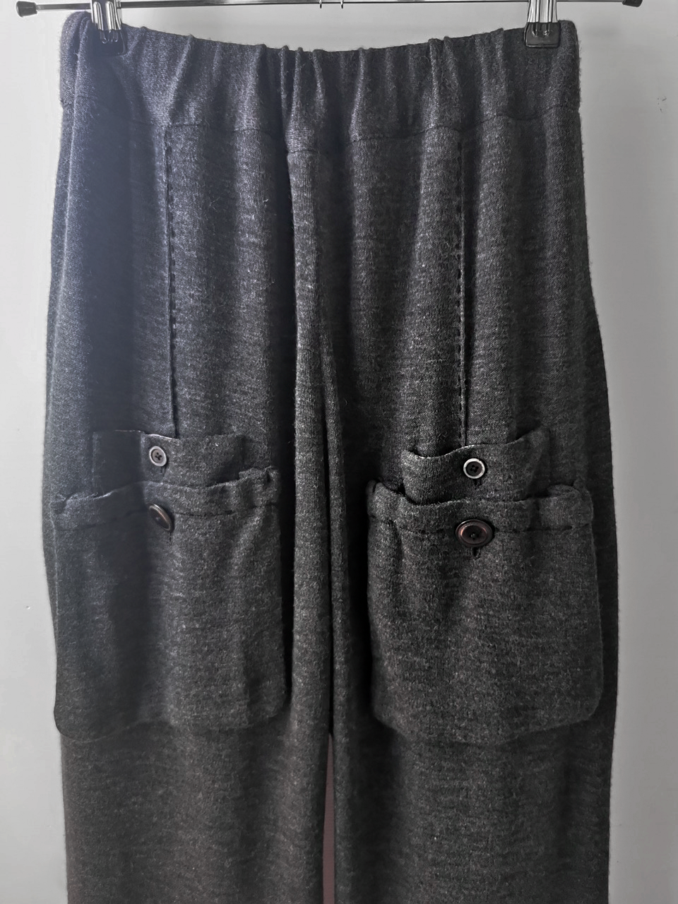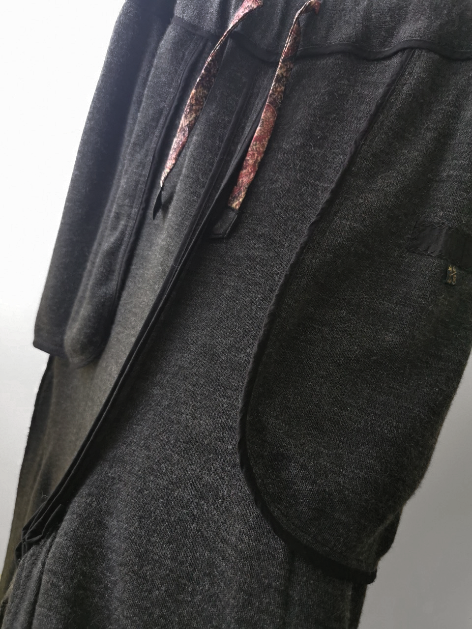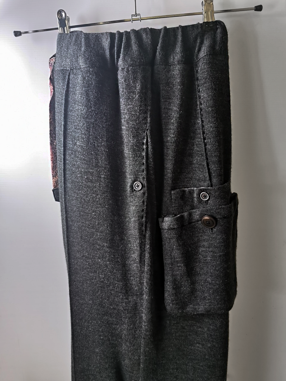 This special charcoal grey version of the super limited edition GBS Evolution VIII EV8P01 trouser design is one of only 5 pieces of its kind made in the entire world, each exclusively for Darklands in Berlin from a modified “extensionism” collection version of our 1970-80’s European Adi Dassler-type tracksuit tailored elastic drawstring waist trouser pattern from our extensive tailoring research, and cut using an exclusive extrafine lightweight 300-320 gram pure virgin Merino wool fine jersey luxury knit suiting cloth created in Biella Italy, the world’s leading region for fine wool cloth production, then painstakingly washed, shaped and treated by hand in our world-famous GBS Superworkrooms at Cavarzere Venezia for extra aging, drape, flow and softness. The design features extensive handstitched embroidery detail work using pure Cariaggi Italian deluxe cashmere yarns a special cut with elegant proportions, exquisitely crafted hand cut double patch back pocket design with impeccably tailored in-seam front pockets, beautiful interior finishing design incorporating an elegant pure Como silk drawstring fabric with vintage leather tip details, exquisite pure Como silk and Italian luxury satin tape finished seams throughout, generous 2,5 centimeter seam allowances on both outseam and inseam stitches that allow the trouser to be altered and let out a full size larger than its original cut, expertly executed elastic waist construction all performed by hand (unlike the original garment), and real hand sewn taped hemlines (not machined) that required over 2 hours of expert work to achieve their beautiful clean finish and superior durability and tailored elegance), extraordinary hand dyed real corozo and horn button designs made for us by the world’s greatest living buttonmakers—Claudio and Cinzia Fontana in Parma and our signature hand-stitched buttonholes in pure silk Bozzolo Reale Milano Seta threads (which required at least 10-14 minutes to create each one on the challenging knit jersey fabric). The piece also features our world leading hand dyed pure silk label created exclusively for us by Mion SpA in Torreglia- the first label in the luxury industry to completely eliminate plastic polyester yarns in it which was hand dyed to achieve its beautiful color and lustre and exquisitely attached by hand using pure silk threads. Variations in color and color density are not imperfections or irregularities, but specific characteristics of this special technique. Please treat buttons and buttonholes with care. We recommend professional clean only or hand wash extra gentle in cold water. Do not put in machine washer or dryer.