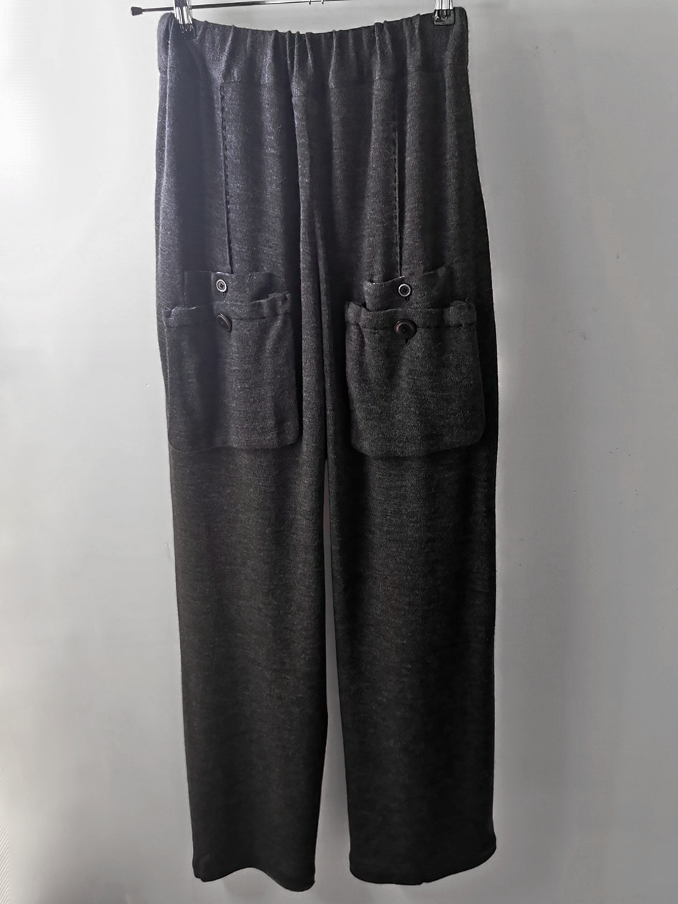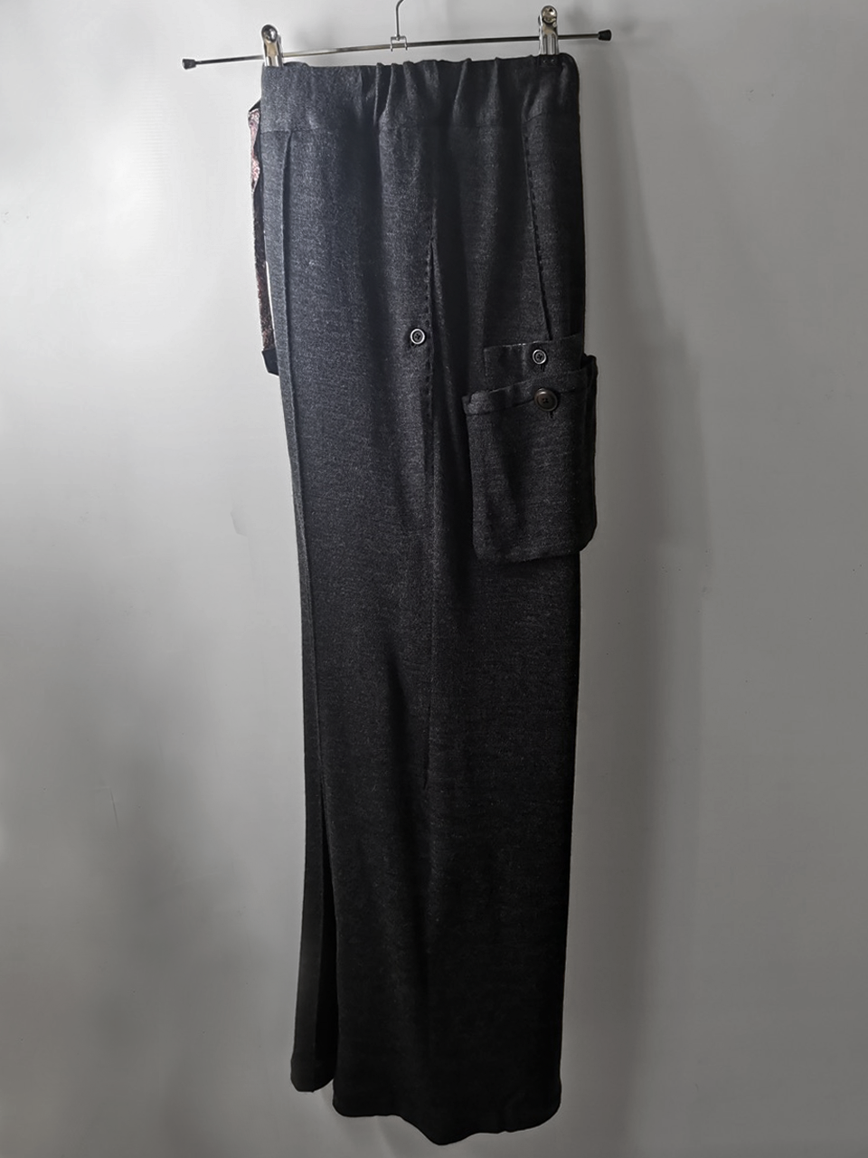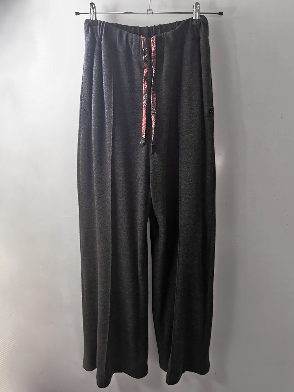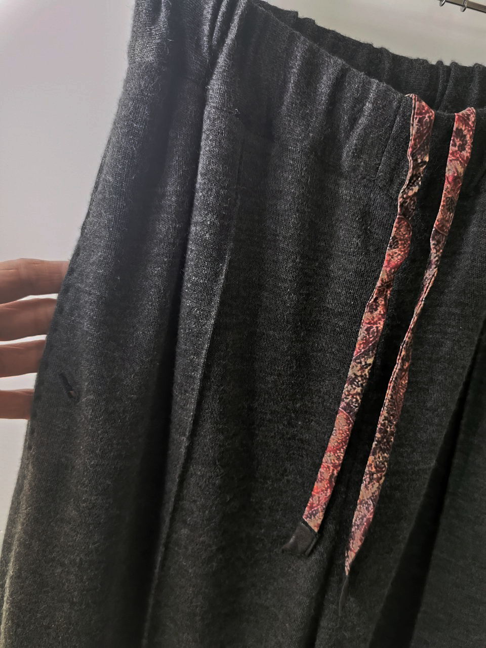 This special charcoal grey version of the super limited edition GBS Evolution VIII EV8P01 trouser design is one of only 5 pieces of its kind made in the entire world, each exclusively for Darklands in Berlin from a modified “extensionism” collection version of our 1970-80’s European Adi Dassler-type tracksuit tailored elastic drawstring waist trouser pattern from our extensive tailoring research, and cut using an exclusive extrafine lightweight 300-320 gram pure virgin Merino wool fine jersey luxury knit suiting cloth created in Biella Italy, the world’s leading region for fine wool cloth production, then painstakingly washed, shaped and treated by hand in our world-famous GBS Superworkrooms at Cavarzere Venezia for extra aging, drape, flow and softness. The design features extensive handstitched embroidery detail work using pure Cariaggi Italian deluxe cashmere yarns a special cut with elegant proportions, exquisitely crafted hand cut double patch back pocket design with impeccably tailored in-seam front pockets, beautiful interior finishing design incorporating an elegant pure Como silk drawstring fabric with vintage leather tip details, exquisite pure Como silk and Italian luxury satin tape finished seams throughout, generous 2,5 centimeter seam allowances on both outseam and inseam stitches that allow the trouser to be altered and let out a full size larger than its original cut, expertly executed elastic waist construction all performed by hand (unlike the original garment), and real hand sewn taped hemlines (not machined) that required over 2 hours of expert work to achieve their beautiful clean finish and superior durability and tailored elegance), extraordinary hand dyed real corozo and horn button designs made for us by the world’s greatest living buttonmakers—Claudio and Cinzia Fontana in Parma and our signature hand-stitched buttonholes in pure silk Bozzolo Reale Milano Seta threads (which required at least 10-14 minutes to create each one on the challenging knit jersey fabric). The piece also features our world leading hand dyed pure silk label created exclusively for us by Mion SpA in Torreglia- the first label in the luxury industry to completely eliminate plastic polyester yarns in it which was hand dyed to achieve its beautiful color and lustre and exquisitely attached by hand using pure silk threads. Variations in color and color density are not imperfections or irregularities, but specific characteristics of this special technique. Please treat buttons and buttonholes with care. We recommend professional clean only or hand wash extra gentle in cold water. Do not put in machine washer or dryer.