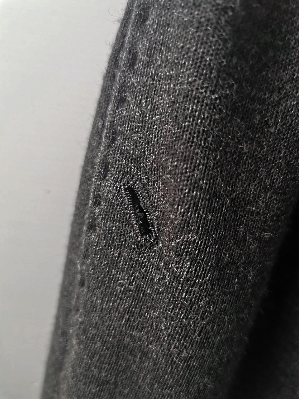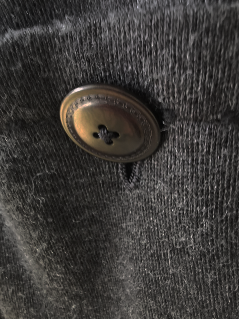 ...extraordinary hand dyed real corozo and horn button designs made for us by the world’s greatest living buttonmakers—Claudio and Cinzia Fontana in Parma and our signature hand-stitched buttonholes in pure silk Bozzolo Reale Milano Seta threads (which required at least 10-14 minutes to create each one on the challenging knit jersey fabric)...