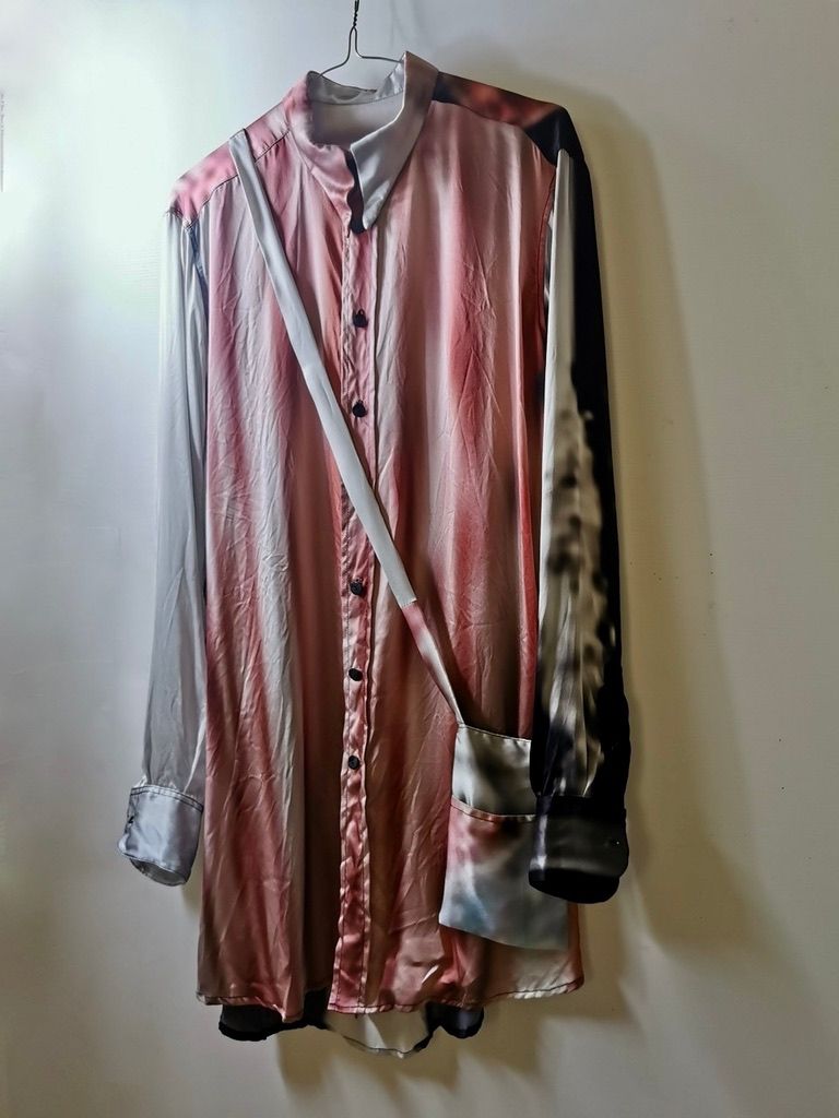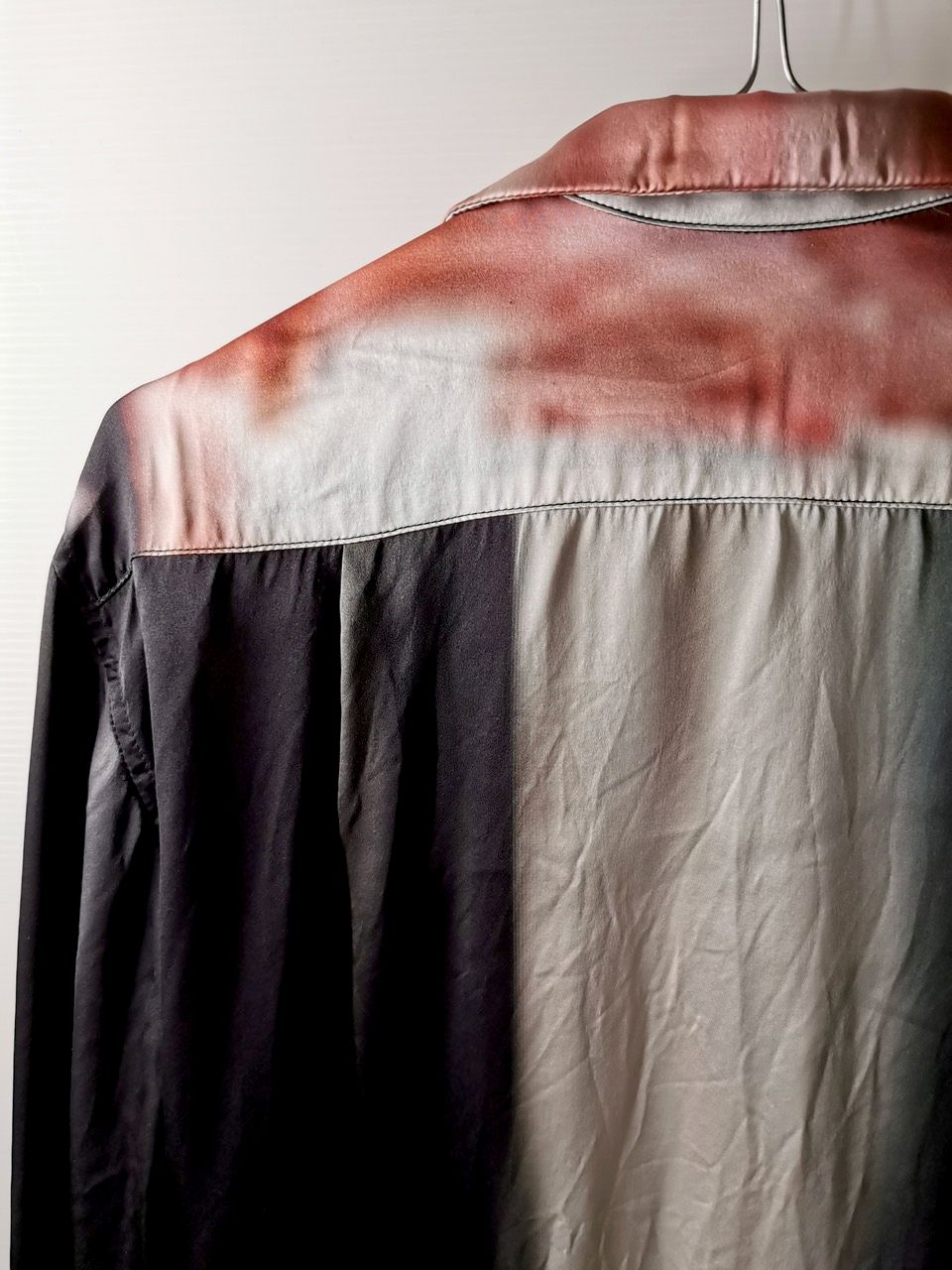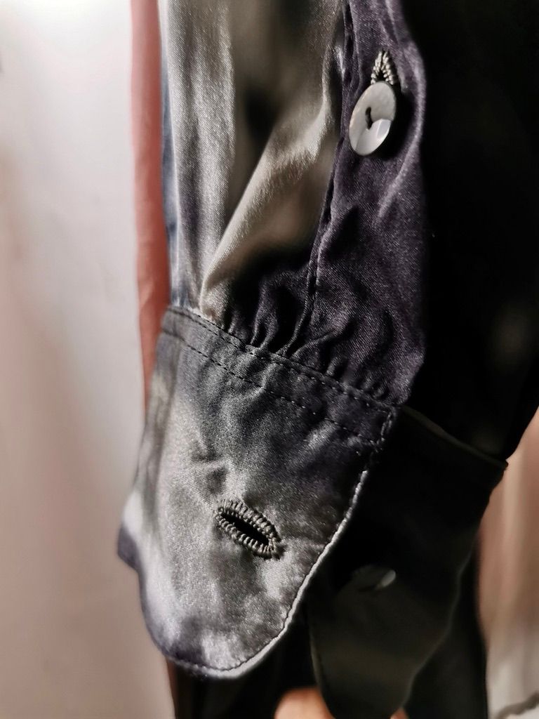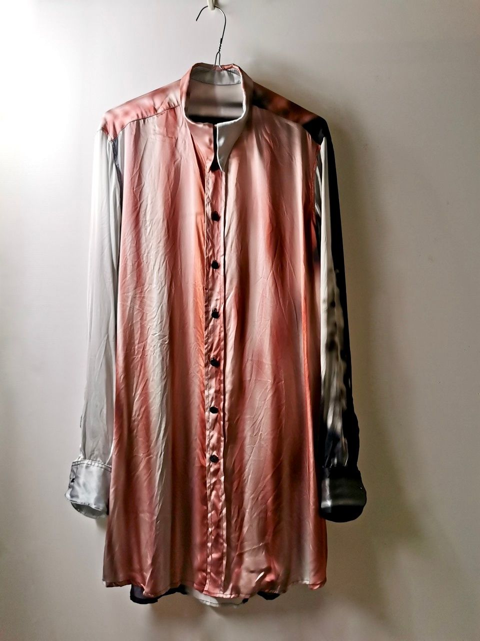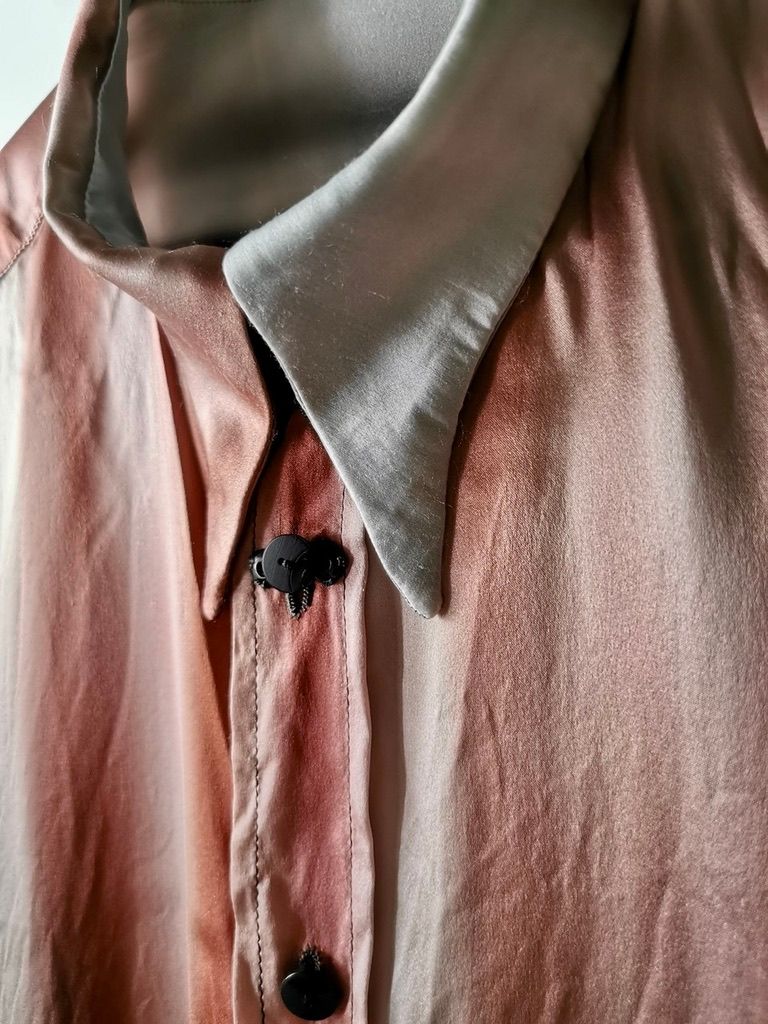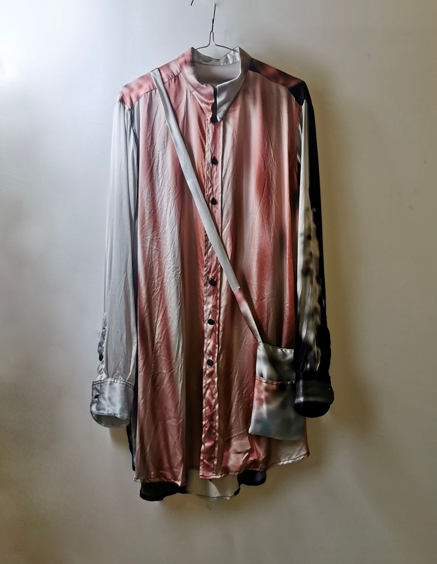 THIS super limited edition edition GBS Evolution VIII EV8S07 handmade shirt design is one of only 10 pieces of its kind being made by hand in the entire world, each made exclusively for Darklands in Berlin from our “extensionism" elongated proportion version of a classic European-fit tailored men’s shirt pattern from our extensive tailoring research, and cut using a luxury pure silk 16-momme raso satin exclusive “extensionism” cutting edge rose oil tanker distortion print design fabric made only for us by the legendary Brenna family in Como, Italy-- the world’s leading center for fine silk fabric creation, then specially washed and treated by hand in our world-famous GBS Superworkrooms for extra aging, shaping and softness. The design features a longer 92cm length classic European tailored men’s shirt cut and design with a sharp useful matching cross body bag made in our workrooms--and spectacular ultra-advanced extended point narrow spread collar with a hidden Italian automatica metal micro pressure button system to lock down its striking profile and position- impeccably hand sewn in pure silk threads with impeccable clean-finished all french-seamed interior construction, all single-needle tailoring throughout, classic mitre-construction handcutsleeve plackets, all new advanced 2-tone “opaco e lucido” shiny and matte graphic surface pure horn button designs made only for us by the world’s greatest living buttonmakers—Claudio and Cinzia Fontana in Parma; and no less than 12 of our signature real hand-stitched buttonholes (each one required 10-12 minutes to cut and sew) in luxurious pure silk Bozzolo Reale Milano Seta threads. The piece also features our world leading pure silk label created exclusively for us by Mion SpA in Torreglia which is the first label in the luxury industry to completely eliminate plastic polyester yarns in it—beautifully attached all by hand using pure silk threads. Variations in color and color density are not imperfections or irregularities, but specific characteristics of the special fabric and hand making technique. Please treat buttons and buttonholes with care. We recommend professional clean only or hand wash cold water and protecting buttons with foil or plastic wrap when washing. Do not put in washing machine or machine dryer.