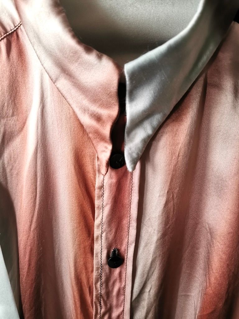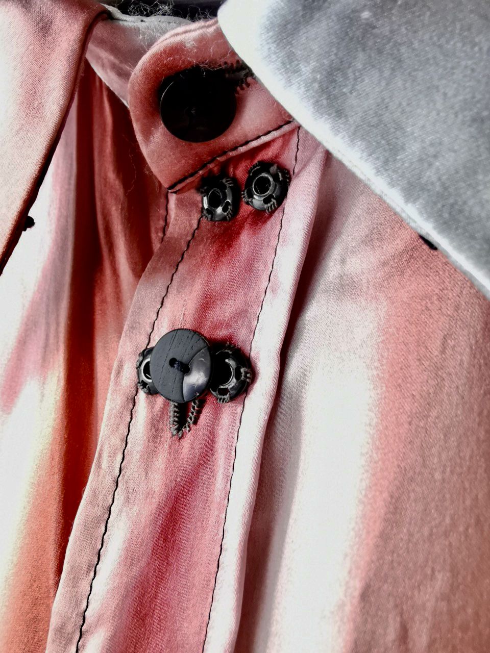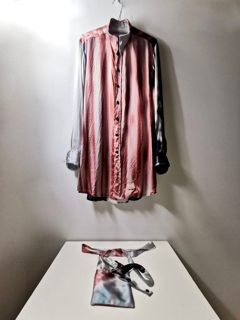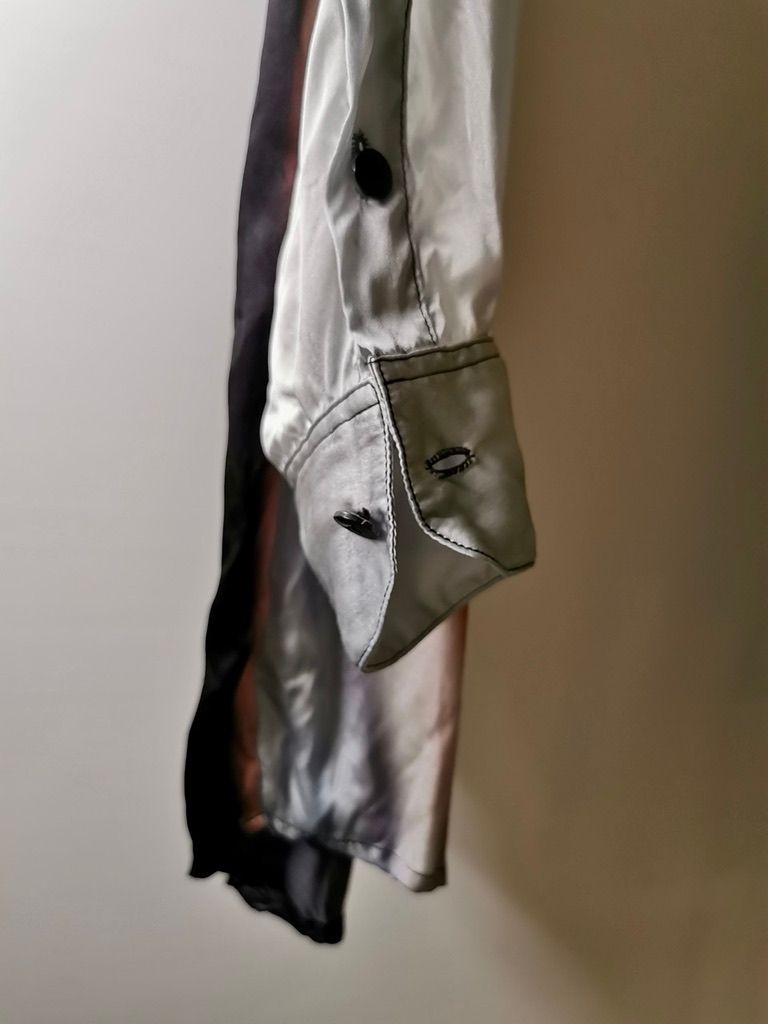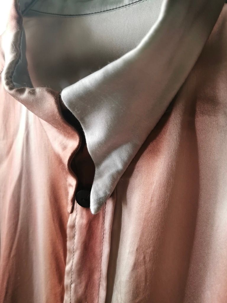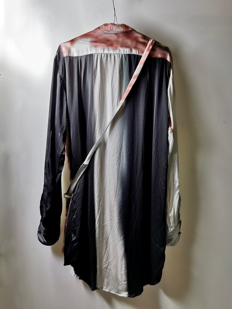 THIS super limited edition edition GBS Evolution VIII EV8S07 handmade shirt design is one of only 10 pieces of its kind being made by hand in the entire world, each made exclusively for Darklands in Berlin from our “extensionism" elongated proportion version of a classic European-fit tailored men’s shirt pattern from our extensive tailoring research, and cut using a luxury pure silk 16-momme raso satin exclusive “extensionism” cutting edge rose oil tanker distortion print design fabric made only for us by the legendary Brenna family in Como, Italy-- the world’s leading center for fine silk fabric creation, then specially washed and treated by hand in our world-famous GBS Superworkrooms for extra aging, shaping and softness. The design features a longer 92cm length classic European tailored men’s shirt cut and design with a sharp useful matching cross body bag made in our workrooms--and spectacular ultra-advanced extended point narrow spread collar with a hidden Italian automatica metal micro pressure button system to lock down its striking profile and position- impeccably hand sewn in pure silk threads with impeccable clean-finished all french-seamed interior construction, all single-needle tailoring throughout, classic mitre-construction handcutsleeve plackets, all new advanced 2-tone “opaco e lucido” shiny and matte graphic surface pure horn button designs made only for us by the world’s greatest living buttonmakers—Claudio and Cinzia Fontana in Parma; and no less than 12 of our signature real hand-stitched buttonholes (each one required 10-12 minutes to cut and sew) in luxurious pure silk Bozzolo Reale Milano Seta threads. The piece also features our world leading pure silk label created exclusively for us by Mion SpA in Torreglia which is the first label in the luxury industry to completely eliminate plastic polyester yarns in it—beautifully attached all by hand using pure silk threads. Variations in color and color density are not imperfections or irregularities, but specific characteristics of the special fabric and hand making technique. Please treat buttons and buttonholes with care. We recommend professional clean only or hand wash cold water and protecting buttons with foil or plastic wrap when washing. Do not put in washing machine or machine dryer.
