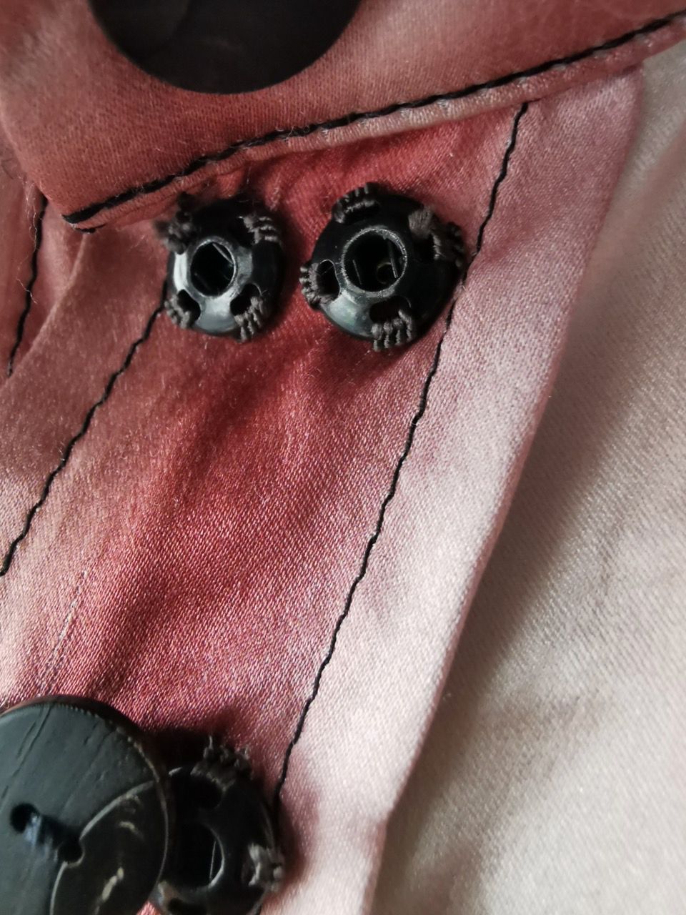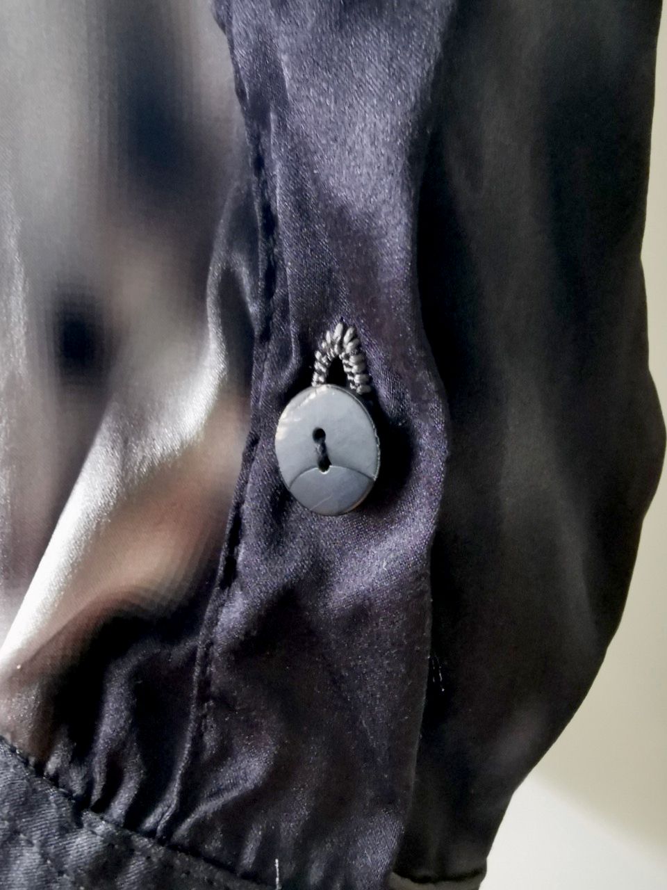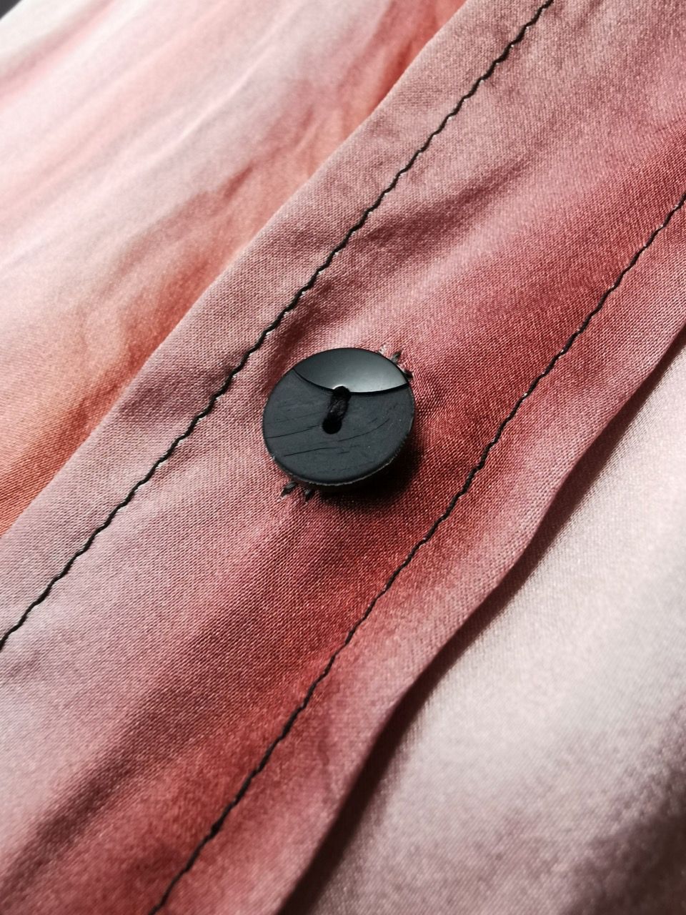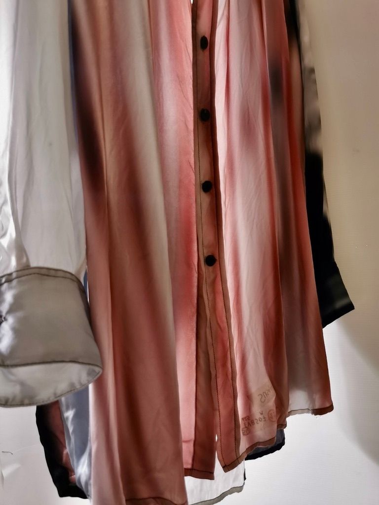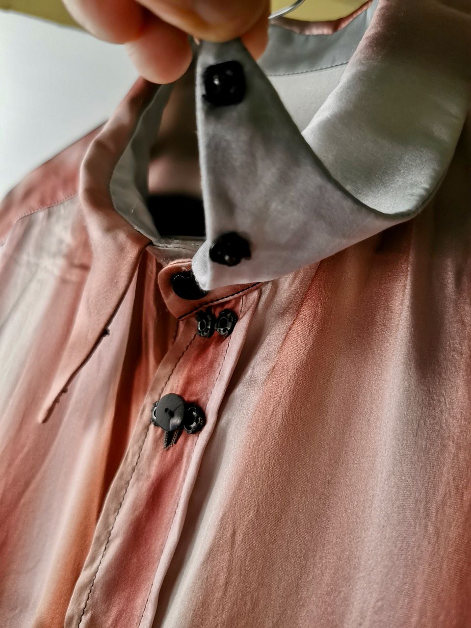 THIS super limited edition edition GBS Evolution VIII EV8S07 handmade shirt design is one of only 10 pieces of its kind being made by hand in the entire world, each made exclusively for Darklands in Berlin from our “extensionism" elongated proportion version of a classic European-fit tailored men’s shirt pattern from our extensive tailoring research, and cut using a luxury pure silk 16-momme raso satin exclusive “extensionism” cutting edge rose oil tanker distortion print design fabric made only for us by the legendary Brenna family in Como, Italy-- the world’s leading center for fine silk fabric creation, then specially washed and treated by hand in our world-famous GBS Superworkrooms for extra aging, shaping and softness. The design features a longer 92cm length classic European tailored men’s shirt cut and design with a sharp useful matching cross body bag made in our workrooms--and spectacular ultra-advanced extended point narrow spread collar with a hidden Italian automatica metal micro pressure button system to lock down its striking profile and position- impeccably hand sewn in pure silk threads with impeccable clean-finished all french-seamed interior construction, all single-needle tailoring throughout, classic mitre-construction handcutsleeve plackets, all new advanced 2-tone “opaco e lucido” shiny and matte graphic surface pure horn button designs made only for us by the world’s greatest living buttonmakers—Claudio and Cinzia Fontana in Parma; and no less than 12 of our signature real hand-stitched buttonholes (each one required 10-12 minutes to cut and sew) in luxurious pure silk Bozzolo Reale Milano Seta threads. The piece also features our world leading pure silk label created exclusively for us by Mion SpA in Torreglia which is the first label in the luxury industry to completely eliminate plastic polyester yarns in it—beautifully attached all by hand using pure silk threads. Variations in color and color density are not imperfections or irregularities, but specific characteristics of the special fabric and hand making technique. Please treat buttons and buttonholes with care. We recommend professional clean only or hand wash cold water and protecting buttons with foil or plastic wrap when washing. Do not put in washing machine or machine dryer.