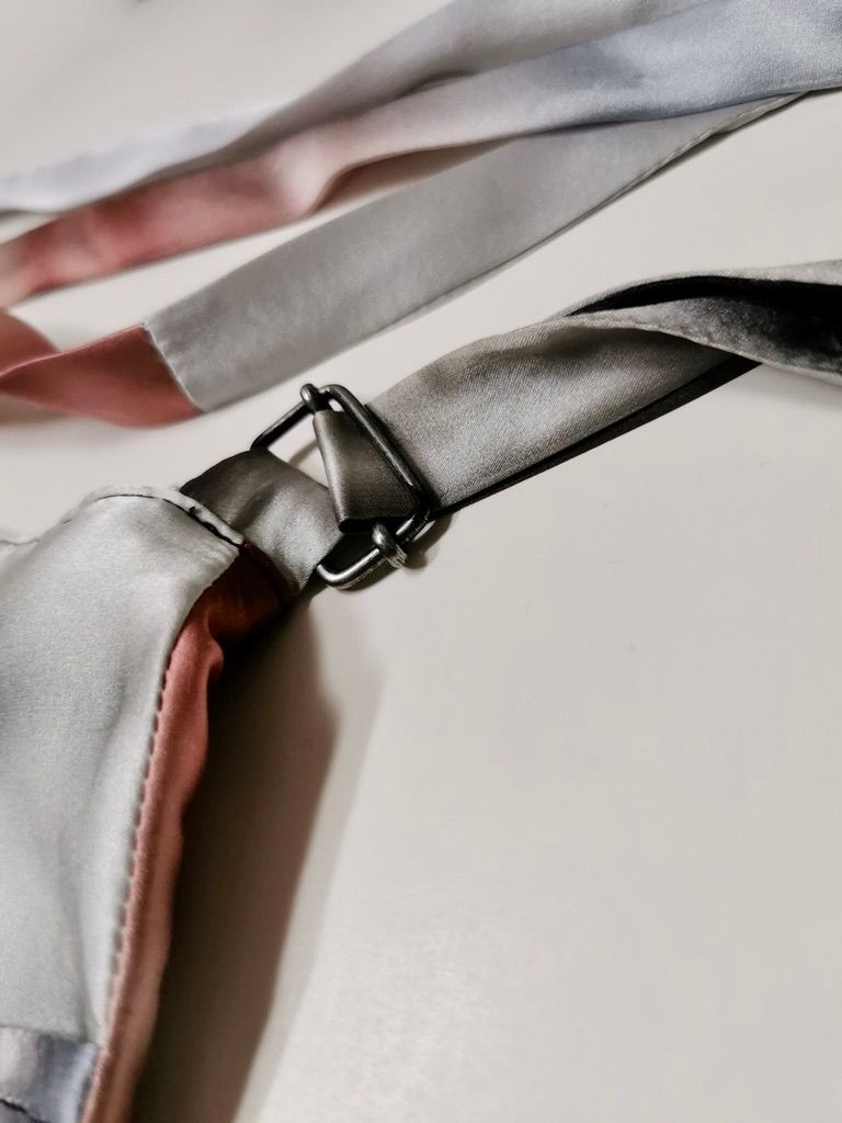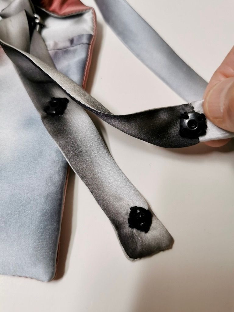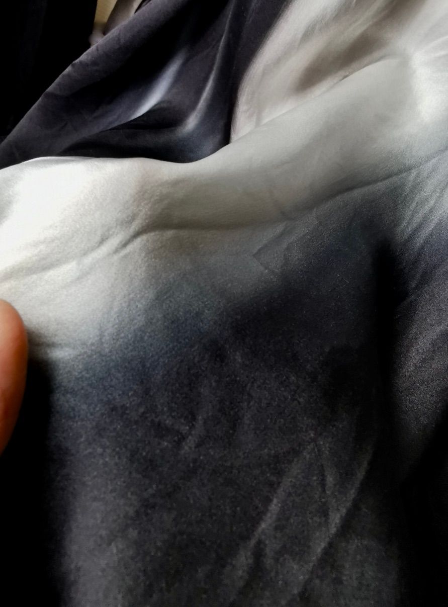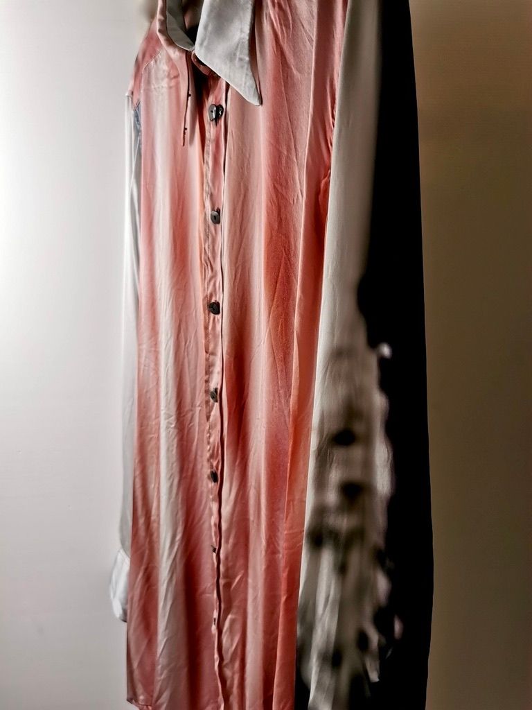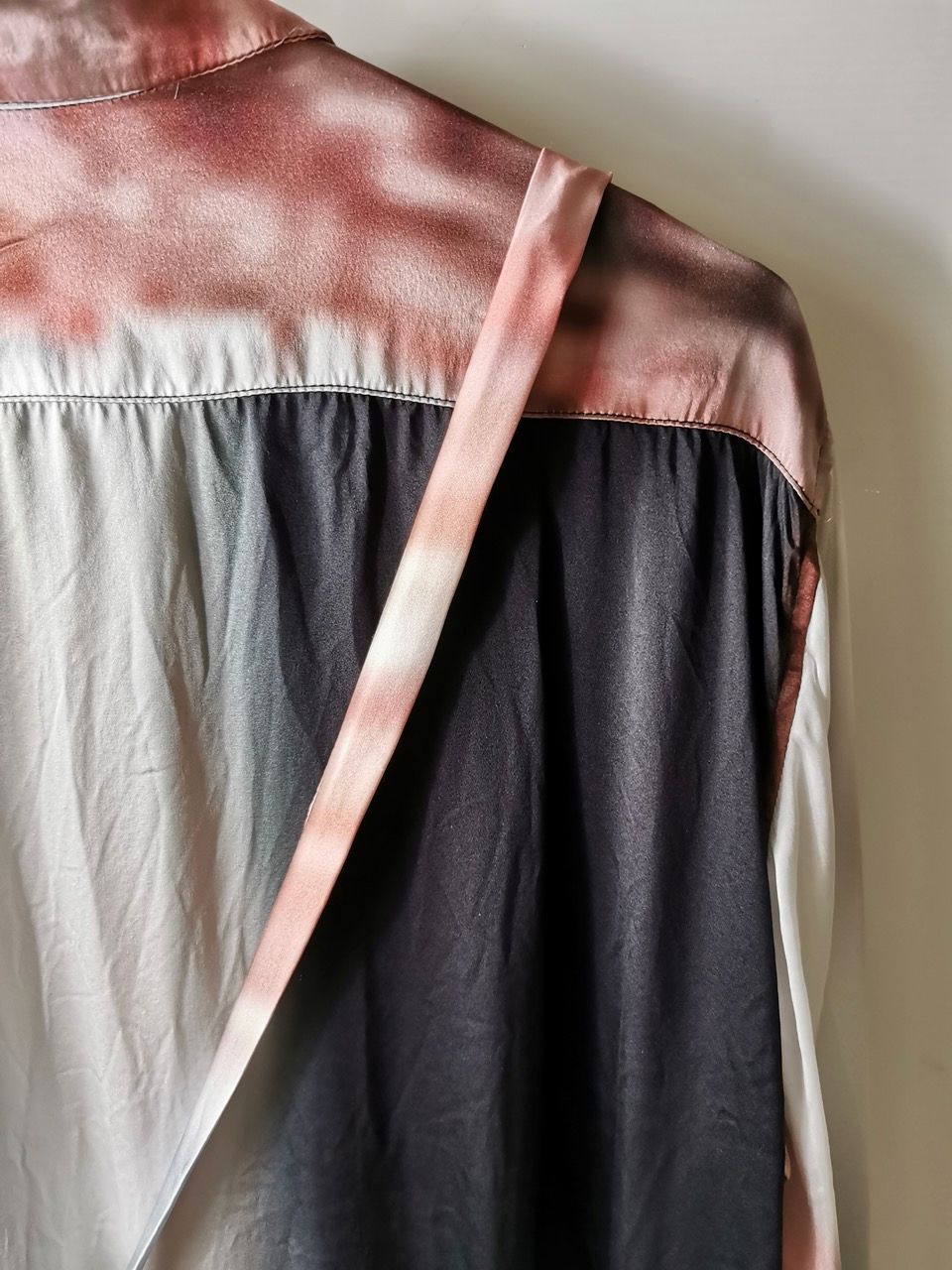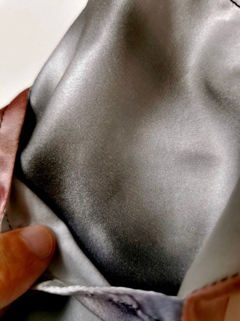 ....using a superlux pure silk 16-momme raso satin exclusive “extensionism” cutting-edge 'rose tanker' distortion print design fabric made only for us by the legendary Brenna family in Como, Italy-- the world’s leading center for fine silk fabric creation-- then specially washed and treated by hand in our world-famous GBS Superworkrooms for extra aging, shaping and softness...
