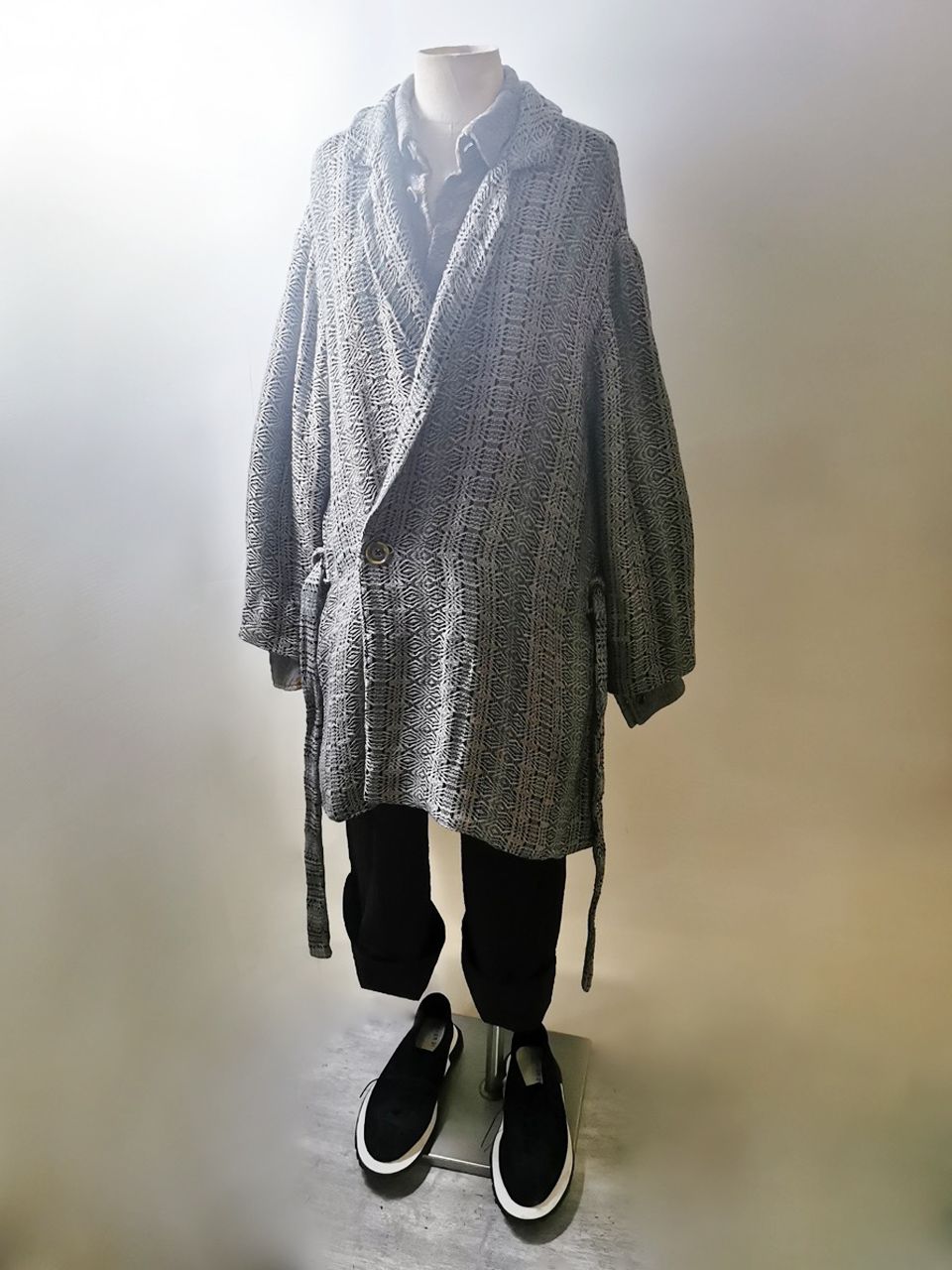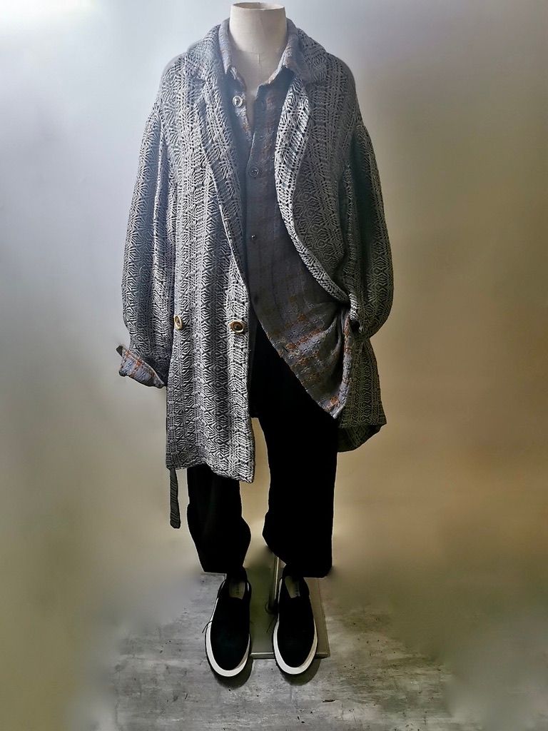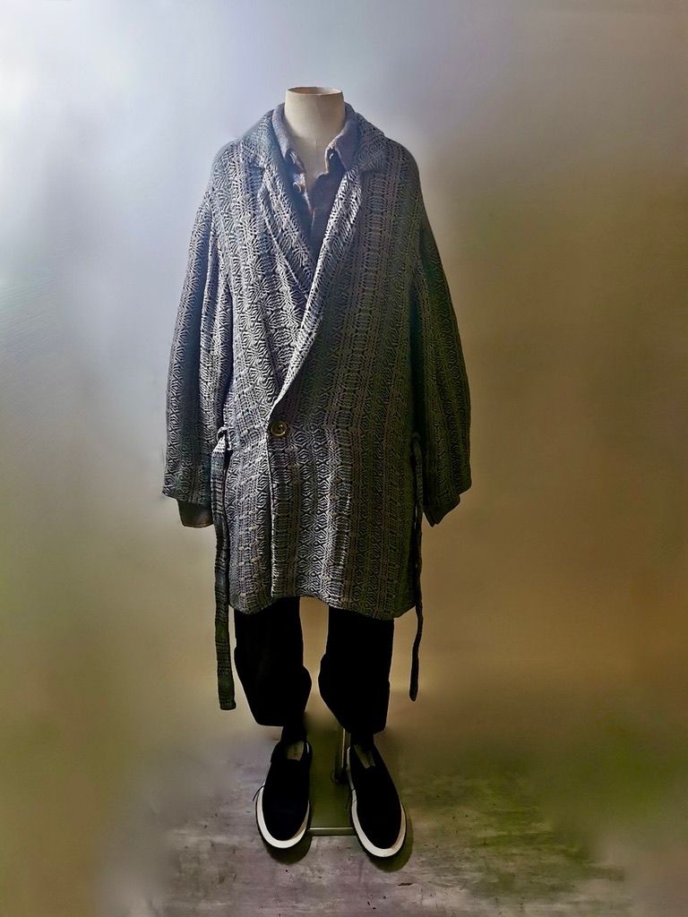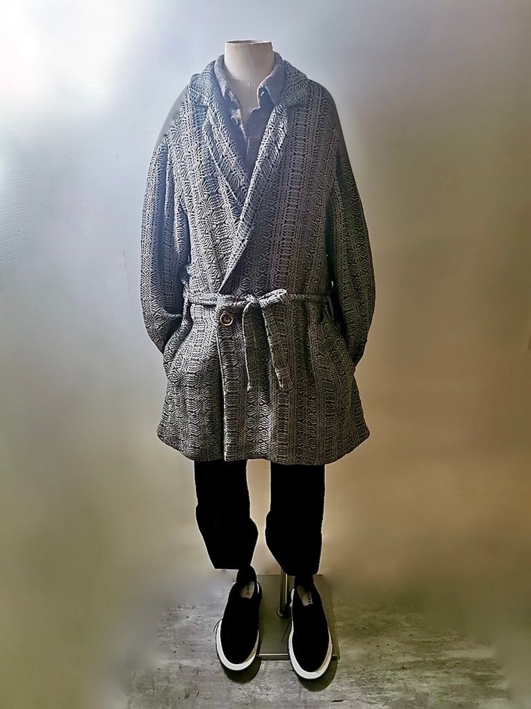 The EV9J08 was created from our original modified mid-length cross-buttoned belted kimono jacket pattern from our extensive tailoring research...