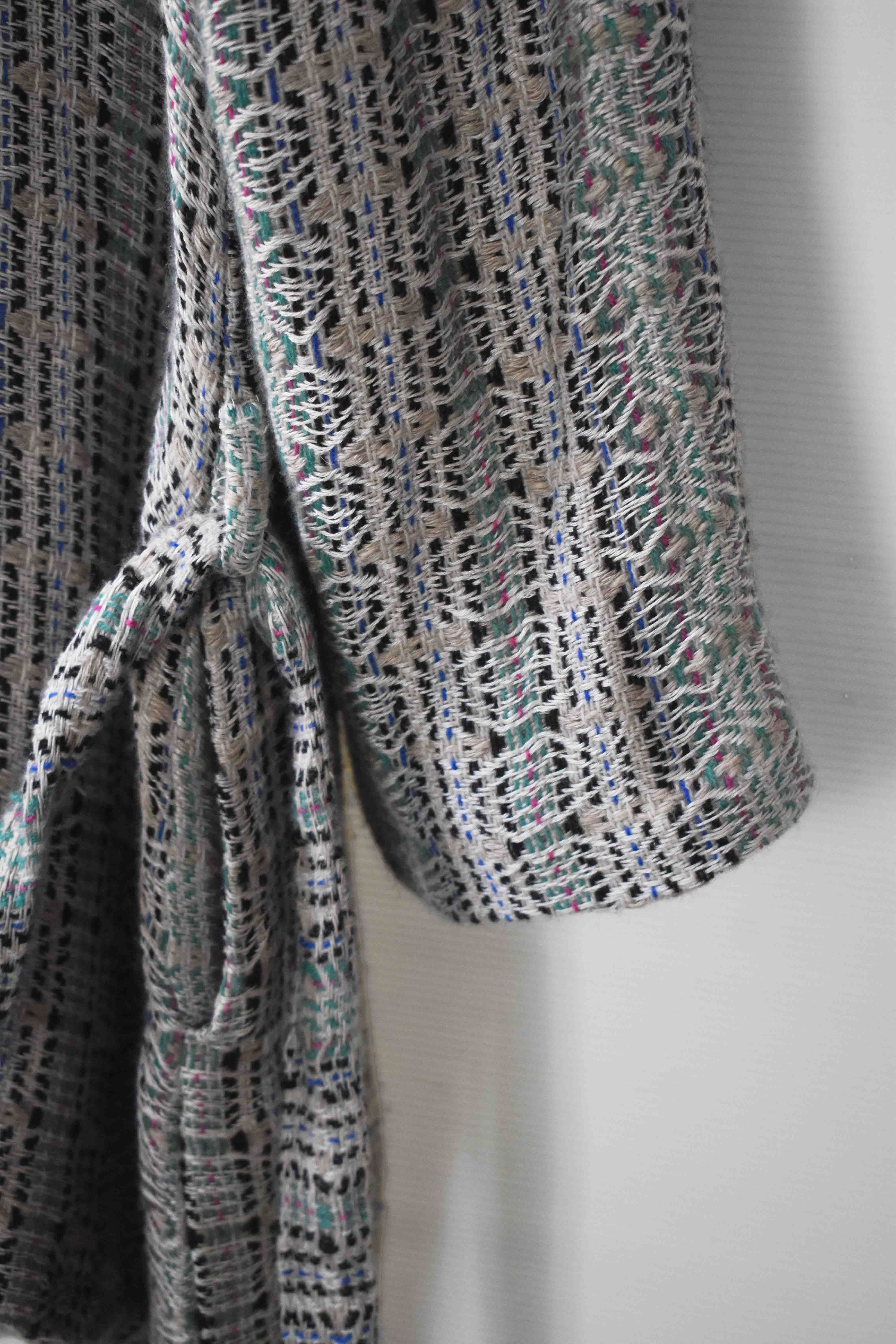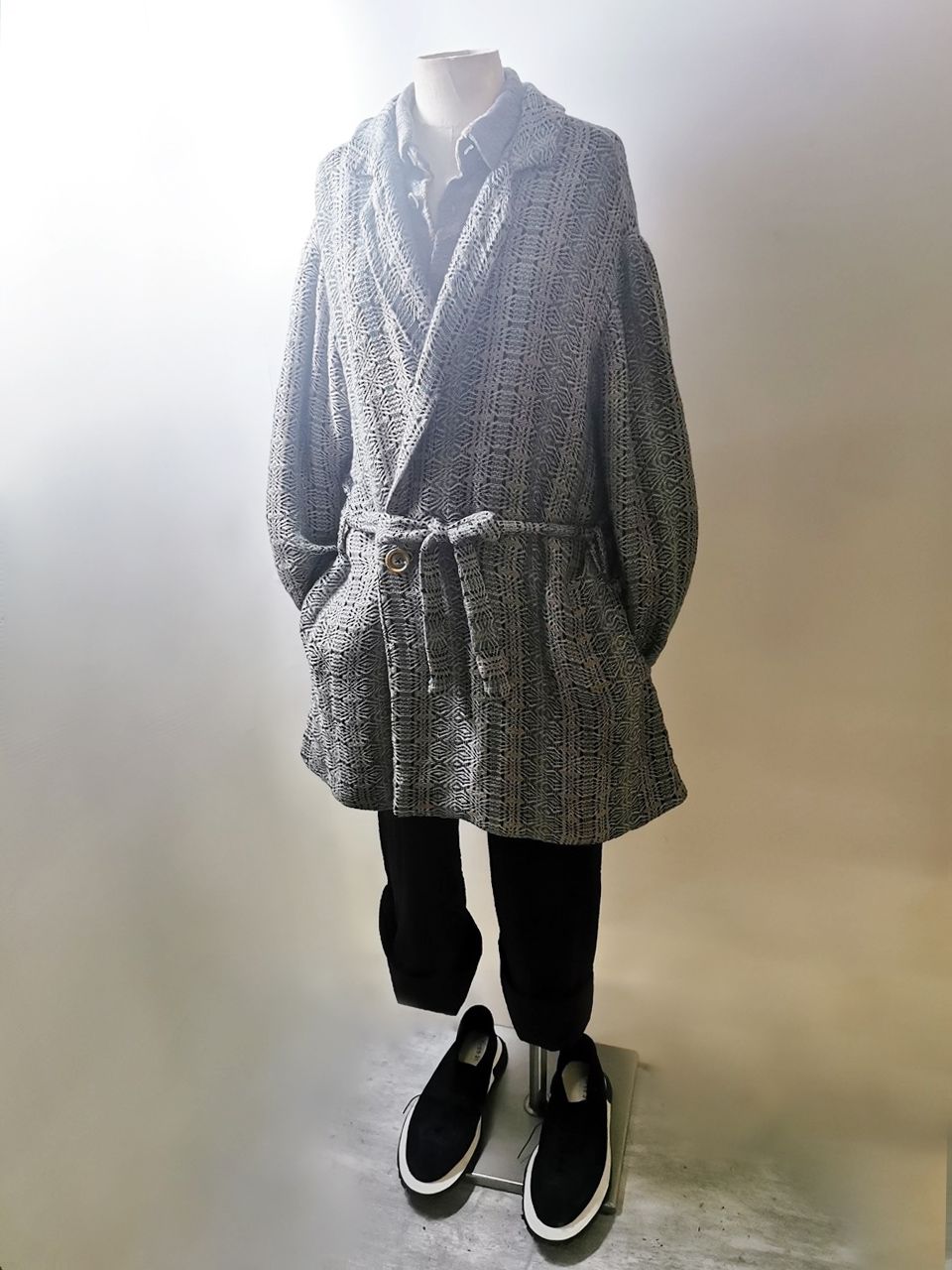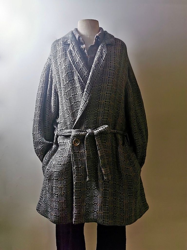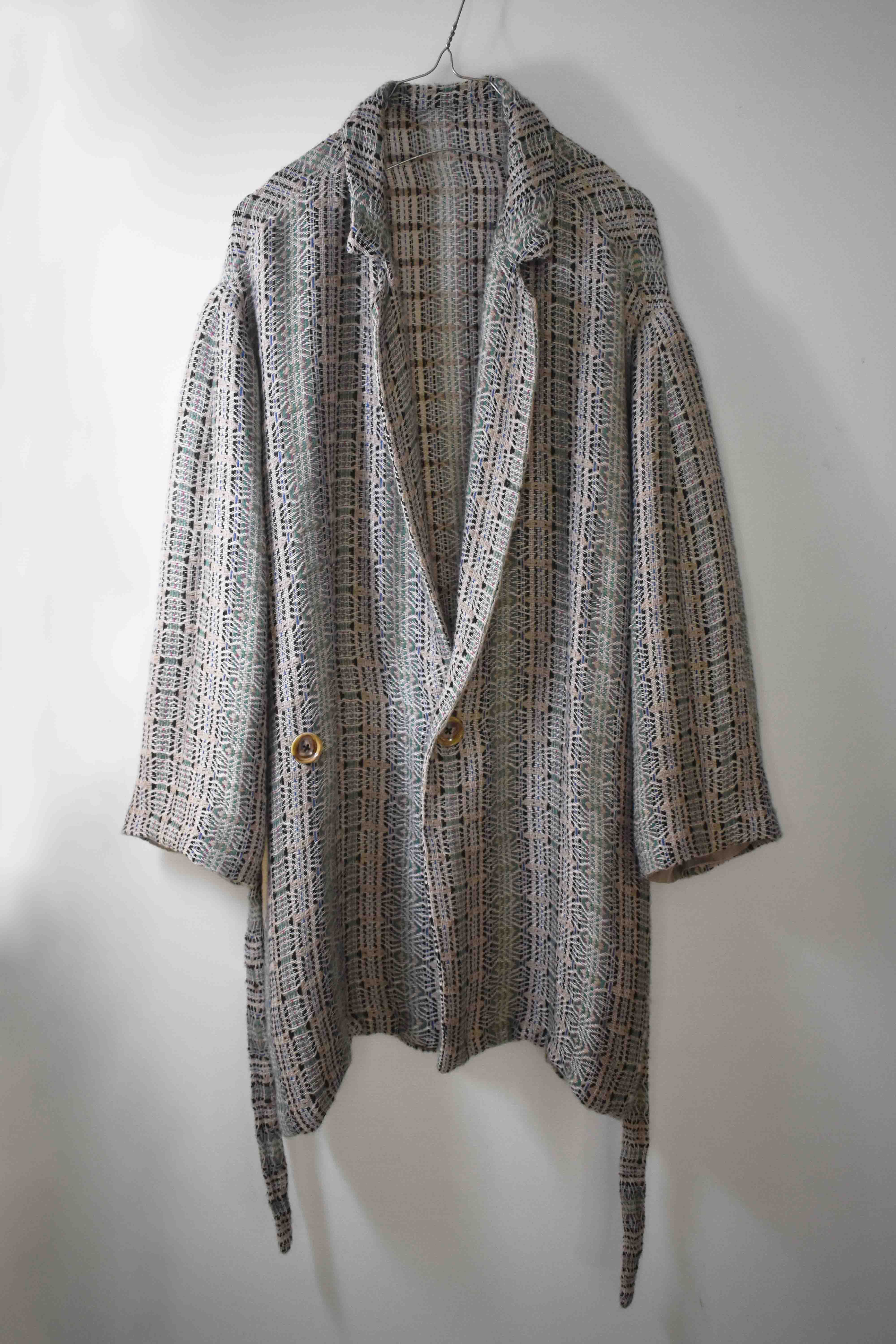 The EV9J08 was created from our original modified mid-length cross-buttoned belted kimono jacket pattern from our extensive tailoring research...
