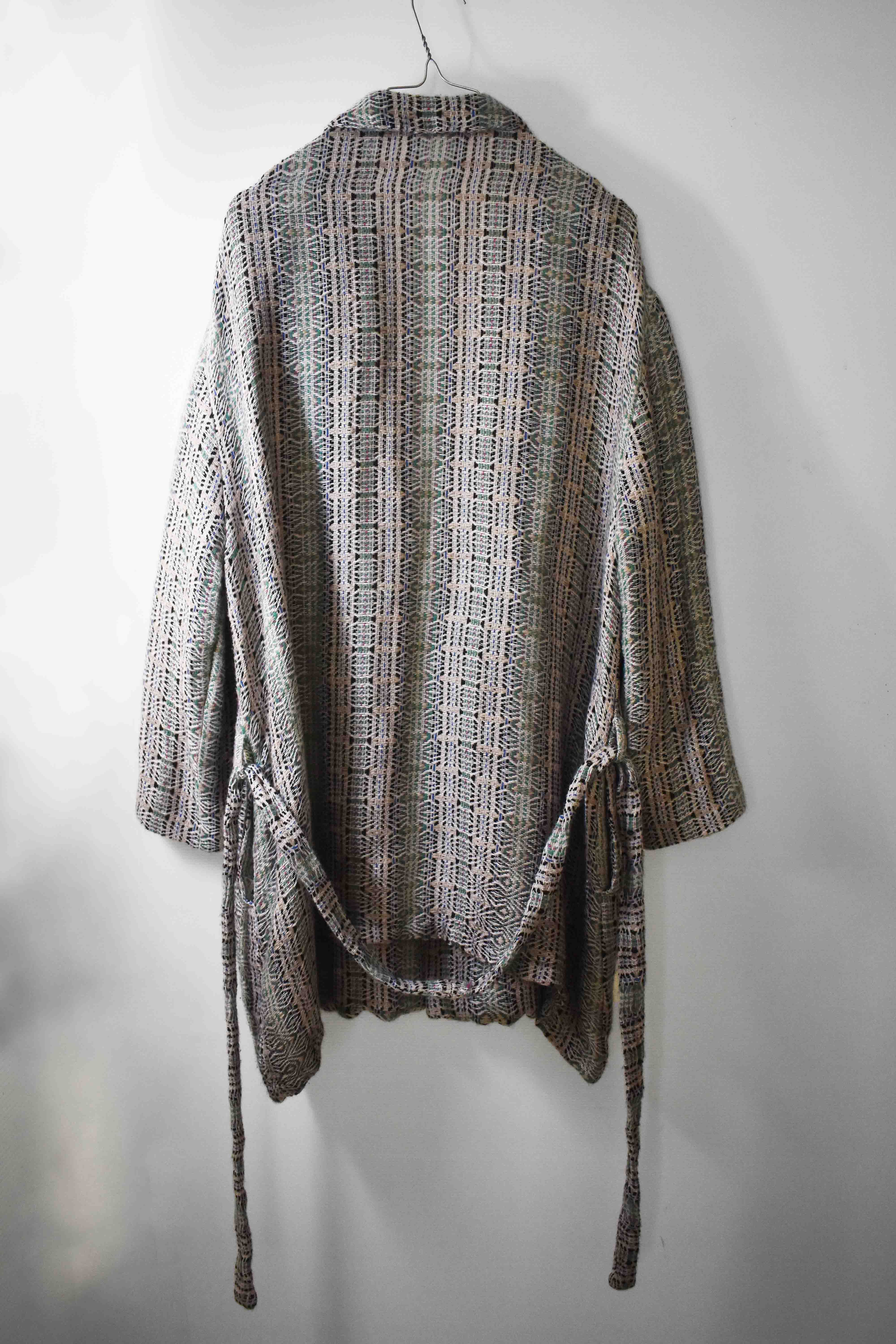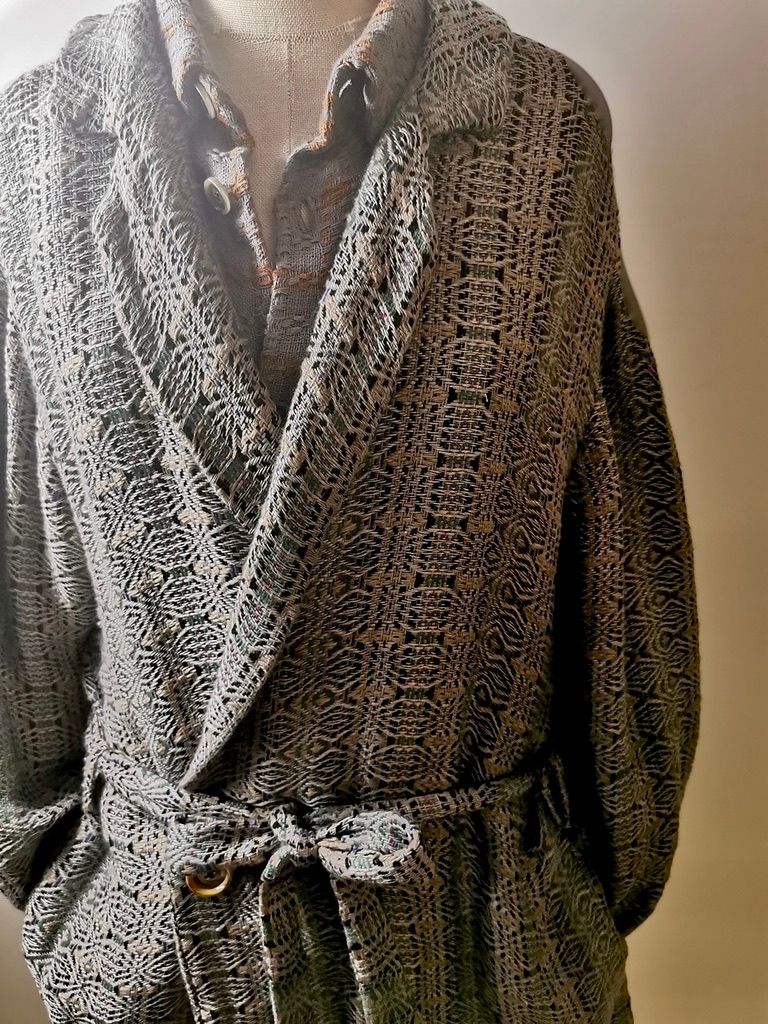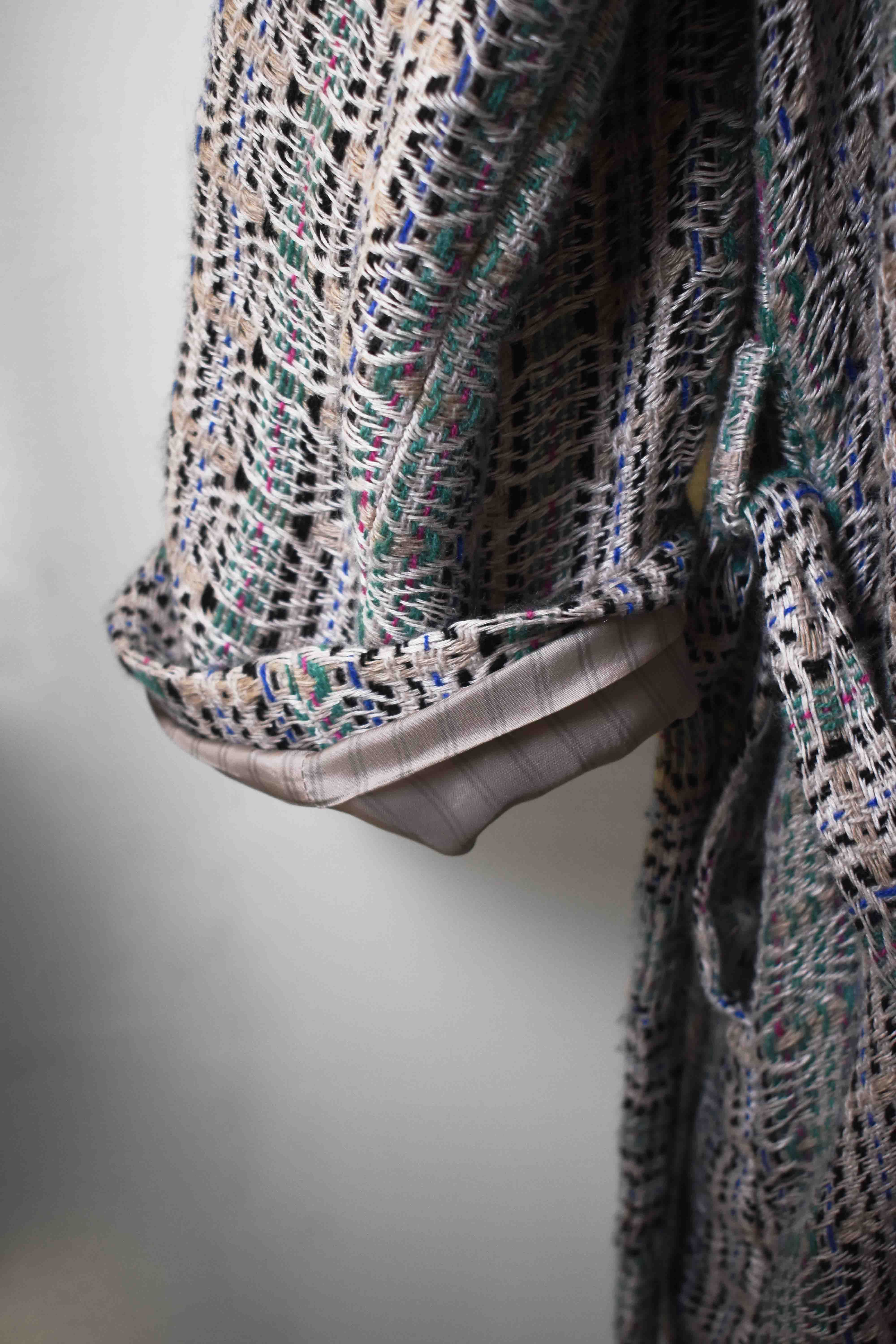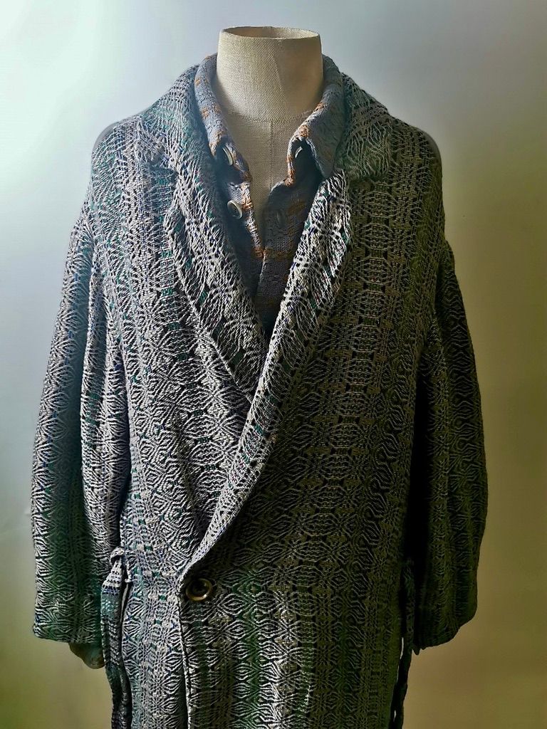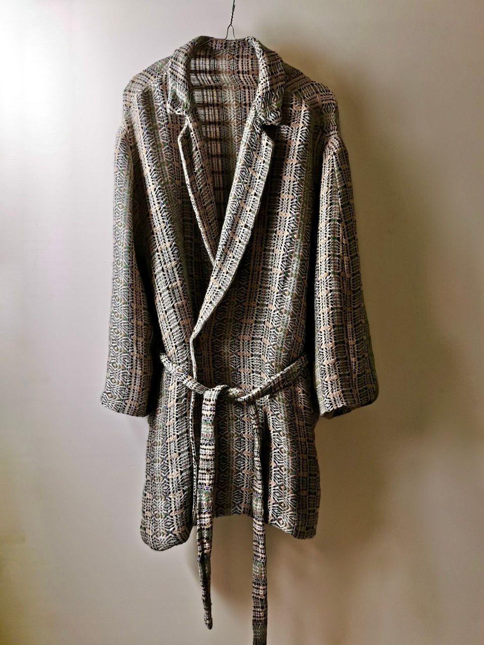 This super limited edition EV9J08 handmade relaxed living jacket design is one of only 2 pieces of its kind currently being made by hand in the entire world. It was created from our our modified midlength kimono jacket pattern and cut using a very rare, completely handwoven Italian pure Cariaggi cashmere and deluxe linen and cotton yarn textured weave complex abstract plaid check fabric created exclusively for us on the 18th century wooden hand looms of Tessitura La Colombina in Badoere di Morgano, Italy requiring almost 2 full days to create just enough cloth to make the single jacket--combined with pure cupro Bemberg-type striped weave sleeve linings made for us by Ezio Ghiringhelli, then specially hand dyed in our world famous GBS Superworkrooms at Cavarzere Venezia using a process that required over 8 hours of expert work to achieve its unique colors, patina effects, shaping and softness. The piece also features wrapped-belt single or double-breasted versatility styling, beautiful finished interior french-seam finishing, clean tailored in-seam pockets, amazing yellow gold real horn buttons made only for us by the world's greatest living buttonmakers-- Claudio and Cinzia Fontana in Parma Italy; and our signature hand sewn buttonholes in luxurious pure silk Bozzolo Milano Seta Reale threads (which required at least 12-18 minutes to create each one on the challenging handwoven fabric). The piece also features our world leading pure silk label created exclusively for us by Mion SpA in Torreglia which is the first label in the luxury industry to completely eliminate plastic polyester yarns in it- beautifully attached completely by hand with pure silk threads. The special design can be worn in a variety of different ways.