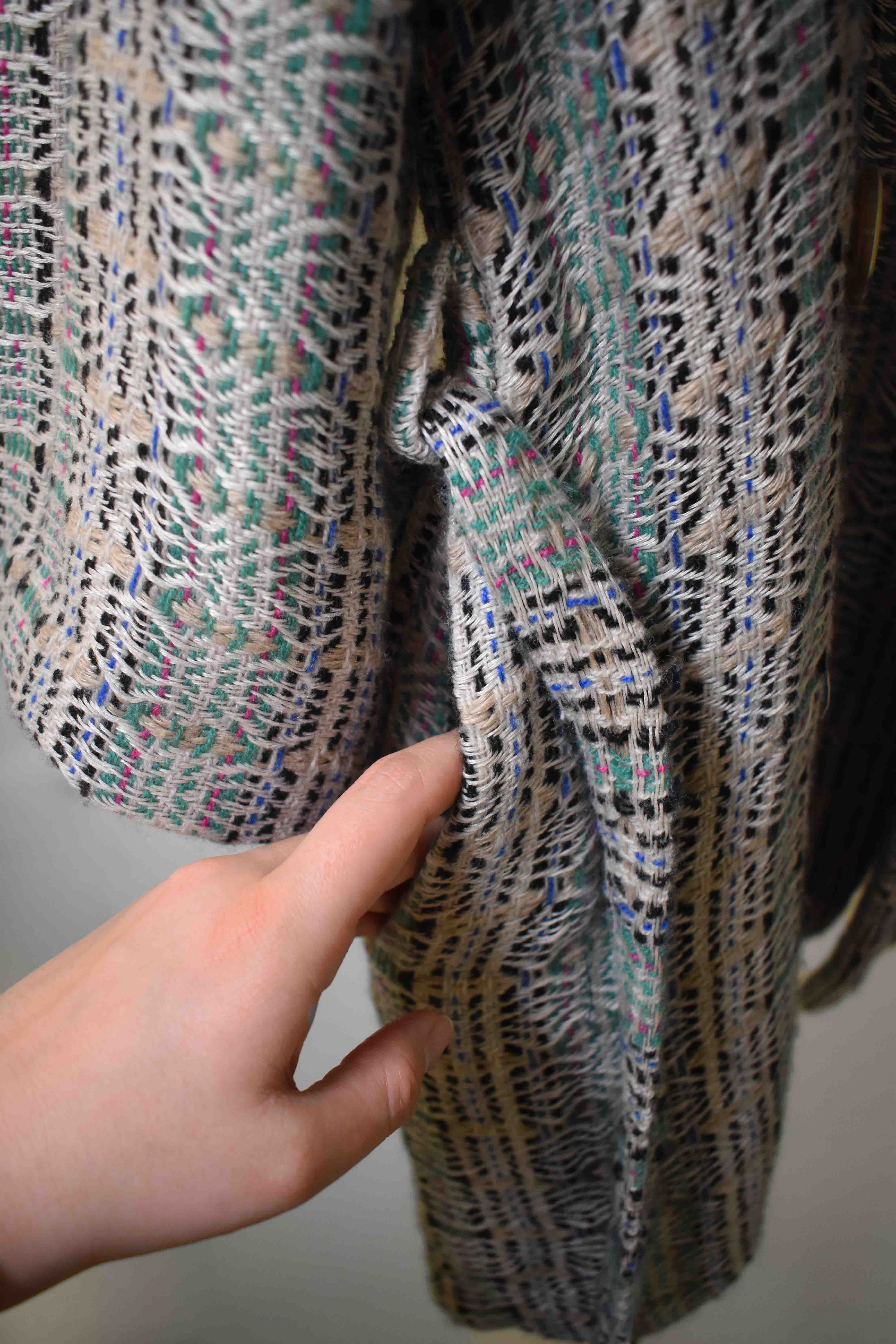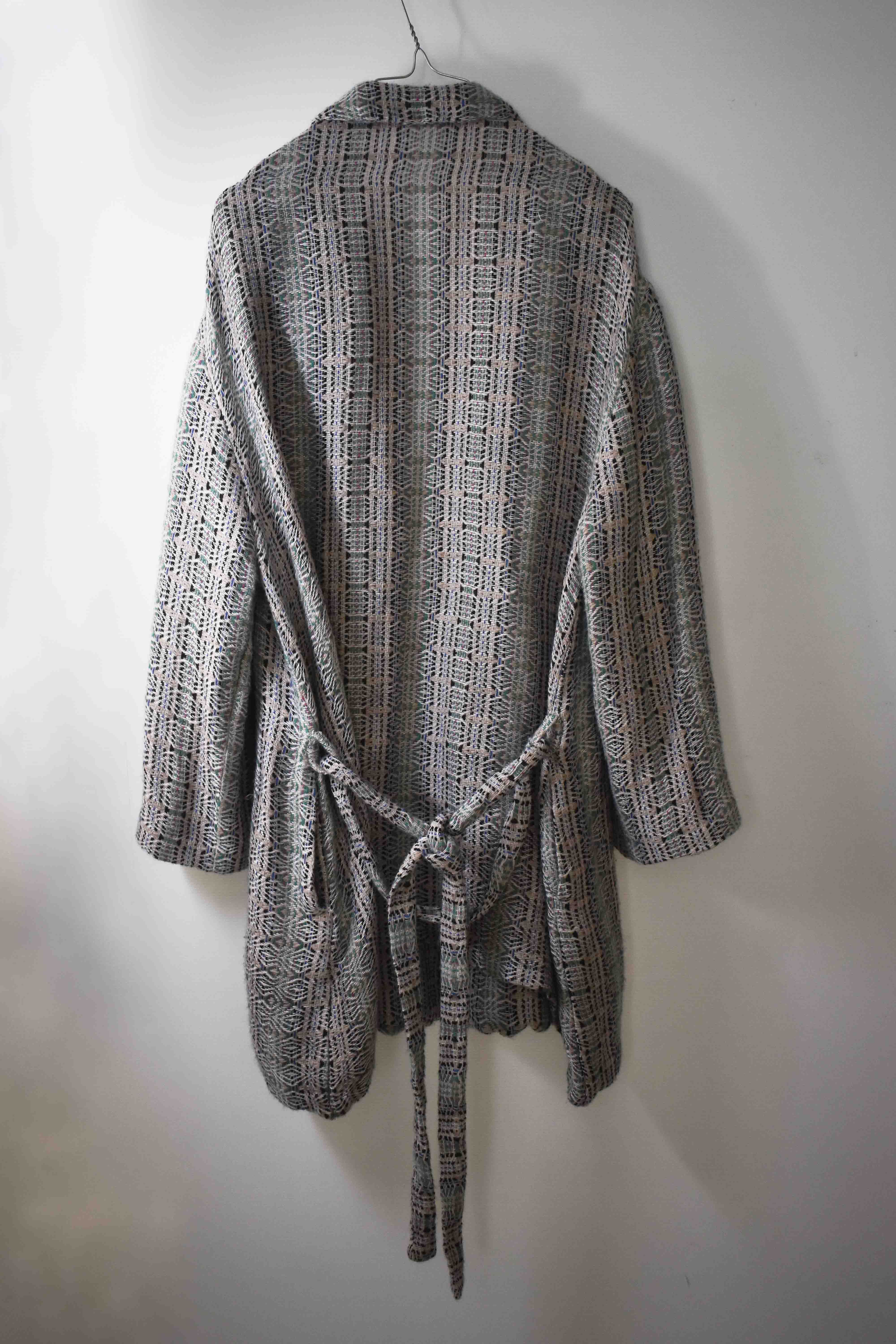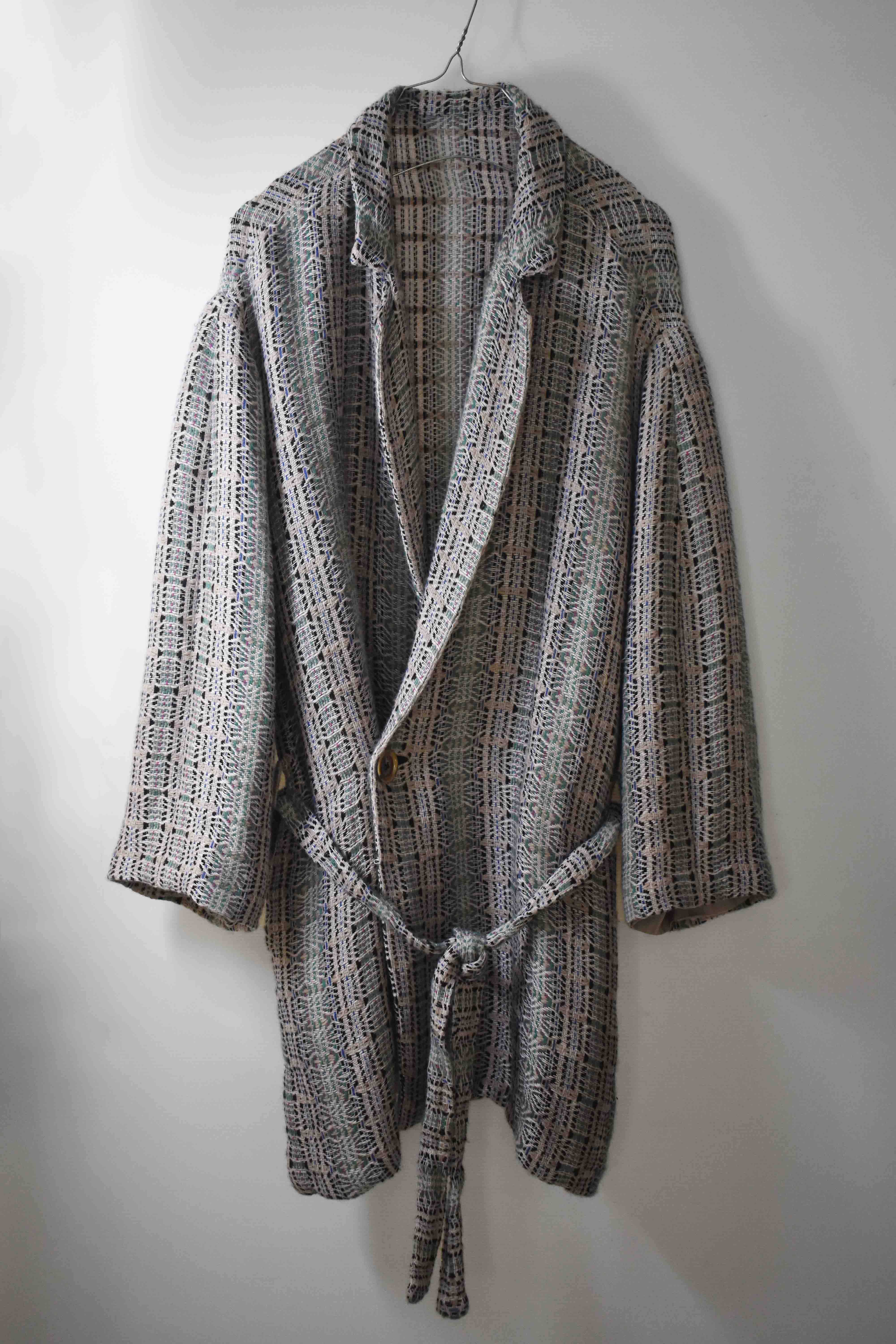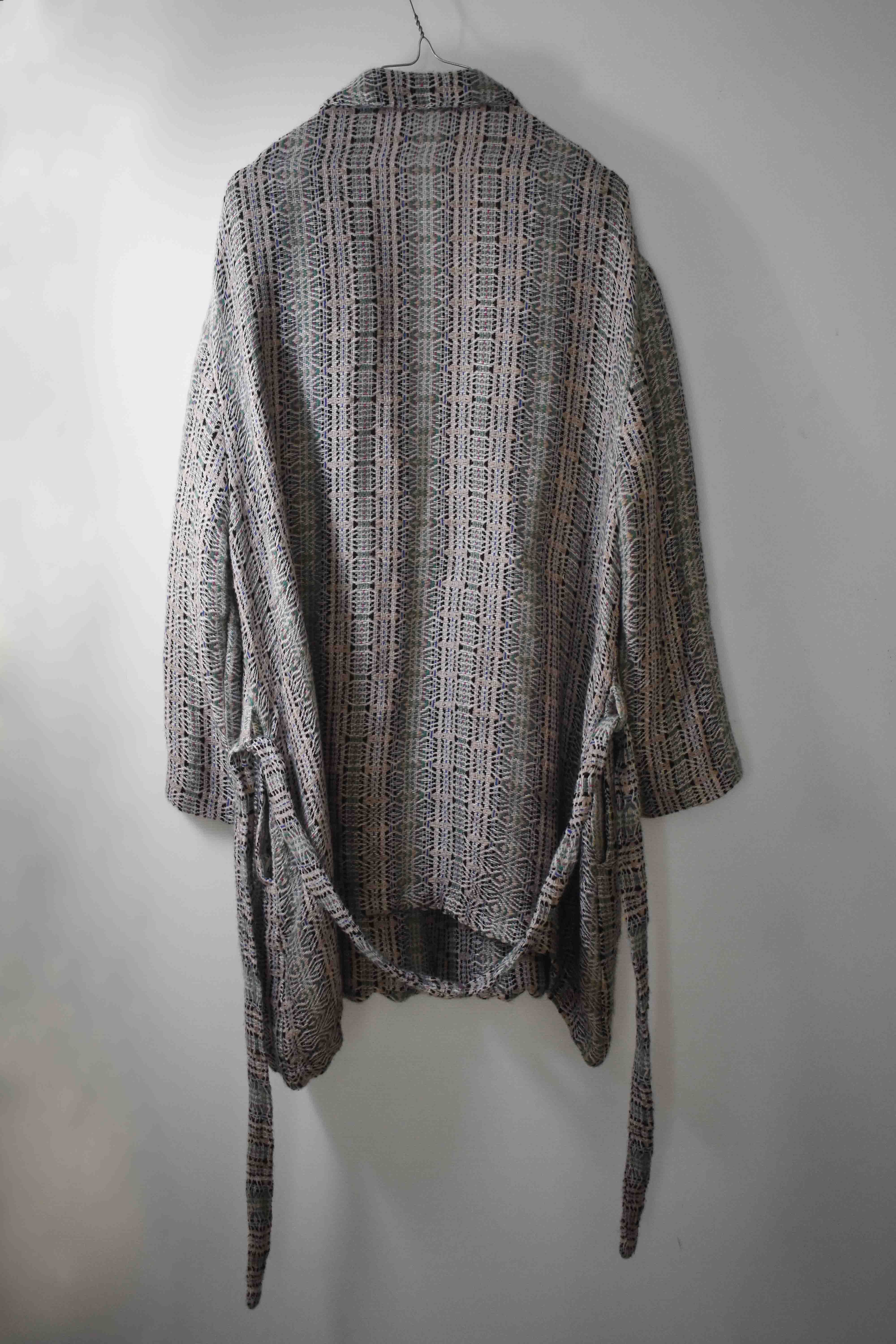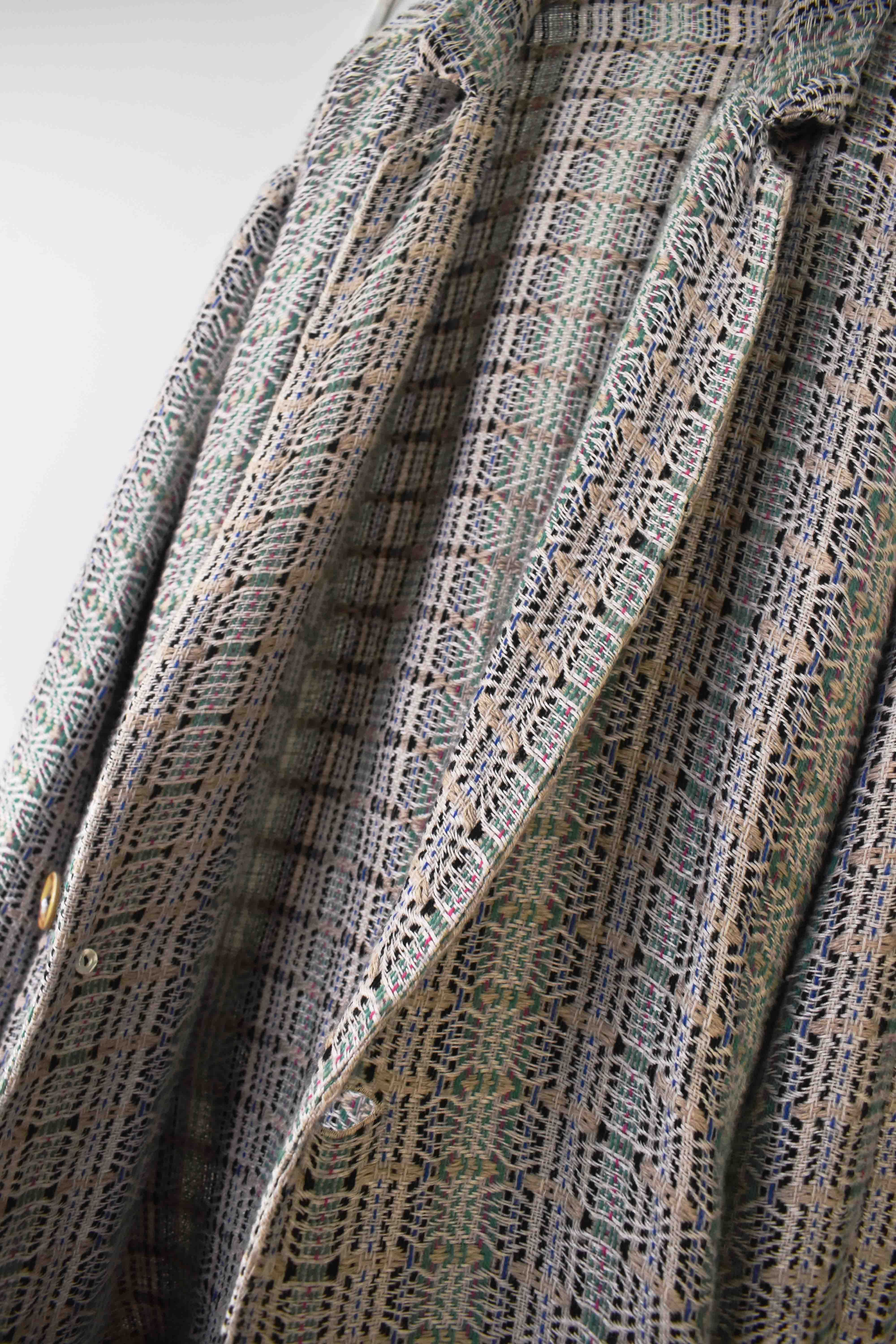 This super limited edition EV9J08 handmade relaxed living jacket design is one of only 2 pieces of its kind currently being made by hand in the entire world. It was created from our our modified midlength kimono jacket pattern and cut using a very rare, completely handwoven Italian pure Cariaggi cashmere and deluxe linen and cotton yarn textured weave complex abstract plaid check fabric created exclusively for us on the 18th century wooden hand looms of Tessitura La Colombina in Badoere di Morgano, Italy requiring almost 2 full days to create just enough cloth to make the single jacket--combined with pure cupro Bemberg-type striped weave sleeve linings made for us by Ezio Ghiringhelli, then specially hand dyed in our world famous GBS Superworkrooms at Cavarzere Venezia using a process that required over 8 hours of expert work to achieve its unique colors, patina effects, shaping and softness. The piece also features wrapped-belt single or double-breasted versatility styling, beautiful finished interior french-seam finishing, clean tailored in-seam pockets, amazing yellow gold real horn buttons made only for us by the world's greatest living buttonmakers-- Claudio and Cinzia Fontana in Parma Italy; and our signature hand sewn buttonholes in luxurious pure silk Bozzolo Milano Seta Reale threads (which required at least 12-18 minutes to create each one on the challenging handwoven fabric). The piece also features our world leading pure silk label created exclusively for us by Mion SpA in Torreglia which is the first label in the luxury industry to completely eliminate plastic polyester yarns in it- beautifully attached completely by hand with pure silk threads. The special design can be worn in a variety of different ways.