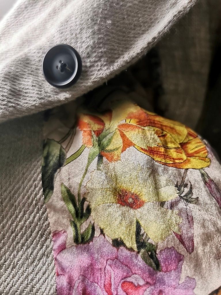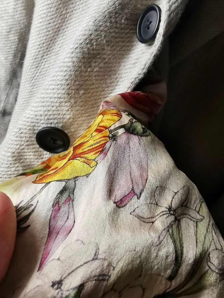 ...then combined with a beautiful partial lining story in luxurious pure silk 16 momme raso satin floral print made for us by the legendary Brenna family in Como Italy--the world's leading center for fine silk fabric creation along with pure cupro Bemberg-tipo sleeve linings woven for us by Ezio Ghiringhelli in Varese...