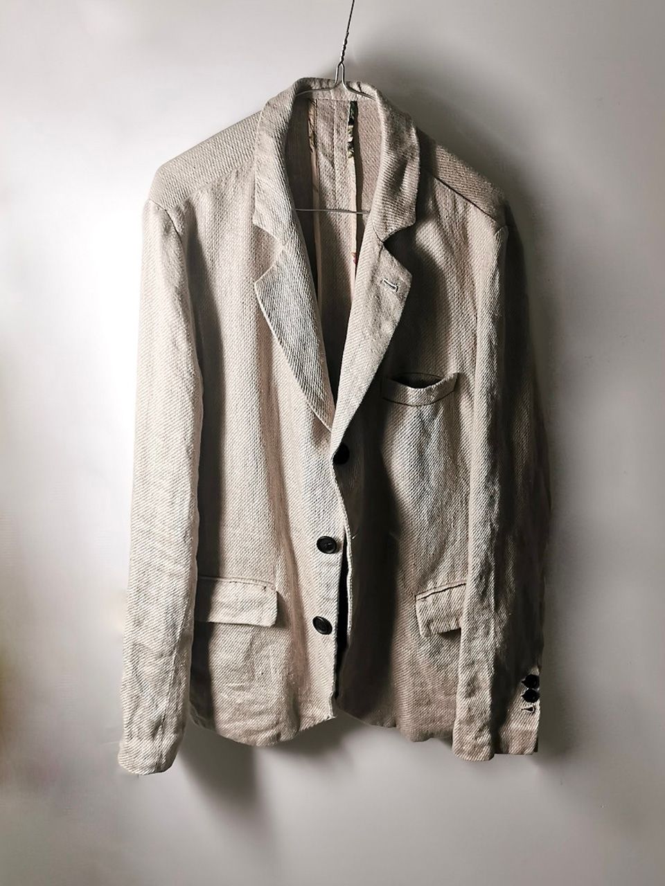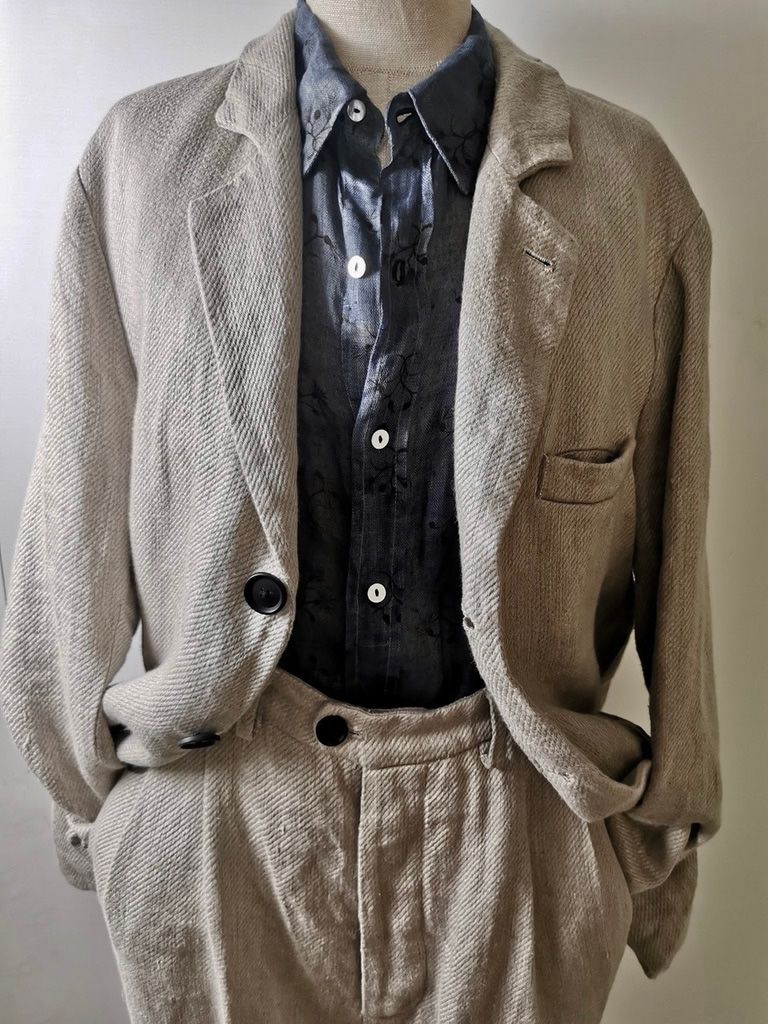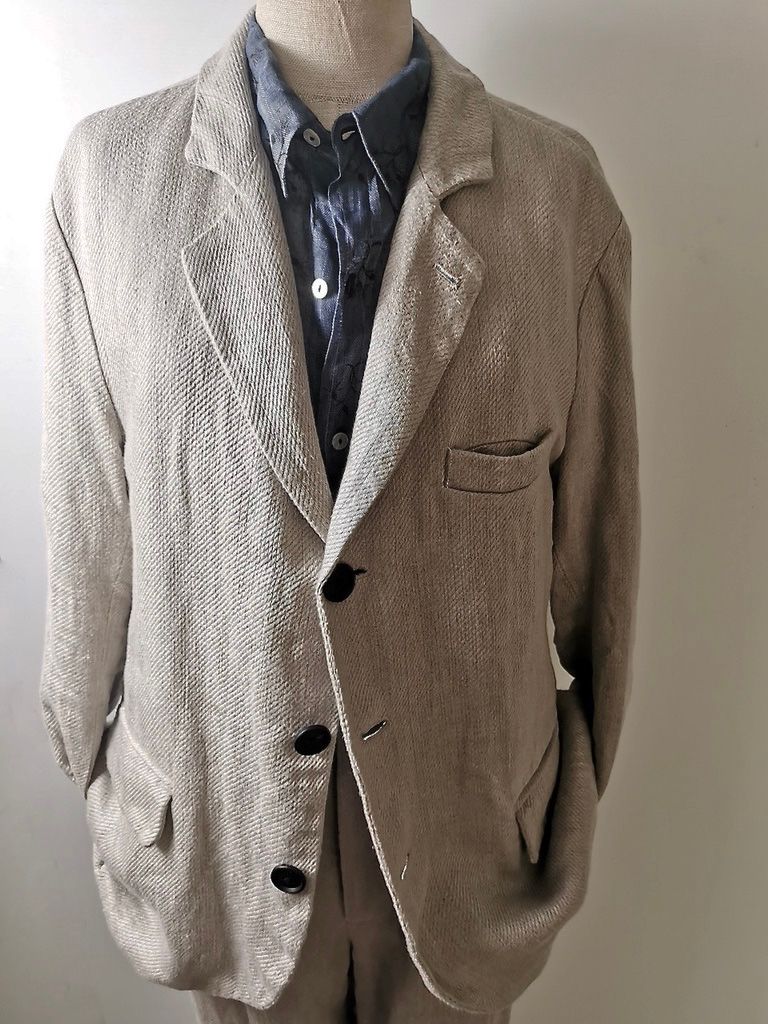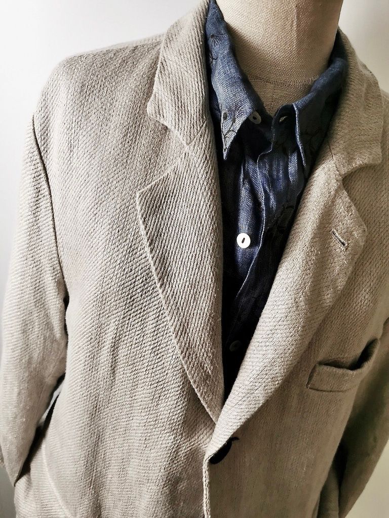 THIS super limited edition GBS Evolution IX EV9J11 hand made jacket design is one of only 5 pieces of its kind made by hand in the entire world, each exclusively from our original classic men’s single-breasted notch-lapel 3-button double-vented blazer jacket pattern from our extensive research and cut in a luxurous soft pure linen fat twill weave suiting fabric woven for us by the world's leading research fabric maker--Luigi Parisotto in Sarcedo, Vicenza--that was specially dyed and treated by hand in our world-famous GBS superworkrooms at Cavarzere Venezia using English tea leaves and a process that required over 10 hours of expert work to achieve its special colors, patina effects, shaping and softness, then combined with a beautiful partial lining story in luxurious pure silk 16 momme raso satin floral print made for us by the legendary Brenna family in Como Italy--the world's leading center for fine silk fabric creation along with pure cupro Bemberg-tipo sleeve linings woven for us by Ezio Ghiringhelli in Varese. The special piece features very special old-fashioned canvas horsehair front and collar interfacings totally hand-padstitched with over 1000 invisible hand stitches inside to give it its remarkable soft, natural roll line along lapels and collar, real working buttonhole surgeon’s sleeve cuffs, impeccable hand-cut besom flap exterior and welt breast and besom interior pockets, all handsewn hem constructions and generous 2,5 cm seam allowances on all major fitting seams to allow for ample alterations capability, extraordinary dark elegant opaque finish real horn button designs made for us by the world’s greatest living buttonmakers- Claudio and Cinzia Fontana in Parma, Italy; and no less than 10 of our signature real hand stitched buttonholes (each one required 12-16 minutes to cut and sew on the challenging cloth)... over 3 hours of work on buttonholes and buttons alone) in pure silk Bozzolo Reale Seta Milan threads. The piece is hand-signed and numbered by the designer and also features our world leading pure silk hand dyed label created exclusively for us by Mion SpA in Torreglia which is the first label in the luxury industry to completely eliminate plastic polyester yarns in it--exquisitely attached entirely by hand using pure silk threads.