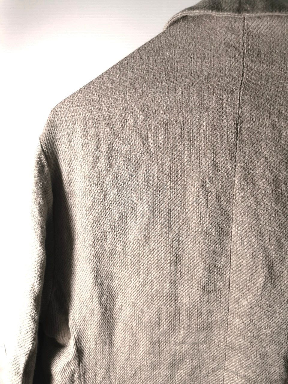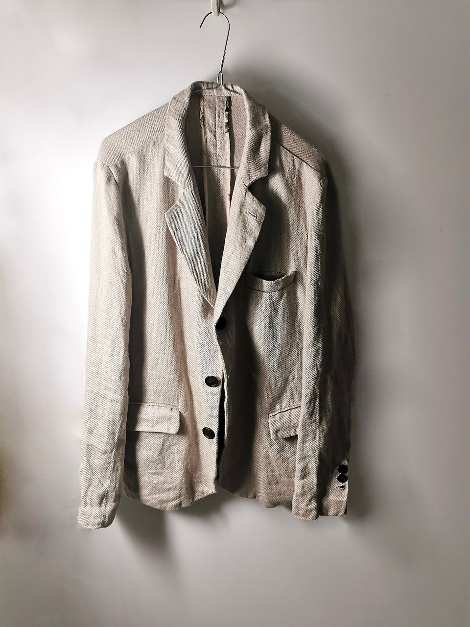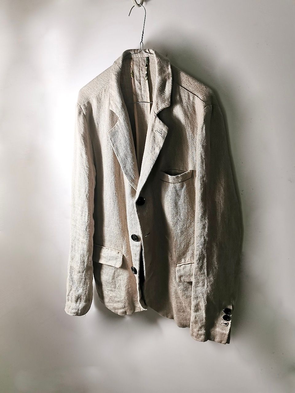 THIS super limited edition GBS Evolution IX EV9J11 hand made jacket design is one of only 5 pieces of its kind made by hand in the entire world, each exclusively from our original classic men’s single-breasted notch-lapel 3-button double-vented blazer jacket pattern from our extensive research and cut in a luxurous soft pure linen fat twill weave suiting fabric woven for us by the world's leading research fabric maker--Luigi Parisotto in Sarcedo, Vicenza--that was specially dyed and treated by hand in our world-famous GBS superworkrooms at Cavarzere Venezia using English tea leaves and a process that required over 10 hours of expert work to achieve its special colors, patina effects, shaping and softness, then combined with a beautiful partial lining story in luxurious pure silk 16 momme raso satin floral print made for us by the legendary Brenna family in Como Italy--the world's leading center for fine silk fabric creation along with pure cupro Bemberg-tipo sleeve linings woven for us by Ezio Ghiringhelli in Varese. The special piece features very special old-fashioned canvas horsehair front and collar interfacings totally hand-padstitched with over 1000 invisible hand stitches inside to give it its remarkable soft, natural roll line along lapels and collar, real working buttonhole surgeon’s sleeve cuffs, impeccable hand-cut besom flap exterior and welt breast and besom interior pockets, all handsewn hem constructions and generous 2,5 cm seam allowances on all major fitting seams to allow for ample alterations capability, extraordinary dark elegant opaque finish real horn button designs made for us by the world’s greatest living buttonmakers- Claudio and Cinzia Fontana in Parma, Italy; and no less than 10 of our signature real hand stitched buttonholes (each one required 12-16 minutes to cut and sew on the challenging cloth)... over 3 hours of work on buttonholes and buttons alone) in pure silk Bozzolo Reale Seta Milan threads. The piece is hand-signed and numbered by the designer and also features our world leading pure silk hand dyed label created exclusively for us by Mion SpA in Torreglia which is the first label in the luxury industry to completely eliminate plastic polyester yarns in it--exquisitely attached entirely by hand using pure silk threads.