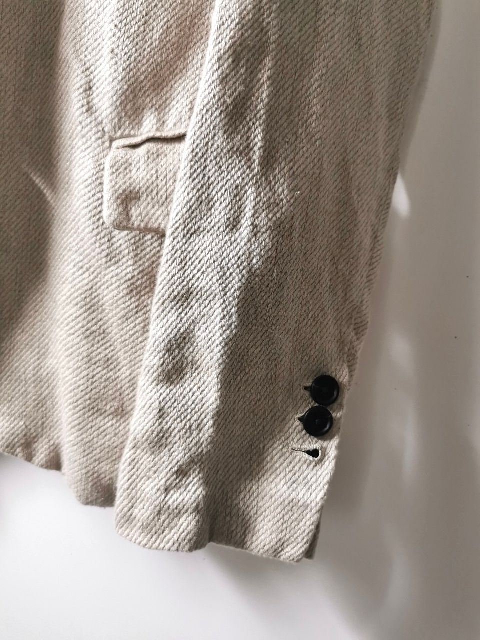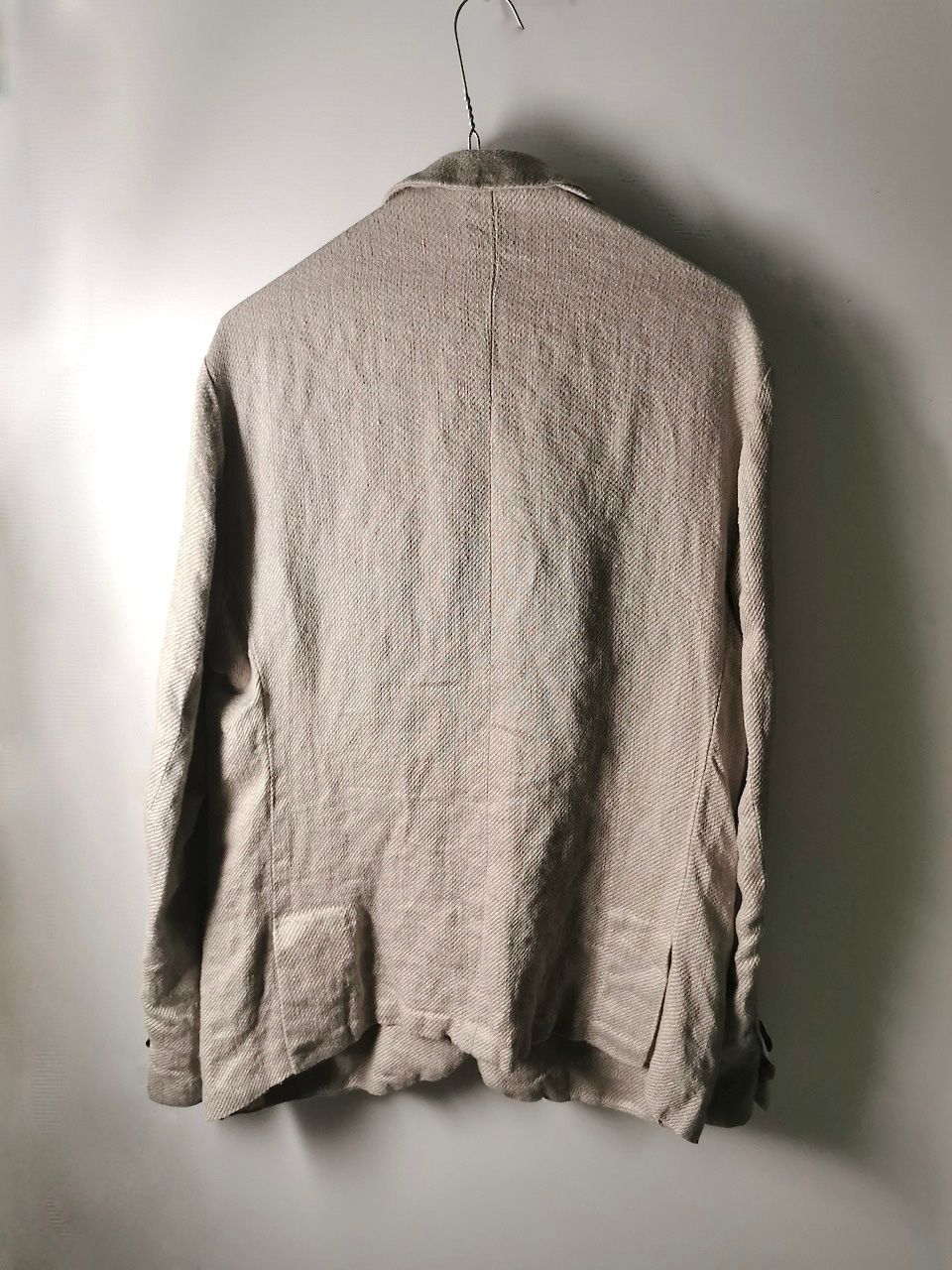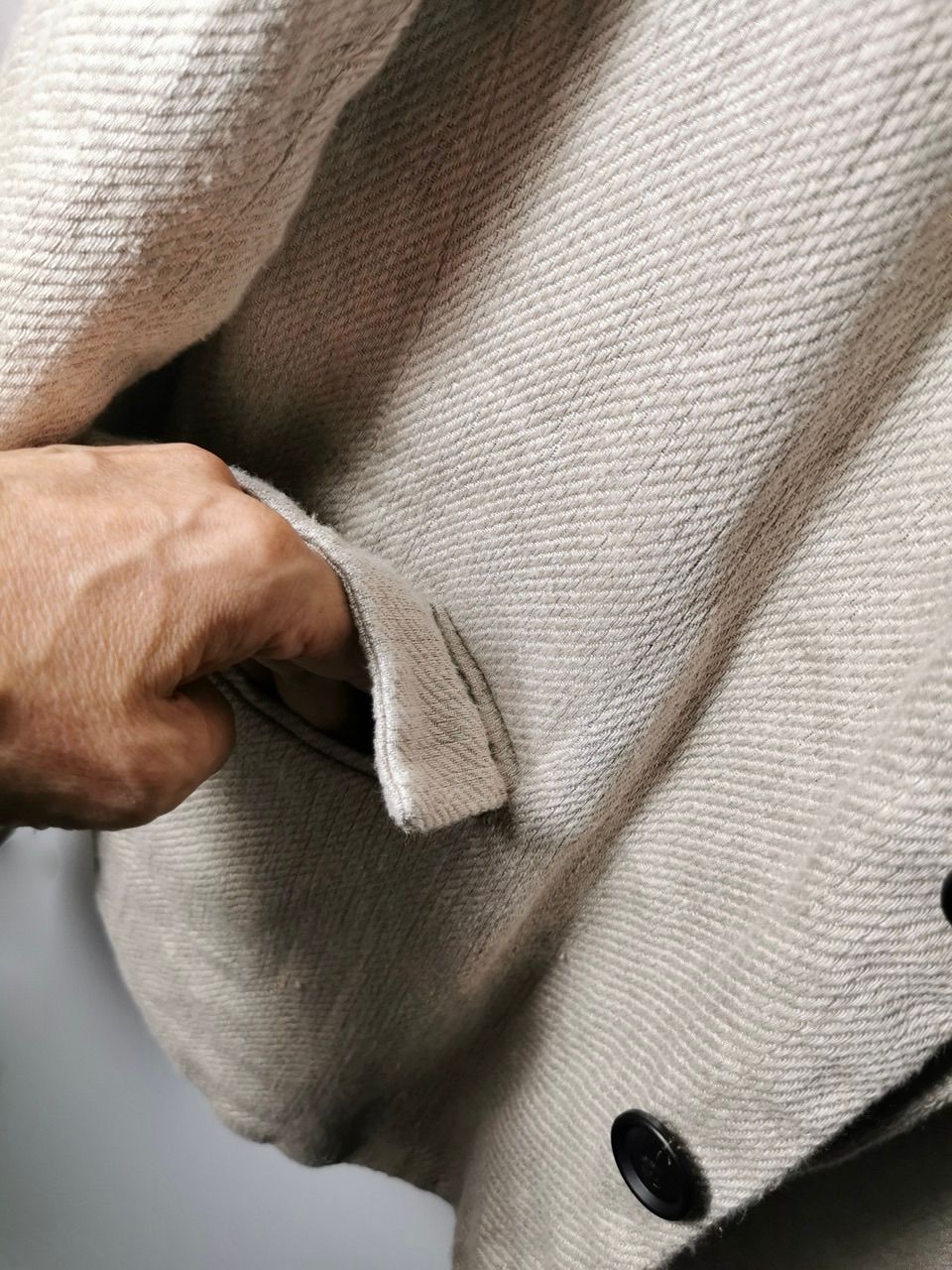 ... and incredible pockets throughout--impeccable all hand-cut besom flap exterior and welt breast and besom interior pockets which required between 20-30 minutes to expertly constuct each one fully-self lined in the expensive pure linen fabric instead of skimping and using cheaper pocket lining materials like other luxury brands do. This long-time value approach to maximum comfort and durability costs more as it uses more of the precious fabric but results in incredibly comfort when you put your hands in the pockets of this jacket.
