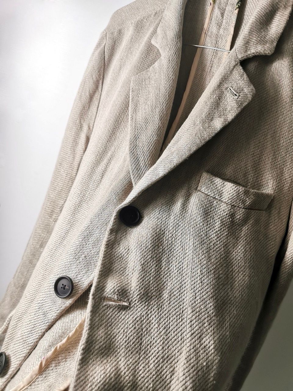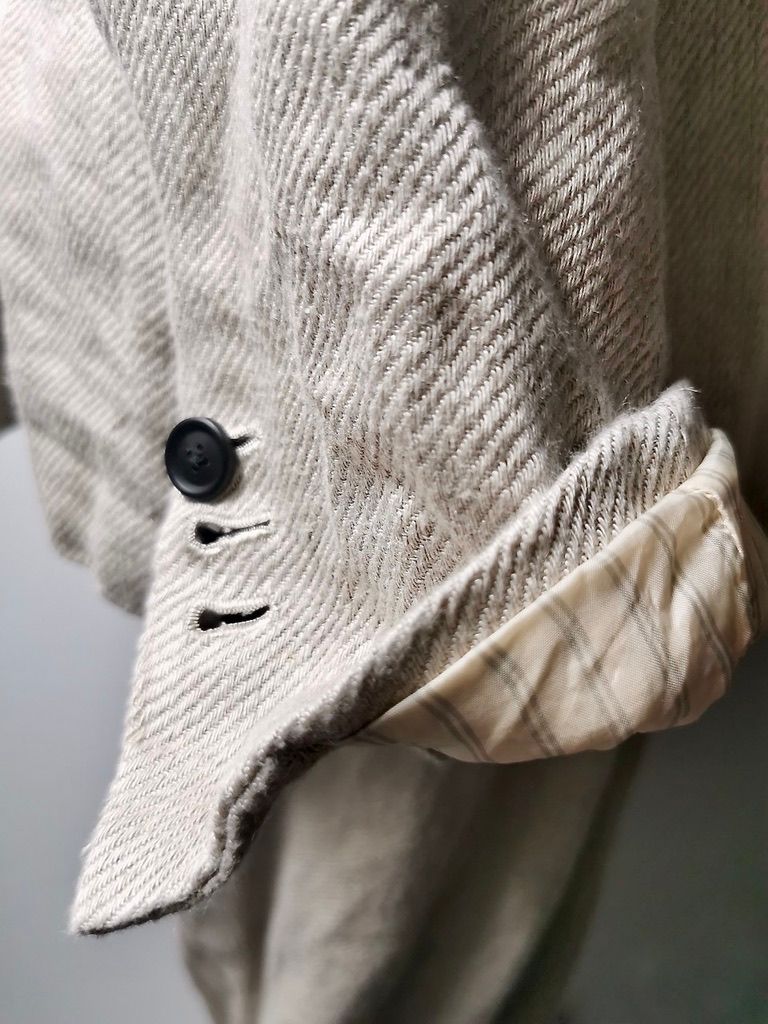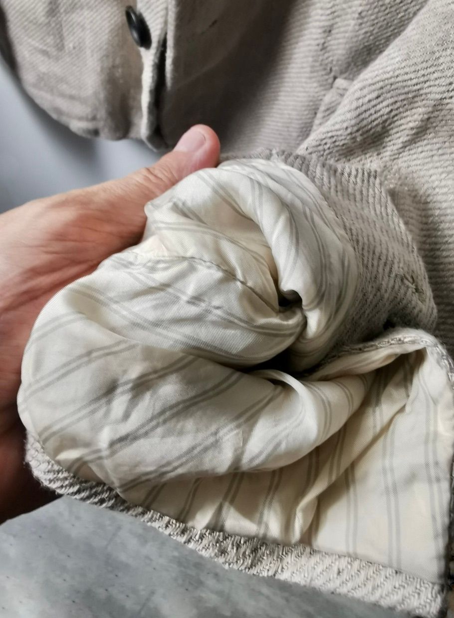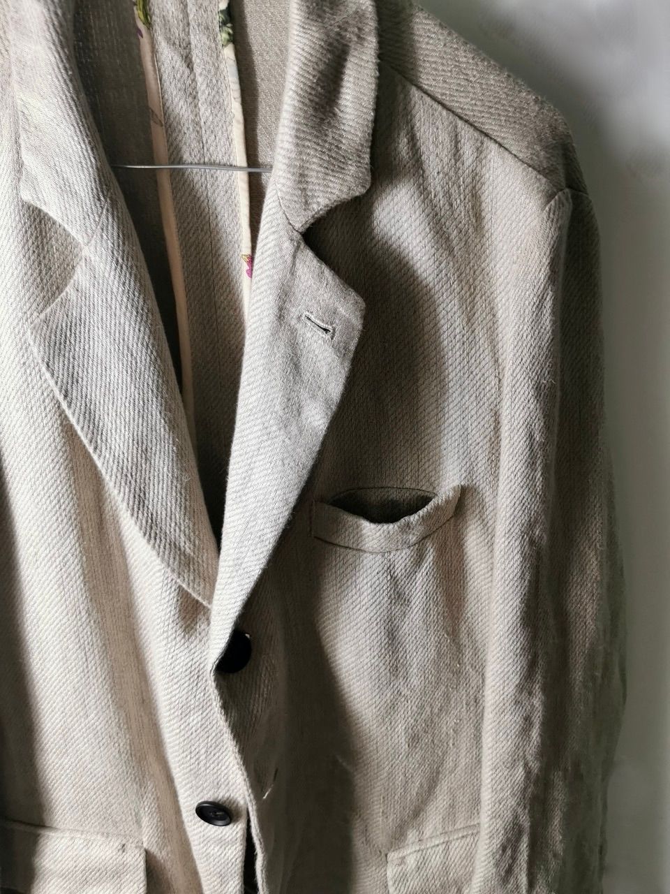 ... and incredible pockets throughout--impeccable all hand-cut besom flap exterior and welt breast and besom interior pockets which required between 20-30 minutes to expertly constuct each one fully-self lined in the expensive pure linen fabric instead of skimping and using cheaper pocket lining materials like other luxury brands do. This long-time value approach to maximum comfort and durability costs more as it uses more of the precious fabric but results in incredibly comfort when you put your hands in the pockets of this jacket.