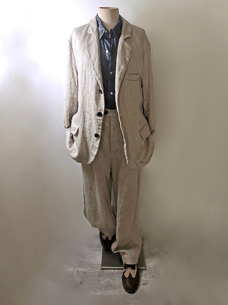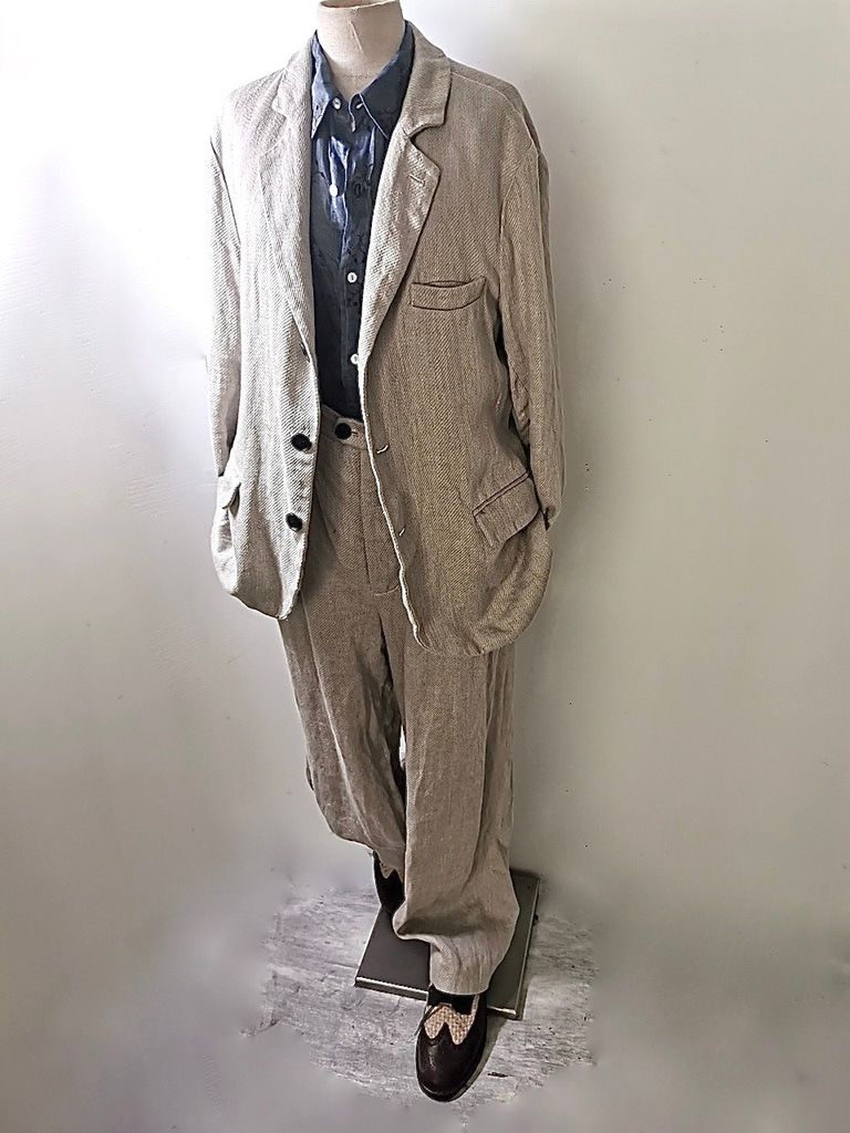 ...and cut in a luxurious soft pure linen fat twill weave suiting fabric woven for us by the world's leading research fabric maker--Luigi Parisotto in Sarcedo, Vicenza--that was specially dyed and treated by hand in our world-famous GBS superworkrooms at Cavarzere Venezia using English tea leaves and a process that required over 10 hours of expert work to achieve its special colors, patina effects, shaping and softness...