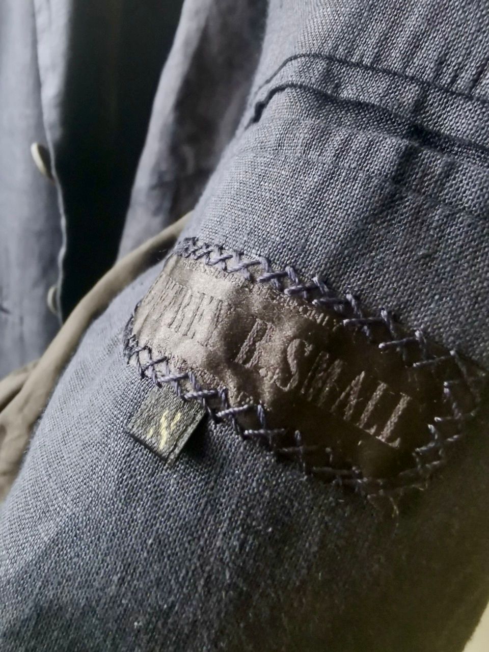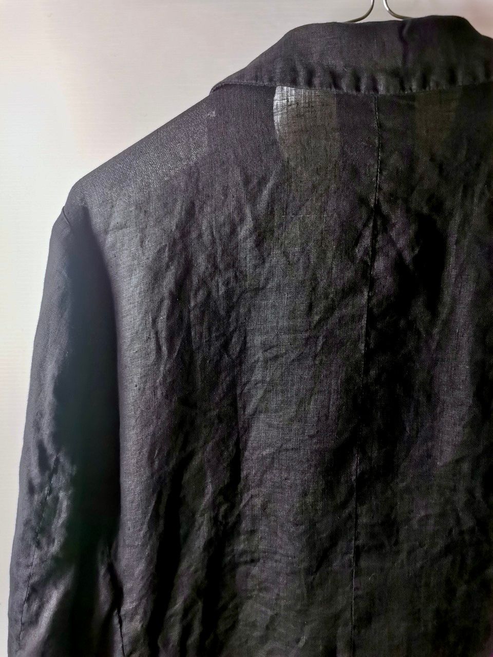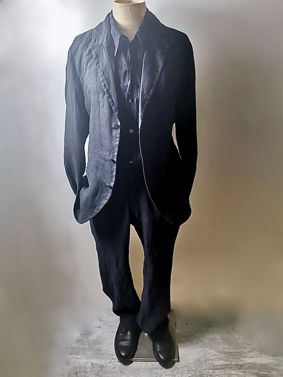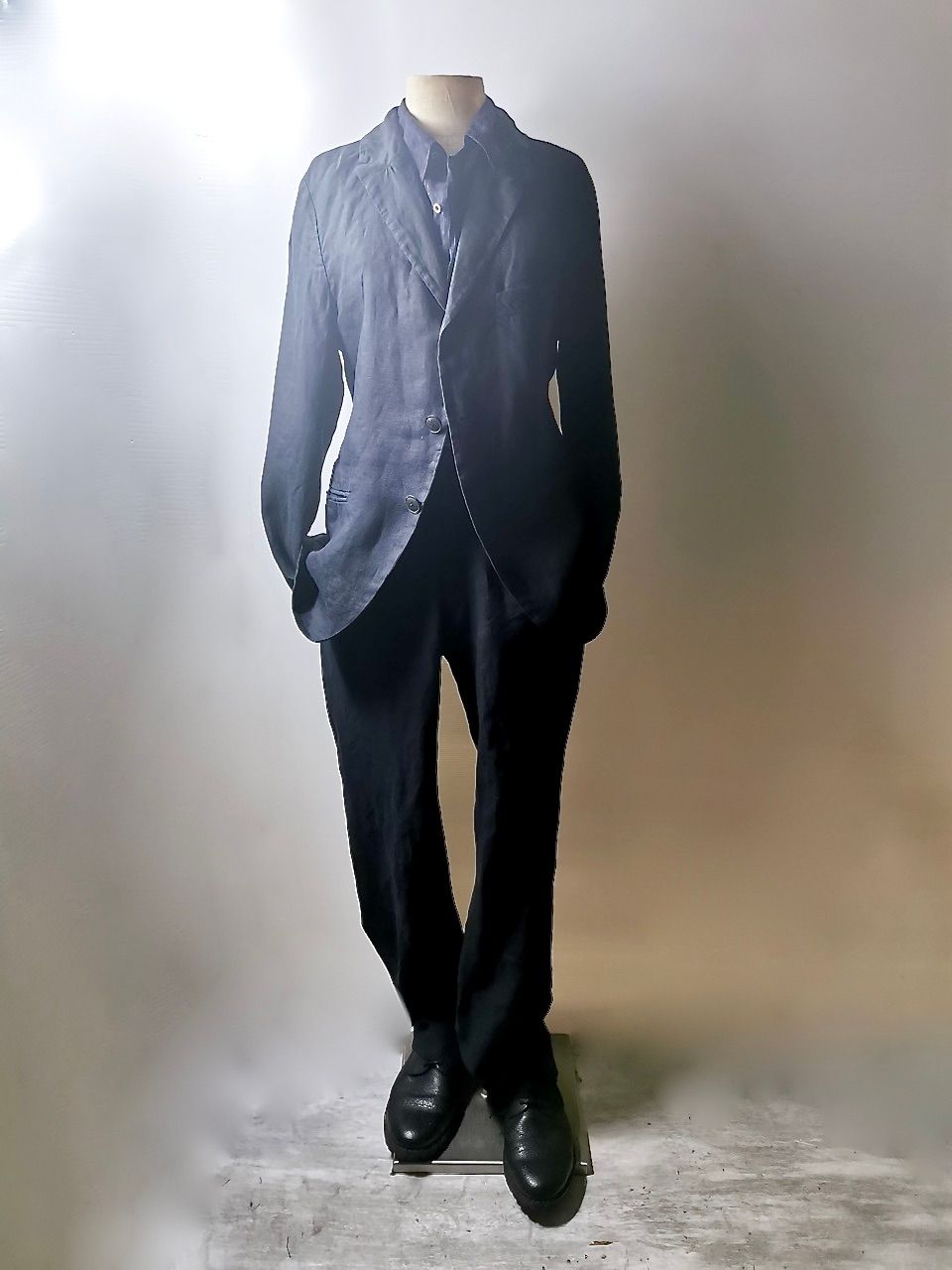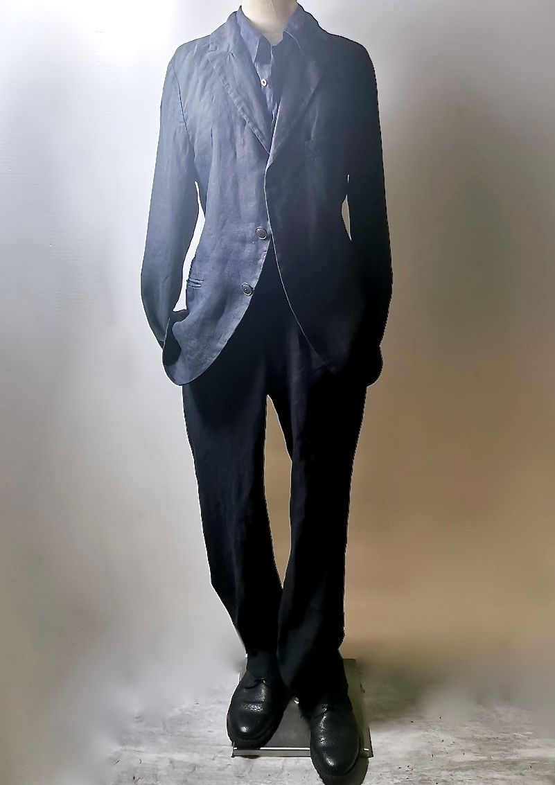 ...and cut using a luxurious "Superleggero" superlight pure handkerchief linen fabric woven for us in Varese Italy--the world's leading region for fine linen and cotton cloth production--then specially dyed by hand in our world-famous GBS Superworkrooms at Cavarzere Venezia using a process that required over 10 hours of expert work to achieve its special dark navy colors, patina effects, shaping, drape and softness....