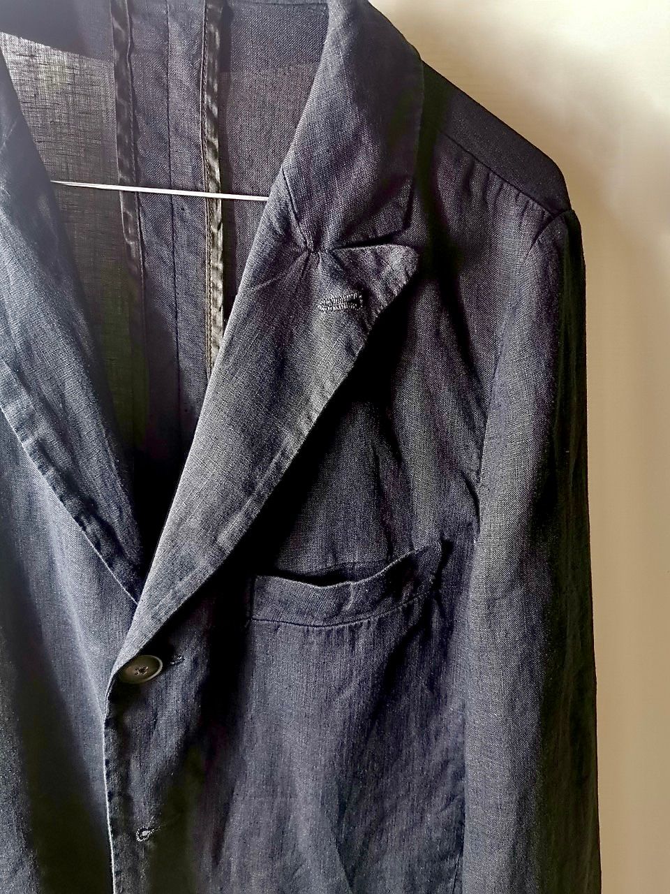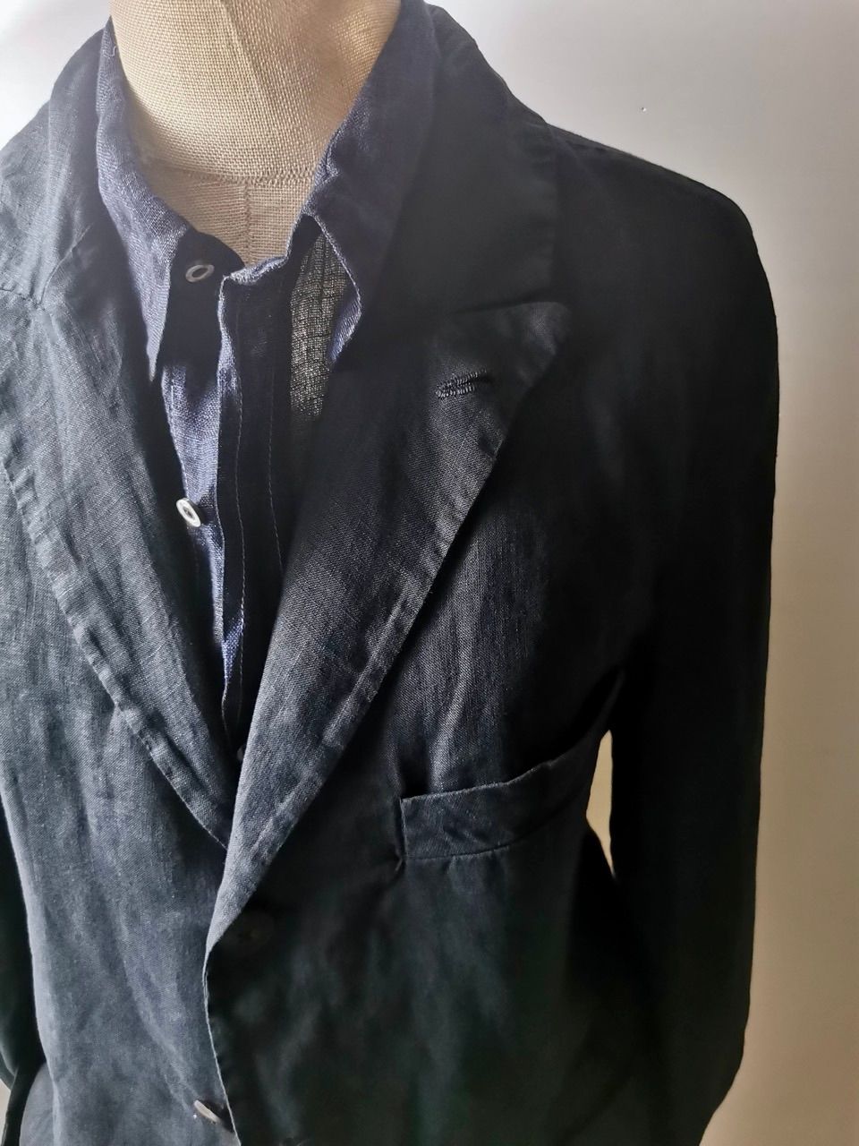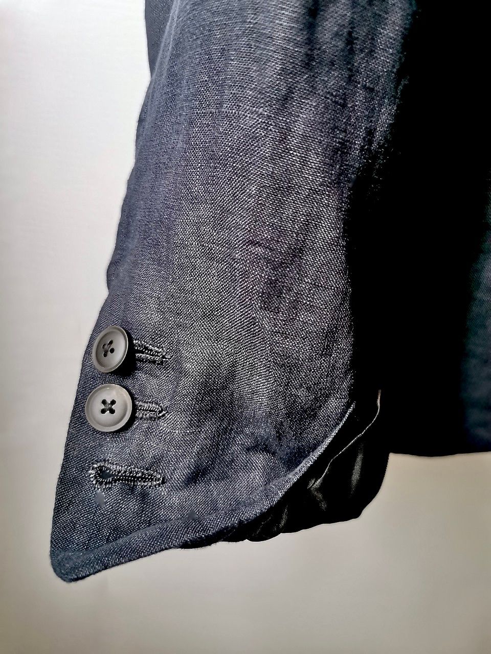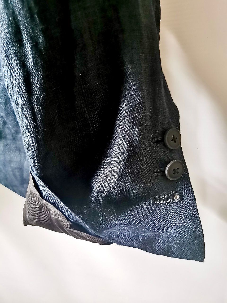 THIS super limited edition GBS Evolution IX EV9J15 handmade jacket design is one of only 5 pieces of its kind currently being made by hand in the entire world. It was created from a classic slim-fit 3-button 4-pocket front single-breasted peak lapel jacket pattern developed from our extensive tailoring research, and cut using a luxurious "Superleggero" superlight pure handkerchief linen fabric woven for us in Varese Italy--the world's leading region for fine linen and cotton cloth production--combined with an exquisite partial lining story of pure cupro Bemberg-type sleeve linings woven for us by Tessitura Mauri in Como for maximum lightness and comfort, then specially dyed by hand in our world-famous GBS Superworkrooms at Cavarzere Venezia using a process that required over 10 hours of expert work to achieve its special dark navy colors, patina effects, shaping, drape and softness. The design features real working buttonhole 3-button surgeon’s sleeve cuffs, all handcut besom, welt and interior pockets fully-self lined for maximum comfort and durability, impeccable clean-finished interior construction with beautiful Italian satin taped seam finishing and handsewn hems throughout, advanced artisanal "gommatizzato" finely rubberized finish real horn button designs created only for us by the world’s greatest living buttonmakers--Claudio and Cinzia Fontana in Parma Italy--and no less than 10 of our signature real hand stitched buttonholes (each one required 10-12 minutes to cut and sew, over 2 hours of expert and painstaking work on buttonholes and buttons alone for the single jacket) in luxurious pure silk Bozzolo Reale Milano Seta thread, and is handsigned and numbered by the designer. The piece also features our world leading hand dyed pure silk label created exclusively for us by Mion SpA in Torreglia- the first label in the luxury industry to completely eliminate plastic polyester yarns in it--beautifully attached entirely by hand using pure silk threads.