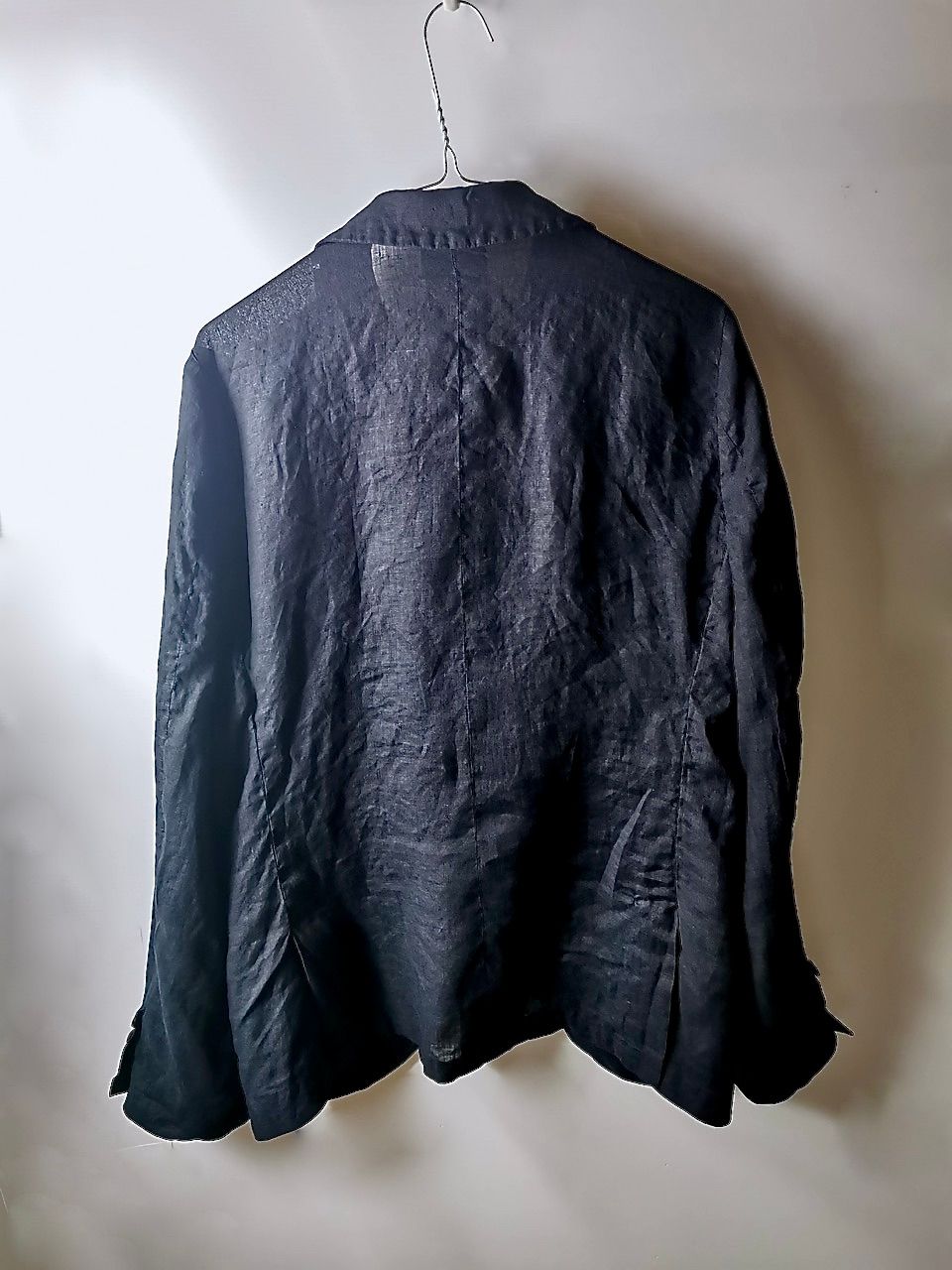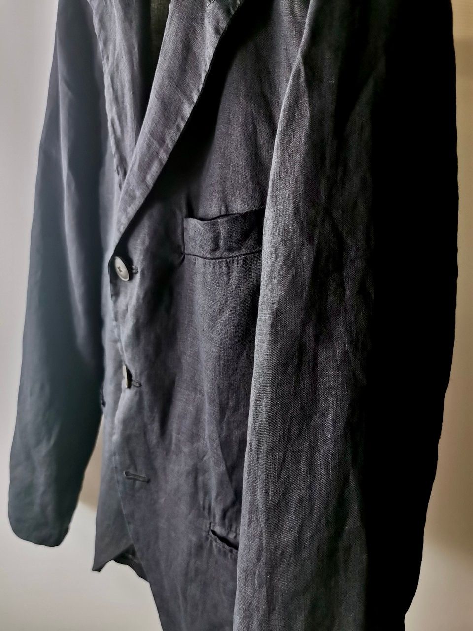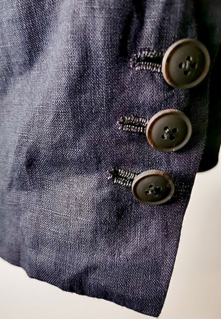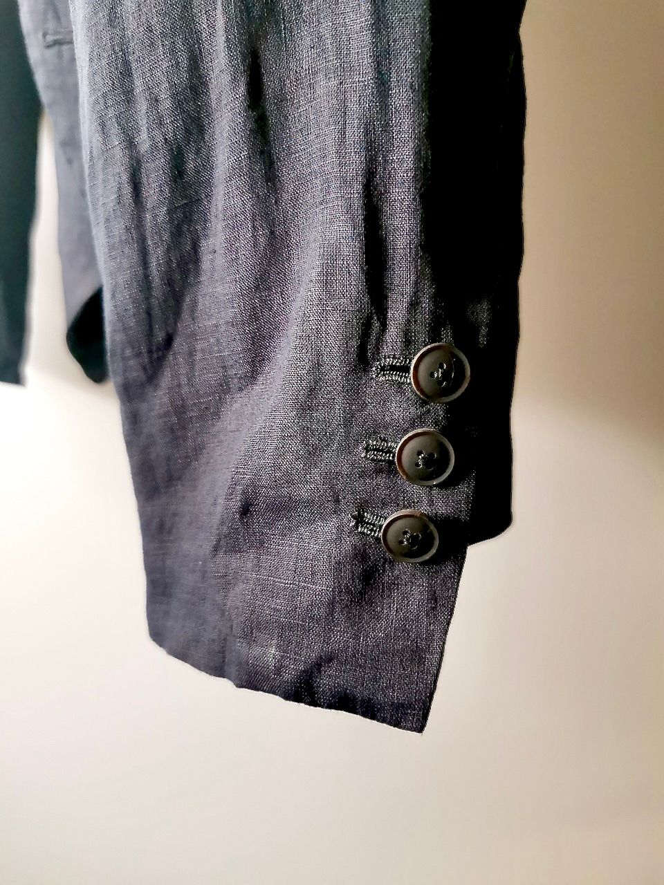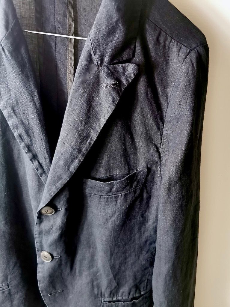 THIS super limited edition GBS Evolution IX EV9J15 handmade jacket design is one of only 5 pieces of its kind currently being made by hand in the entire world. It was created from a classic slim-fit 3-button 4-pocket front single-breasted peak lapel jacket pattern developed from our extensive tailoring research, and cut using a luxurious "Superleggero" superlight pure handkerchief linen fabric woven for us in Varese Italy--the world's leading region for fine linen and cotton cloth production--combined with an exquisite partial lining story of pure cupro Bemberg-type sleeve linings woven for us by Tessitura Mauri in Como for maximum lightness and comfort, then specially dyed by hand in our world-famous GBS Superworkrooms at Cavarzere Venezia using a process that required over 10 hours of expert work to achieve its special dark navy colors, patina effects, shaping, drape and softness. The design features real working buttonhole 3-button surgeon’s sleeve cuffs, all handcut besom, welt and interior pockets fully-self lined for maximum comfort and durability, impeccable clean-finished interior construction with beautiful Italian satin taped seam finishing and handsewn hems throughout, advanced artisanal "gommatizzato" finely rubberized finish real horn button designs created only for us by the world’s greatest living buttonmakers--Claudio and Cinzia Fontana in Parma Italy--and no less than 10 of our signature real hand stitched buttonholes (each one required 10-12 minutes to cut and sew, over 2 hours of expert and painstaking work on buttonholes and buttons alone for the single jacket) in luxurious pure silk Bozzolo Reale Milano Seta thread, and is handsigned and numbered by the designer. The piece also features our world leading hand dyed pure silk label created exclusively for us by Mion SpA in Torreglia- the first label in the luxury industry to completely eliminate plastic polyester yarns in it--beautifully attached entirely by hand using pure silk threads.