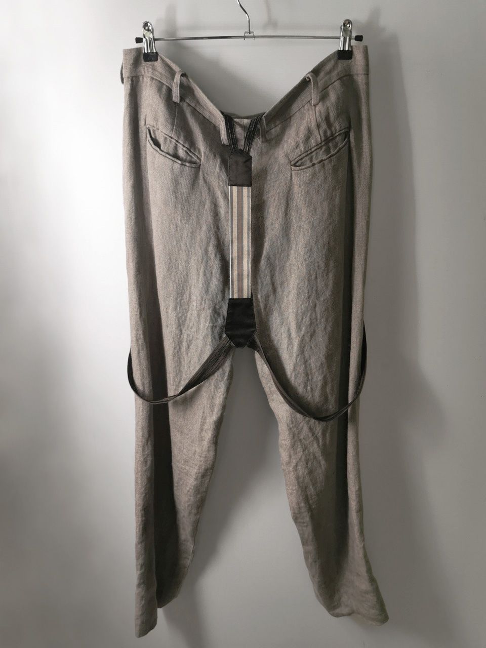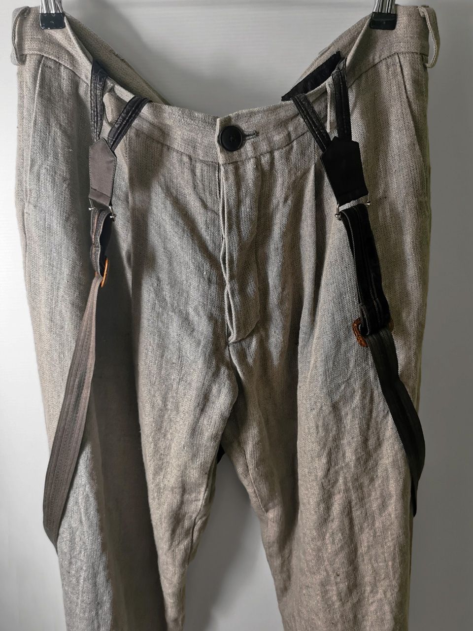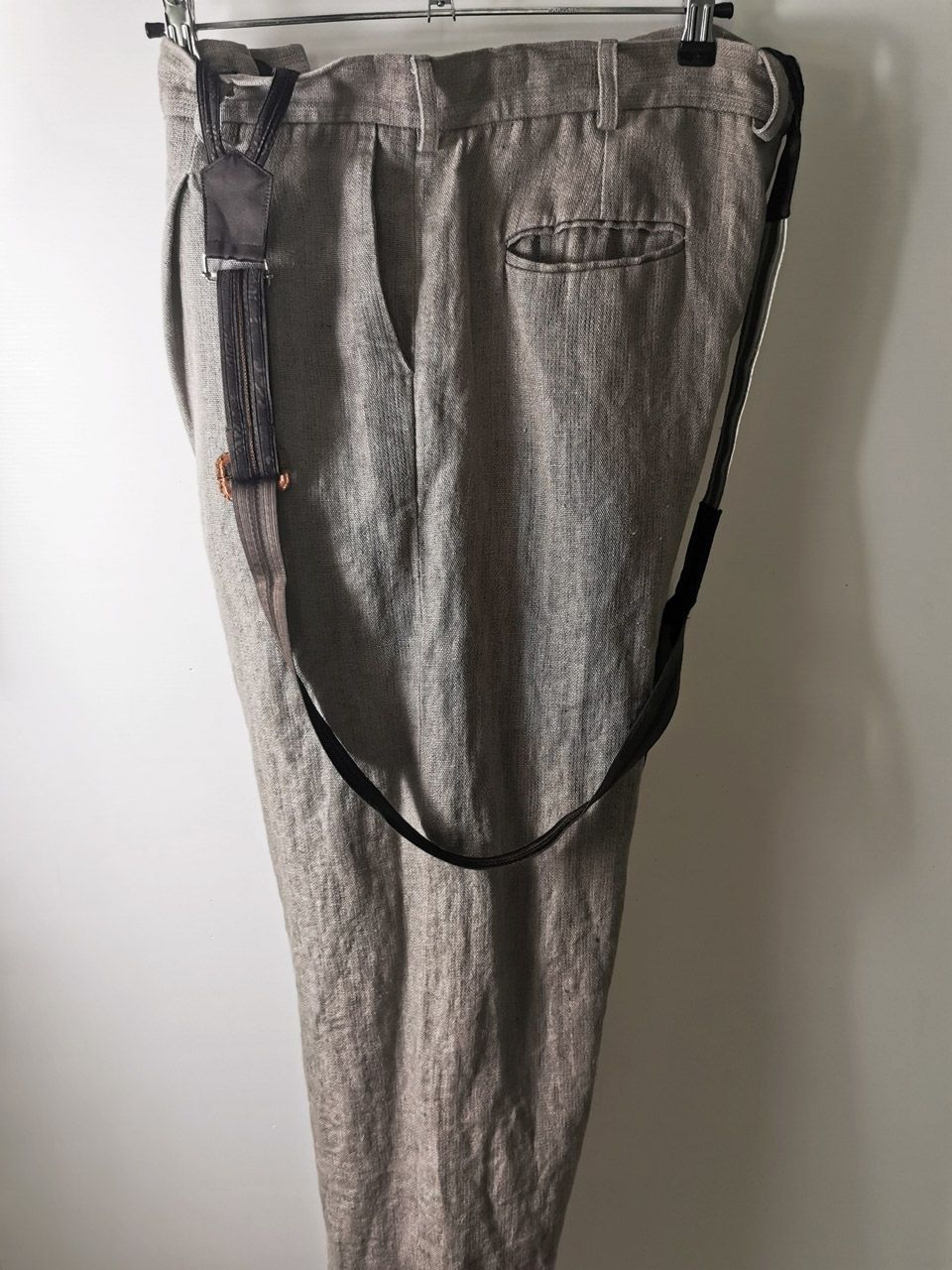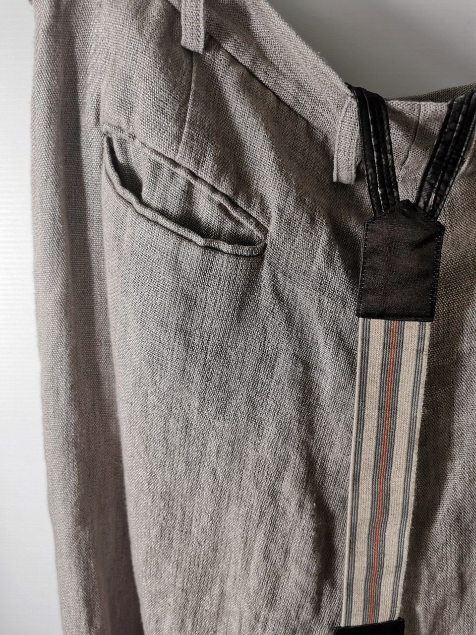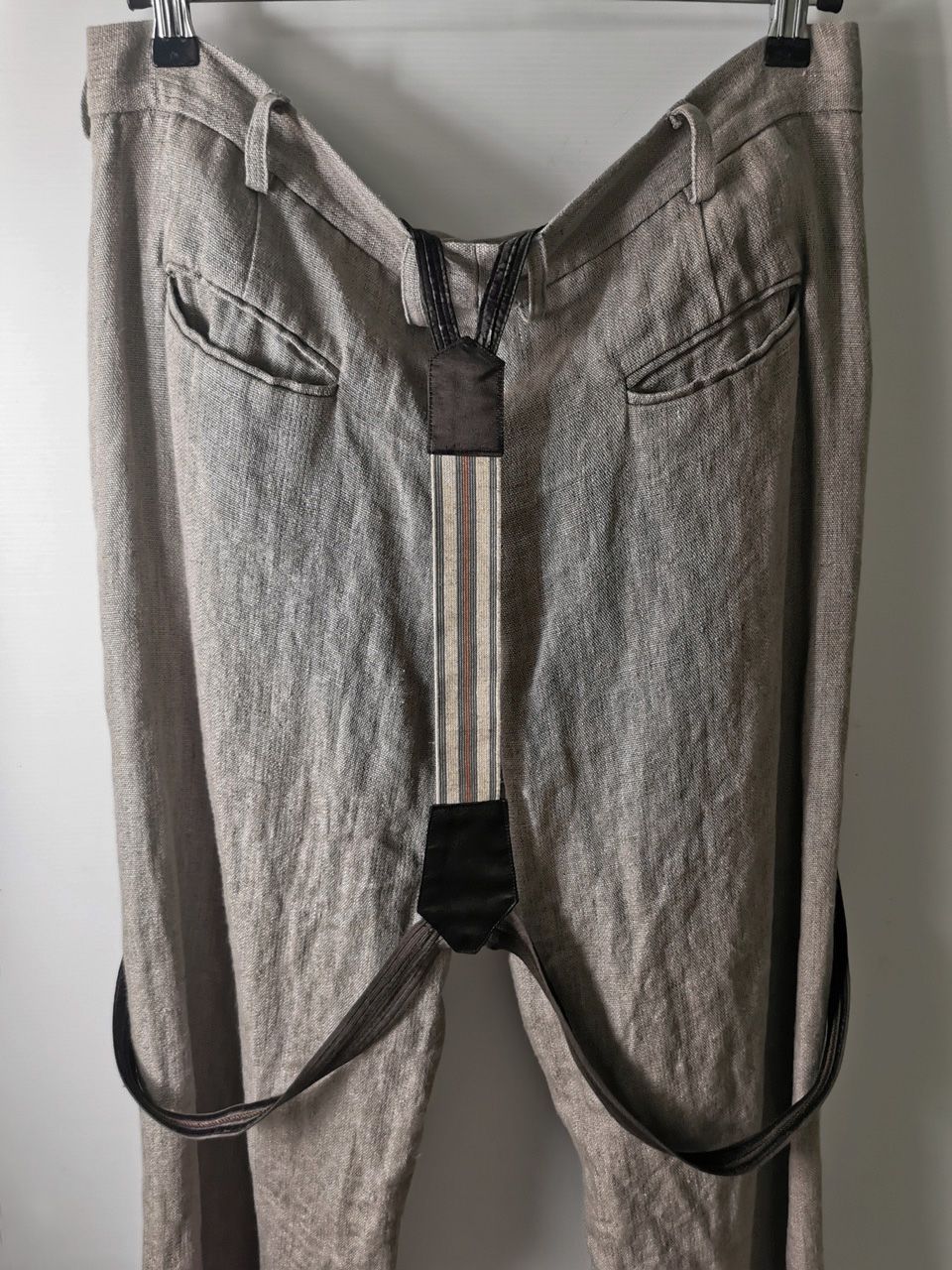 This super limited edition GBS Evolution IX EV9P09 extreme handmade suspender trouser design is one of only 5 pieces of its kind made by hand in the entire world. It was created from a classic tailored single pleated tapered leg trouser pattern from our extensive tailoring research, and cut using an all new pure linen tick stripe weave midweight luxury suiting cloth woven only for us by the world’s leading research fabric maker--Luigi Parisotto in Sarcedo Vicenza--combined with exquisite yarn-dyed striped pure cupro Bemberg-type linings made specially for us by Ezio Ghiringhelli in Varese, then specially dyed by hand in our world-famous GBS Superworkrooms at Cavarzere Venezia using a process that required over 10 hours of expert work to achieve its unique colors, patina effects, shaping, hearty feel and softness...