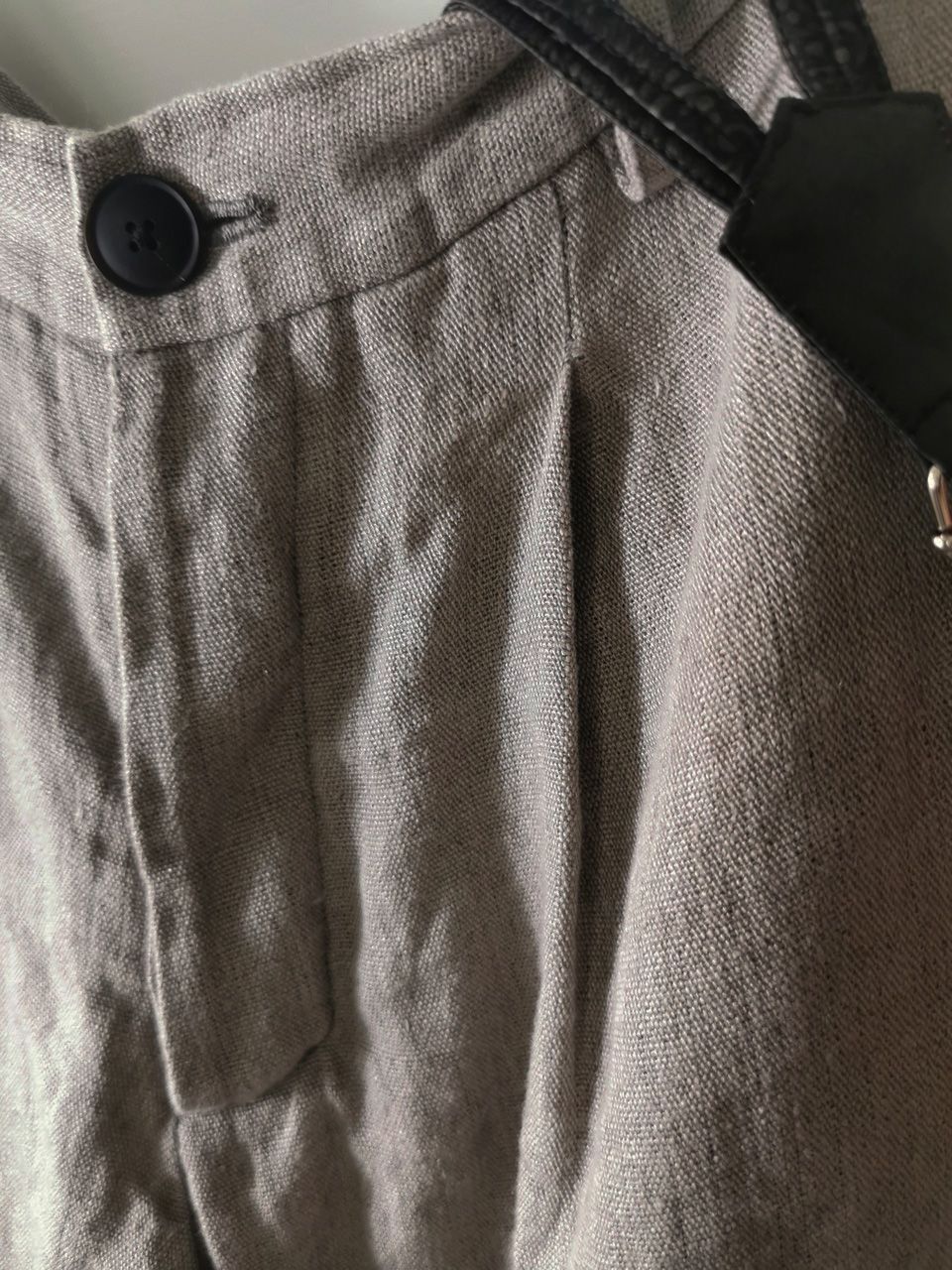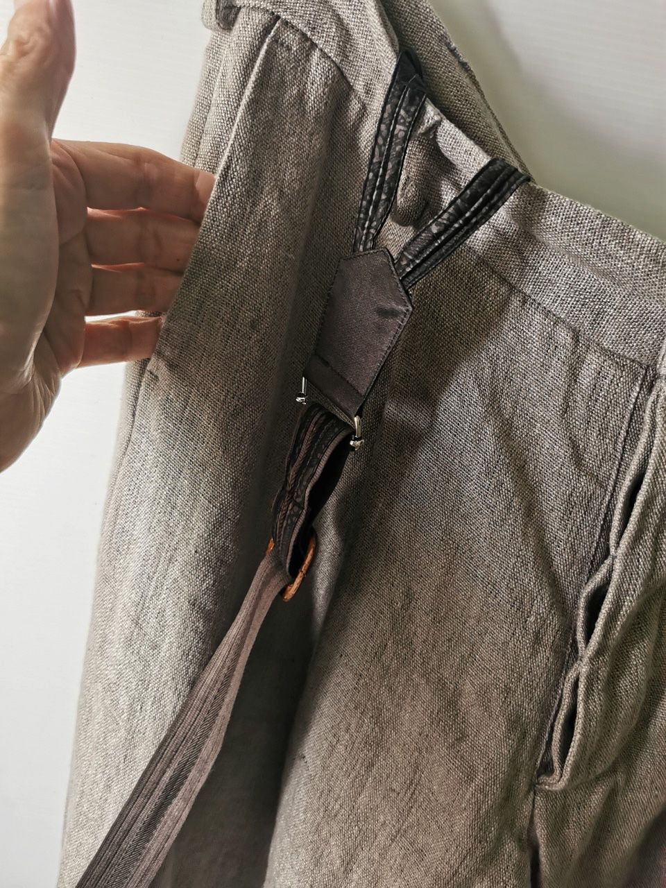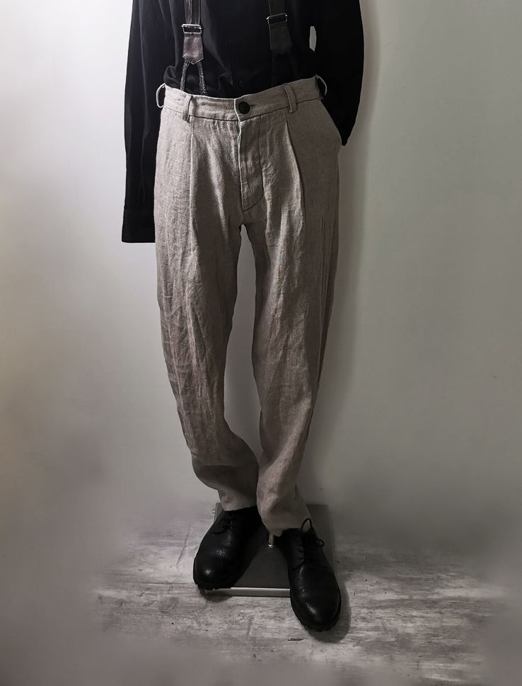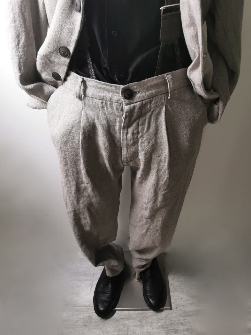 This super limited edition GBS Evolution IX EV9P09 extreme handmade suspender trouser design is one of only 5 pieces of its kind made by hand in the entire world. It was created from a classic tailored single pleated tapered leg trouser pattern from our extensive tailoring research, and cut using an all new pure linen tick stripe weave midweight luxury suiting cloth woven only for us by the world’s leading research fabric maker--Luigi Parisotto in Sarcedo Vicenza--combined with exquisite yarn-dyed striped pure cupro Bemberg-type linings made specially for us by Ezio Ghiringhelli in Varese, then specially dyed by hand in our world-famous GBS Superworkrooms at Cavarzere Venezia using a process that required over 10 hours of expert work to achieve its unique colors, patina effects, shaping, hearty feel and softness...