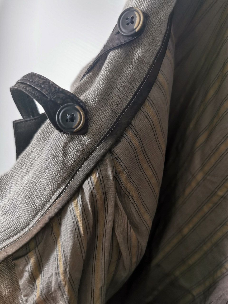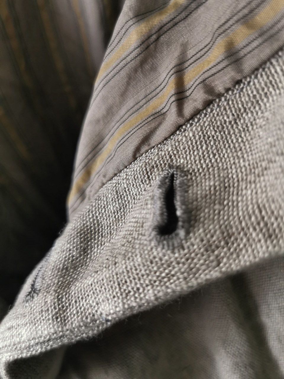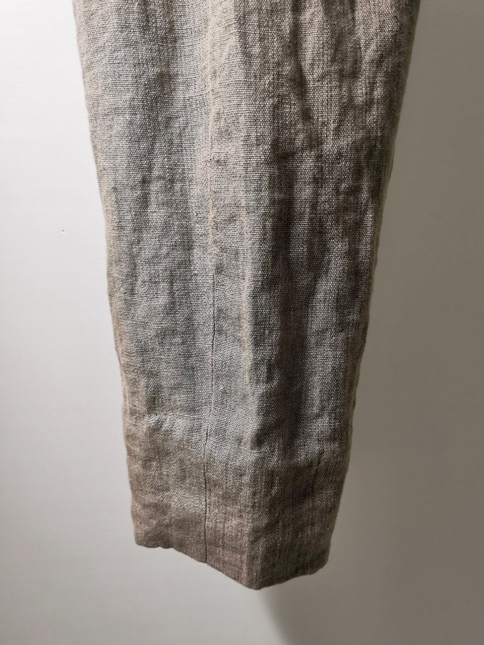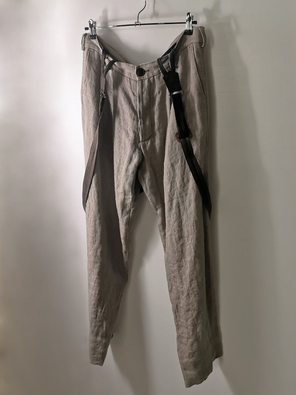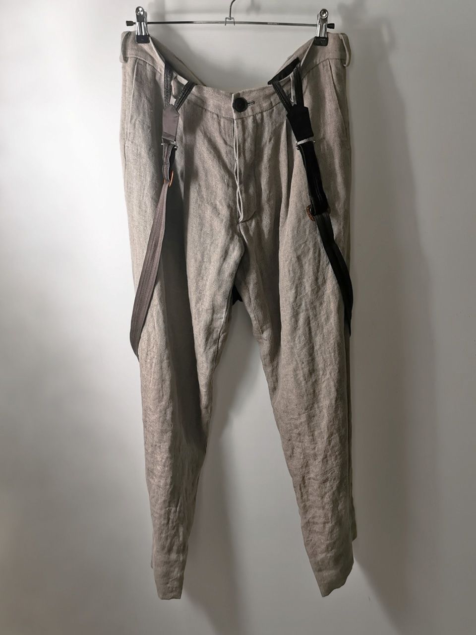 This super limited edition GBS Evolution IX EV9P09 extreme handmade suspender trouser design is one of only 5 pieces of its kind made by hand in the entire world. It was created from a classic tailored single pleated tapered leg trouser pattern from our extensive tailoring research, and cut using an all new pure linen tick stripe weave midweight luxury suiting cloth woven only for us by the world’s leading research fabric maker--Luigi Parisotto in Sarcedo Vicenza--combined with exquisite yarn-dyed striped pure cupro Bemberg-type linings made specially for us by Ezio Ghiringhelli in Varese, then specially dyed by hand in our world-famous GBS Superworkrooms at Cavarzere Venezia using a process that required over 10 hours of expert work to achieve its unique colors, patina effects, shaping, hearty feel and softness...